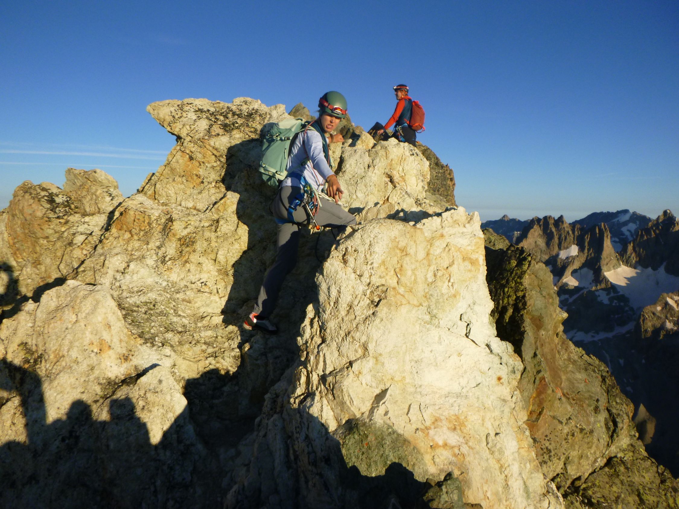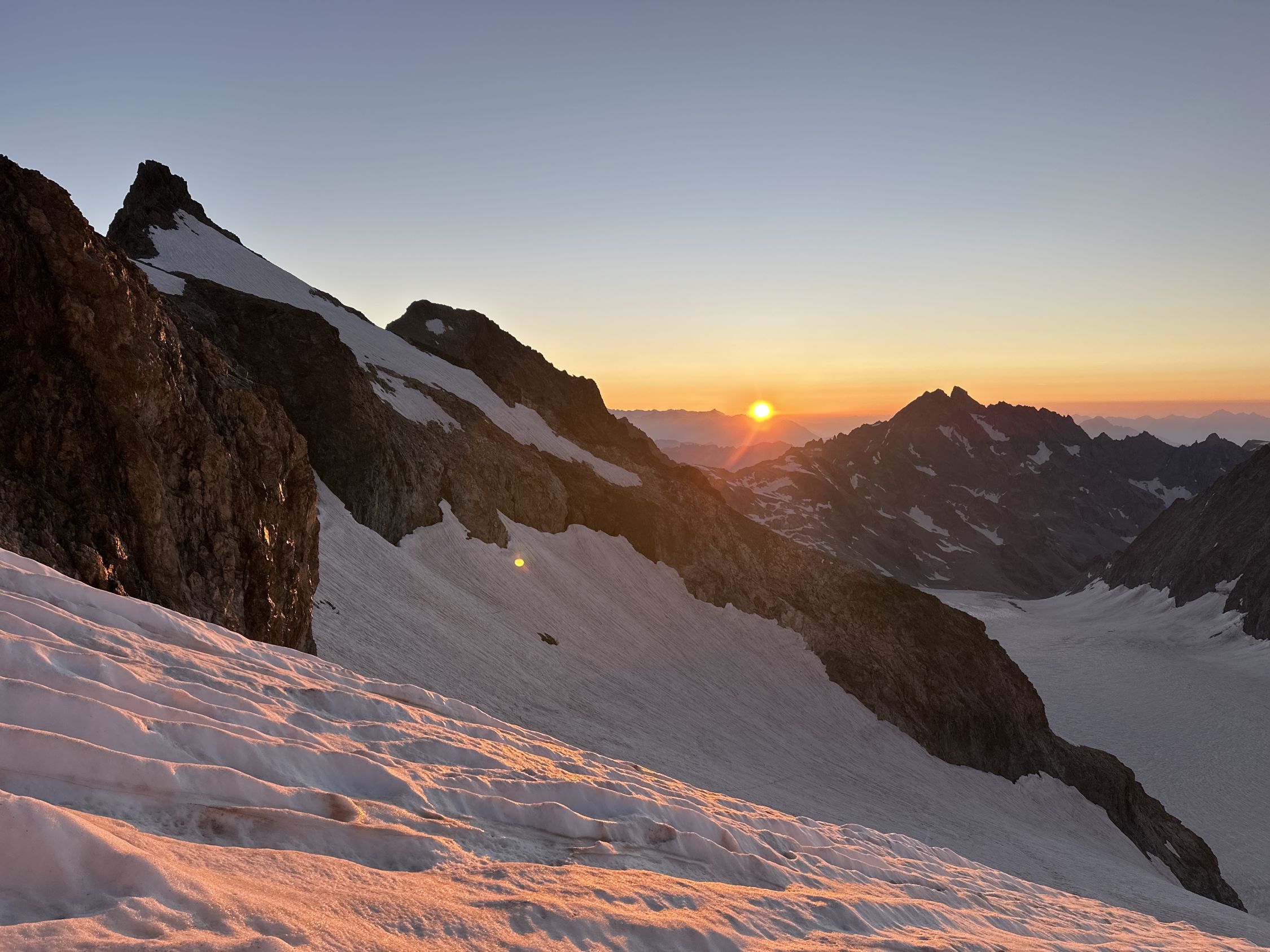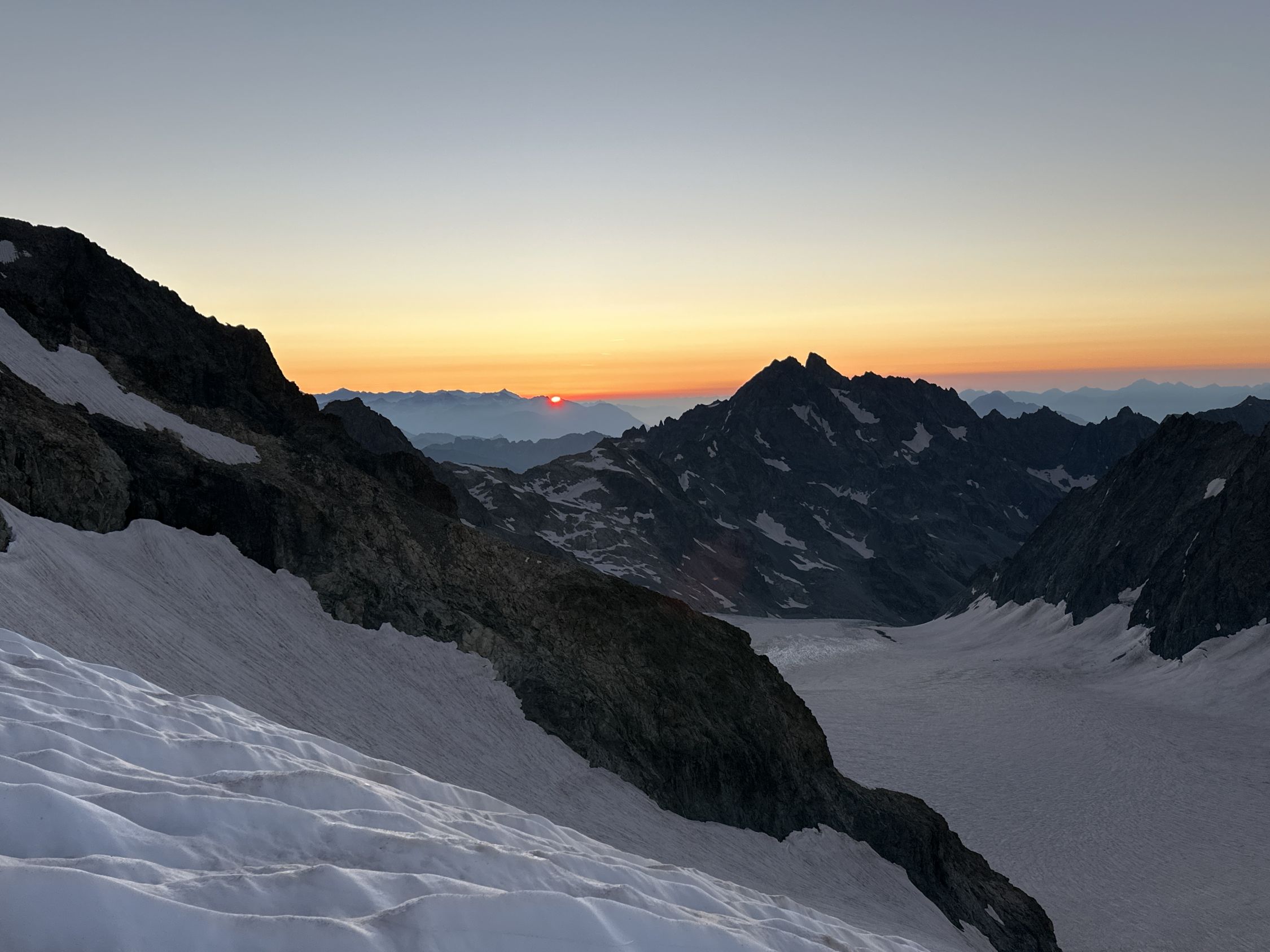 Tourenbeginn um 04:10 Uhr bei 18°C und warmer Bise ab Refuge des Écrins. Im unteren Firnbereich nach dem Abzweig auf dem Gletscher waren keine Trittspuren erkennbar aufgrund der Sonneneinstrahlung. Bei gestriger Tour zum Dôme de Neige des Écrins sah ich hinüber zum Roche Faurio im Norden einige Tourengänger, so dass ich mich orientieren konnte für den Folgetag. Beim Routen-Abzweig auf dem Gletscher baute ich auf dem Rückweg vom Dôme gestern aus Eisabbruch-Material einen Eismann, so dass ich diesen heute morgen im Stirnlampenlicht problemlos widerfand, ohne den passenden Abzweig suchen zu müssen. Der Ostgrat war schneefrei.