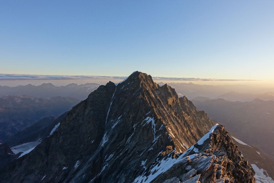 Top Verhältnisse am Täschhorn. Aufstieg zum Biwak von der Täschalpe via Weingartengletscher. Soweit wie möglich über Schutt u. Geröll in Richtung des Felsriegels aufsteigen. Unterhalb des Riegels befindet sich ein Plateau. Hier den Wegspuren folgend soweit wie möglich nach links queren und dann rechts haltend auf Wegspuren aufwärts zum Gletscher (keine Kletterei nötig). Dort Steinmann. Die Bruchzone unten haben wir links (orografisch rechts) in Richtung seitliche Felswand ausholend umgangen. Spalten im Übrigen noch weitgehend zu oder fast zu und daher mit der gebotenen Vorsicht gut zu überqueren. Gletscher wie in der Literatur beschrieben allerdings sehr spaltenreich. Grat selbst praktisch komplett trocken u. problemlos zu begehen. Im ersten Viertel (bis hinter dem sog. Zipfelmützenturm) zahlreiche Wegspuren u. Steinmänner. Z. T. wird etwas in die Flanke ausgewichen, aber nicht zu weit. Im Zweifel zum Grat hin orientieren, da das Gelände in den Flanken schnell extrem brüchig bzw. bröselig wird. Eindrucksvolle Reste der großen Wächte unterhalb des Gipfelaufbaus sind vorhanden, unter denen aber problemlos auf trockenem Pfad gequert werden kann. Im Übrigen nur noch zwei kleinere Schneereste, die unproblematisch waren (mit vorhandenen Tritten in unserem Fall nicht einmal Steigeisen nötig, früh morgens aber dennoch angenehm). Am Gipfelaufbau zunächst auf etwas unangenehmem losen / schuttigen Gelände gerade hoch, bevor die Gipfelflanke nach rechts oben hin auf Wegspuren traversiert wird. Dann am Grat unproblematisch weiter zum Gipfel. Traverse zum Dom sah gut aus (Bild anbei) und wurde gestern auch gemacht, stand für uns aber nicht auf dem Plan.