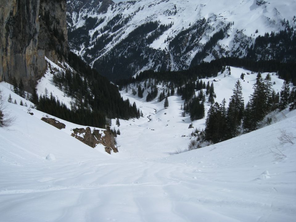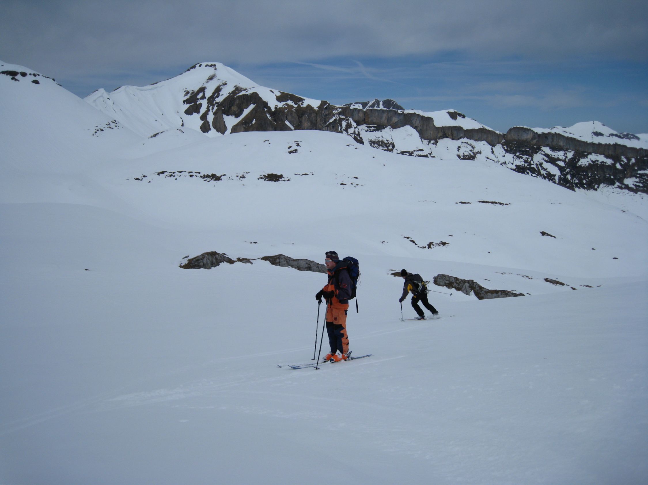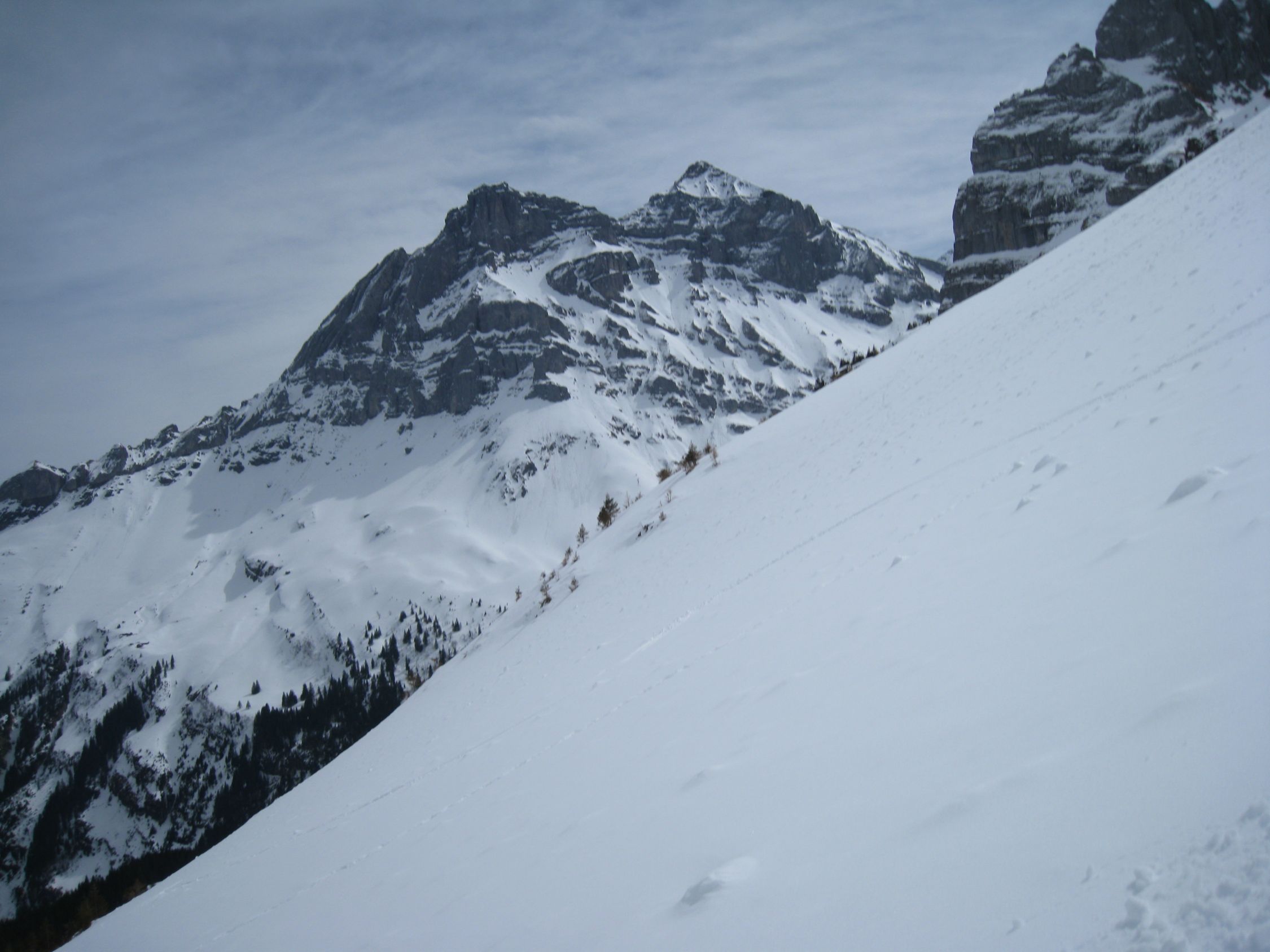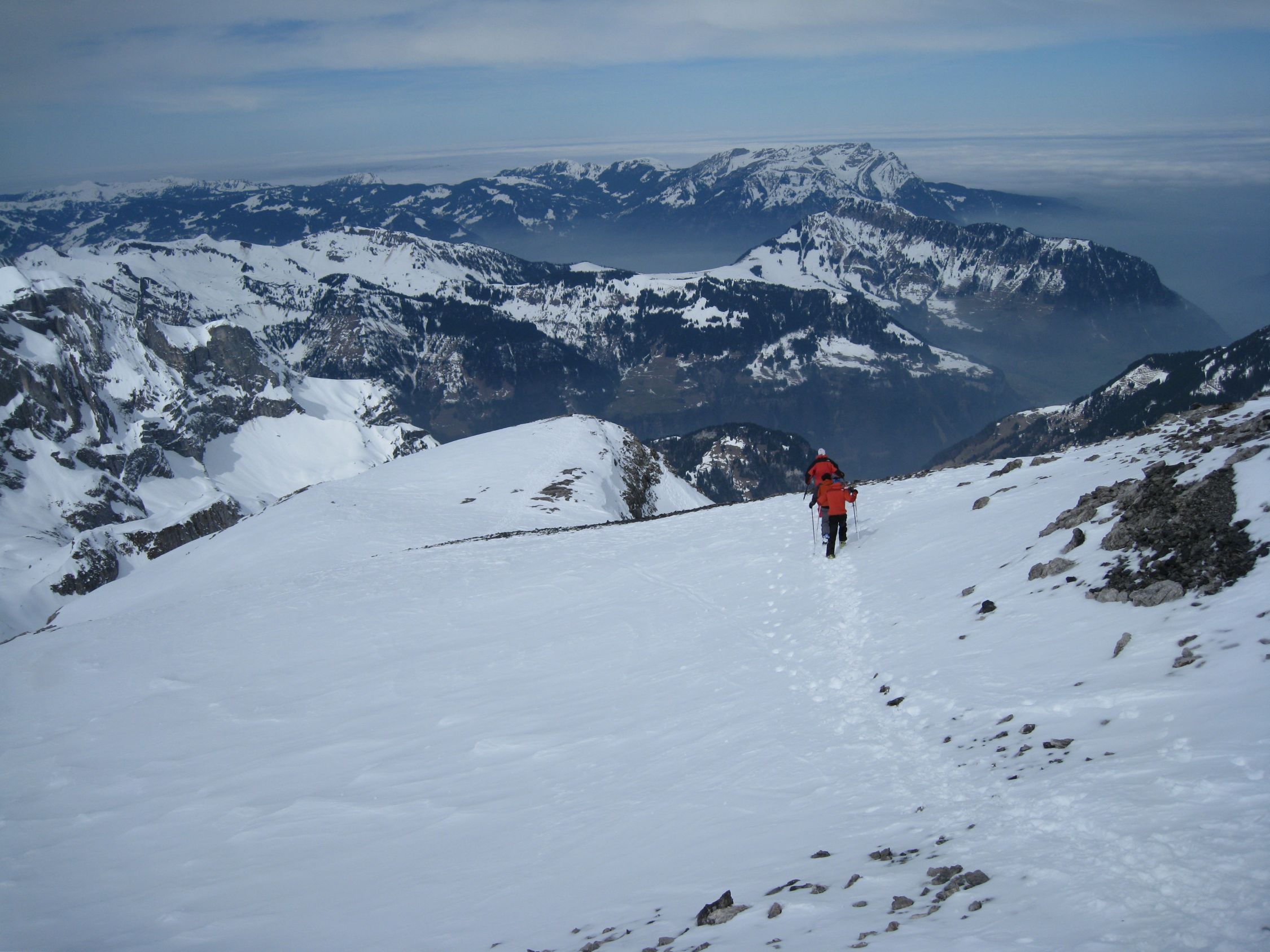 Von St.Jakob bis Alt Rüti auf tragender Schneedecke.Durch den Gatterwald nach Gossalp auf Nassschnee. In der Mulde nach Oberalp, bis unters Schoneggli auf gefrorenem Schnee. Übers Schoneggli auf pulveriger "Tschollenschnee" abwechselnd mit tragender Unterlage. Durch die Mulde bis zur Schlüsselstelle am Gipfelhang lockerer Pulverschnee. Skis ein paar Meter über einen felsdurchsetzten Aufschwung getragen, wieder montiert und weiter auf den Ruchstock Gipfel. Zaghaft setzten sich die ersten Sonnenstrahlen durch.Mächtige Föhnwalze im Süden. Auf dem Ruchstock waren heute neben uns nur noch 5 Personen. Abfahrt durchs Schöntal im oberer Teil auf schönem Sulz, weiter unten ab Oberalp, schwerer Nassschnee. Auf der Waldstrasse nach St. Jakob zurück