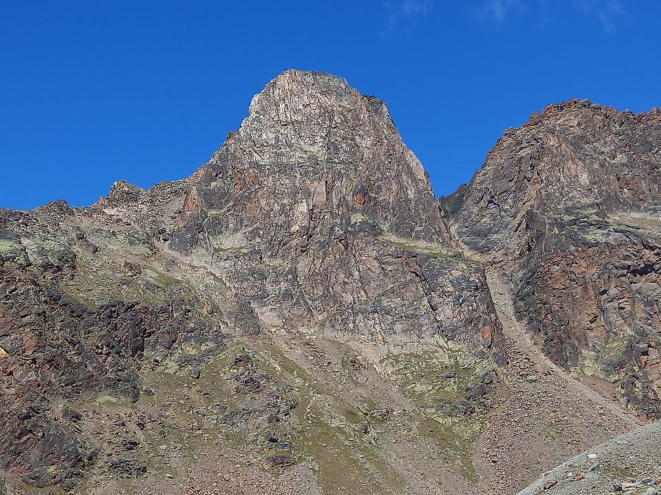 Start um 9:50 auf Kreuzboden bei eitlem Sonnenschein, hurtig das Weglein hoch zur Abzweigung, wo sich Bergweg und Klettersteig trennen. Hier beschlichen yours truly Zweifel ob der Machbarkeit des Unterfangens: der oberste Teil zum Gipfel sah eher krass aus. Aber irgendwie müssen ja die Klettersteigler auf diesem Weg herunterkommen, also Augen zu und weiter. Zuerst steiler Bergweg, ab Sattel dann sehr blockig, aber immer gut zu kraxeln und gut markiert. Nie ausgesetzt. Abstieg auf gleicher Route. Im Aufstieg niemanden angetroffen, die Route wird wohl fast nur als Abstieg vom Klettersteig genutzt. Boxenstopp in der nahegelegenen Weissmieshütte, Aprikosenkuchen empfehlenswert. Fazit: vergnügliche und lohnende Kurztour mit sehr alpinem Flair, hat Spass gemacht.