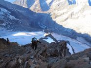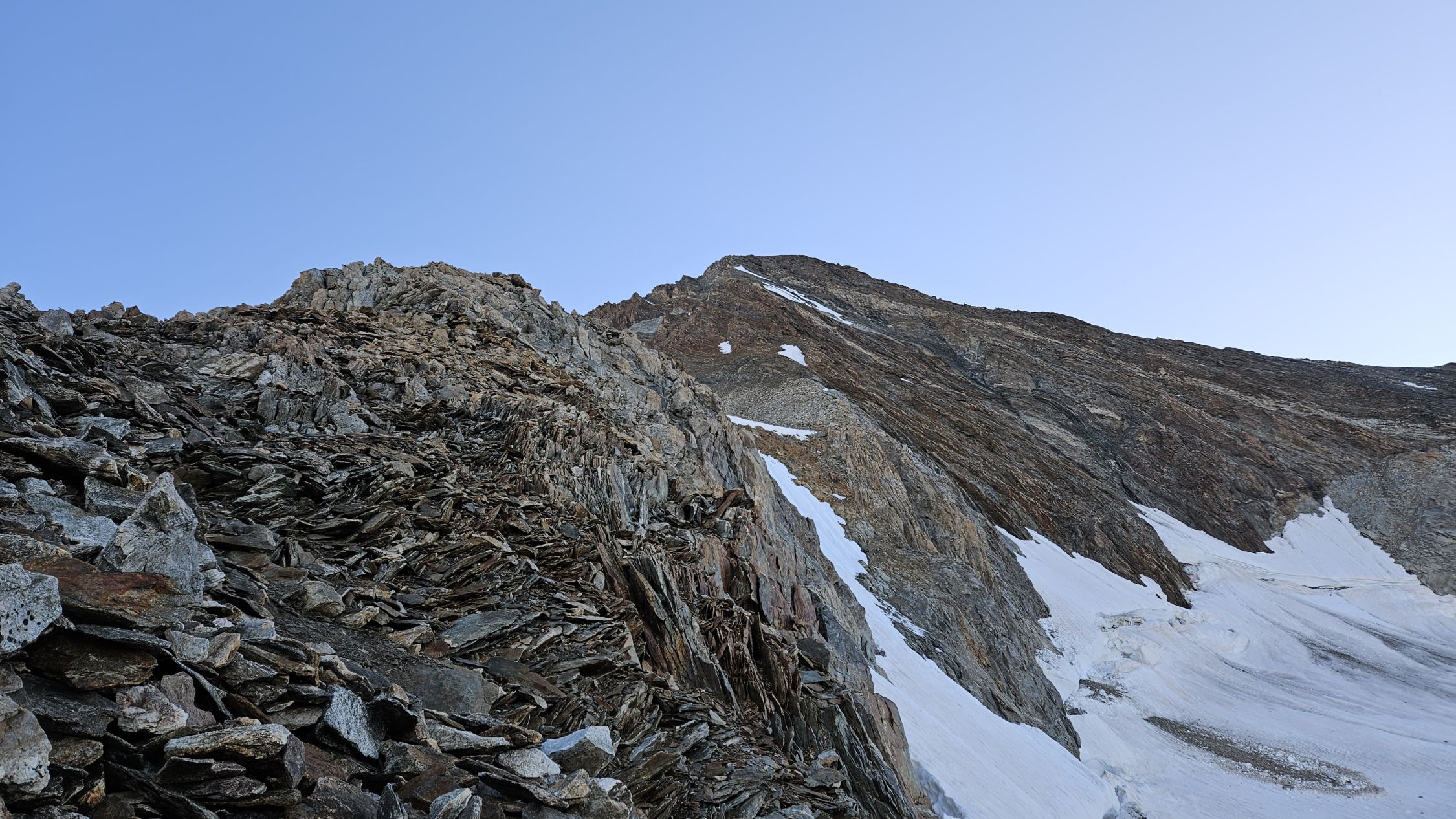 Alle Kletterpassagen sind aper, bis hin zum Gipfel. Sicherungensstangen weisen ab 3900m den Weg und erlauben Abseilen (60m Seil nötig), denn der Fels ist teilweise sehr brüchig bzw schuttüberzogen.