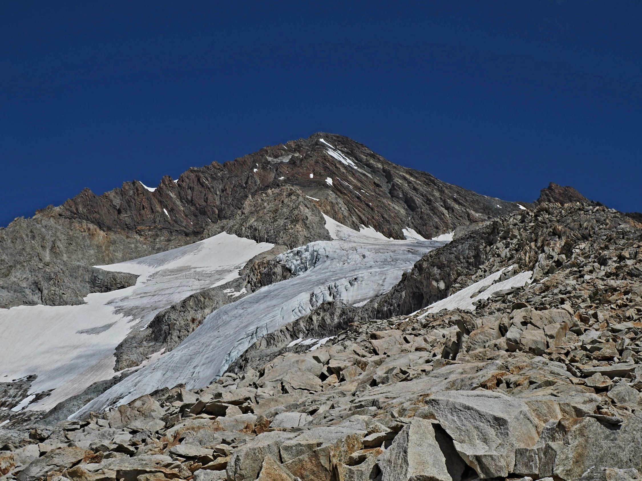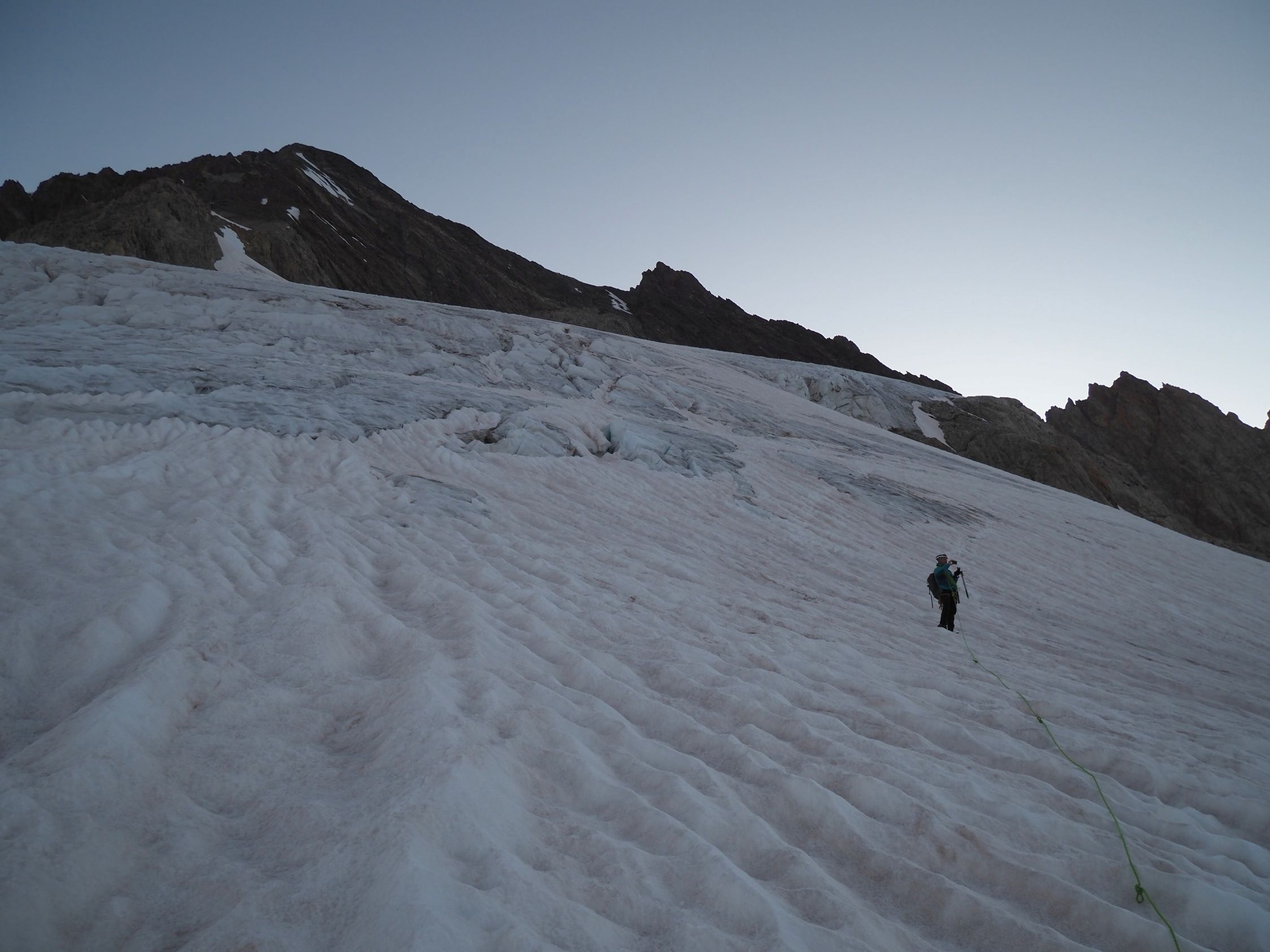 Der Übergang auf den Gletscher auf 3394m ist westseitig einfach. Der Schrund lauert rechts. Ein Weg durch die Spalten ist wie auf den Karten eingetragen gut machbar. Große Spalten sind erkennbar.