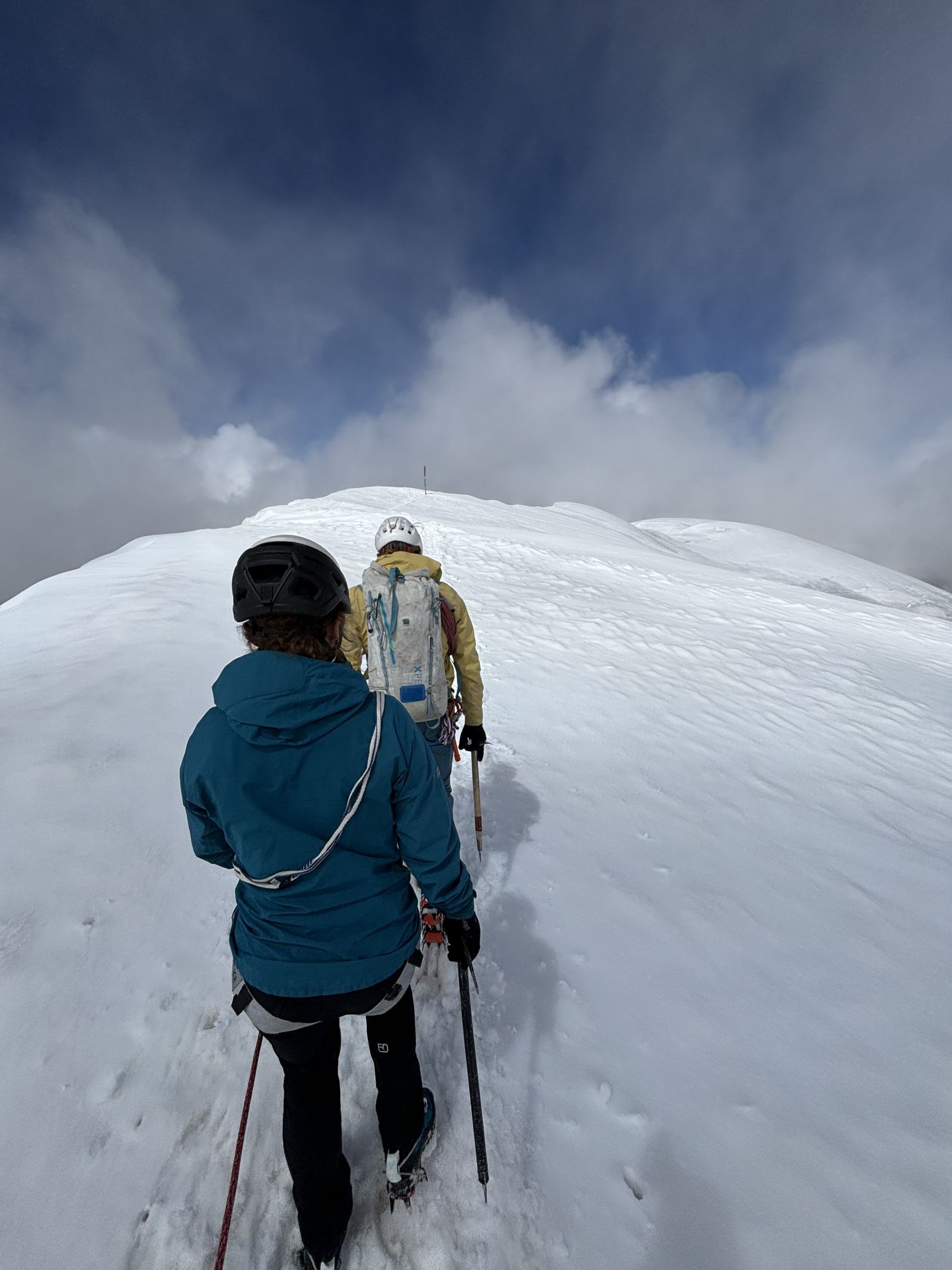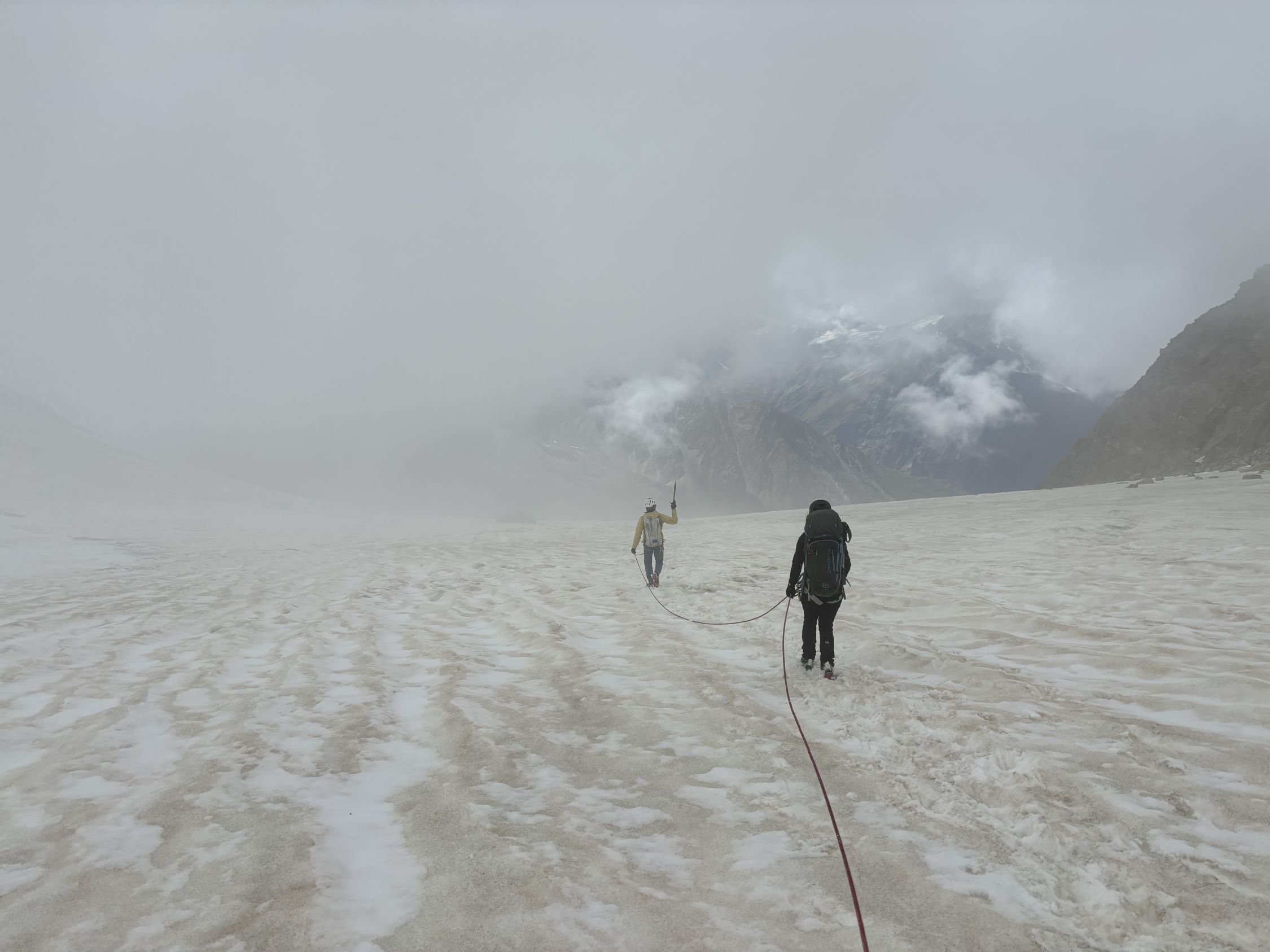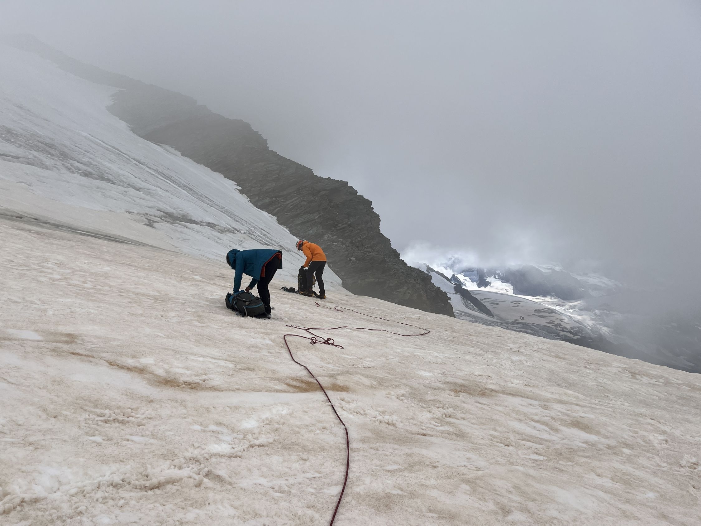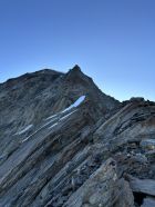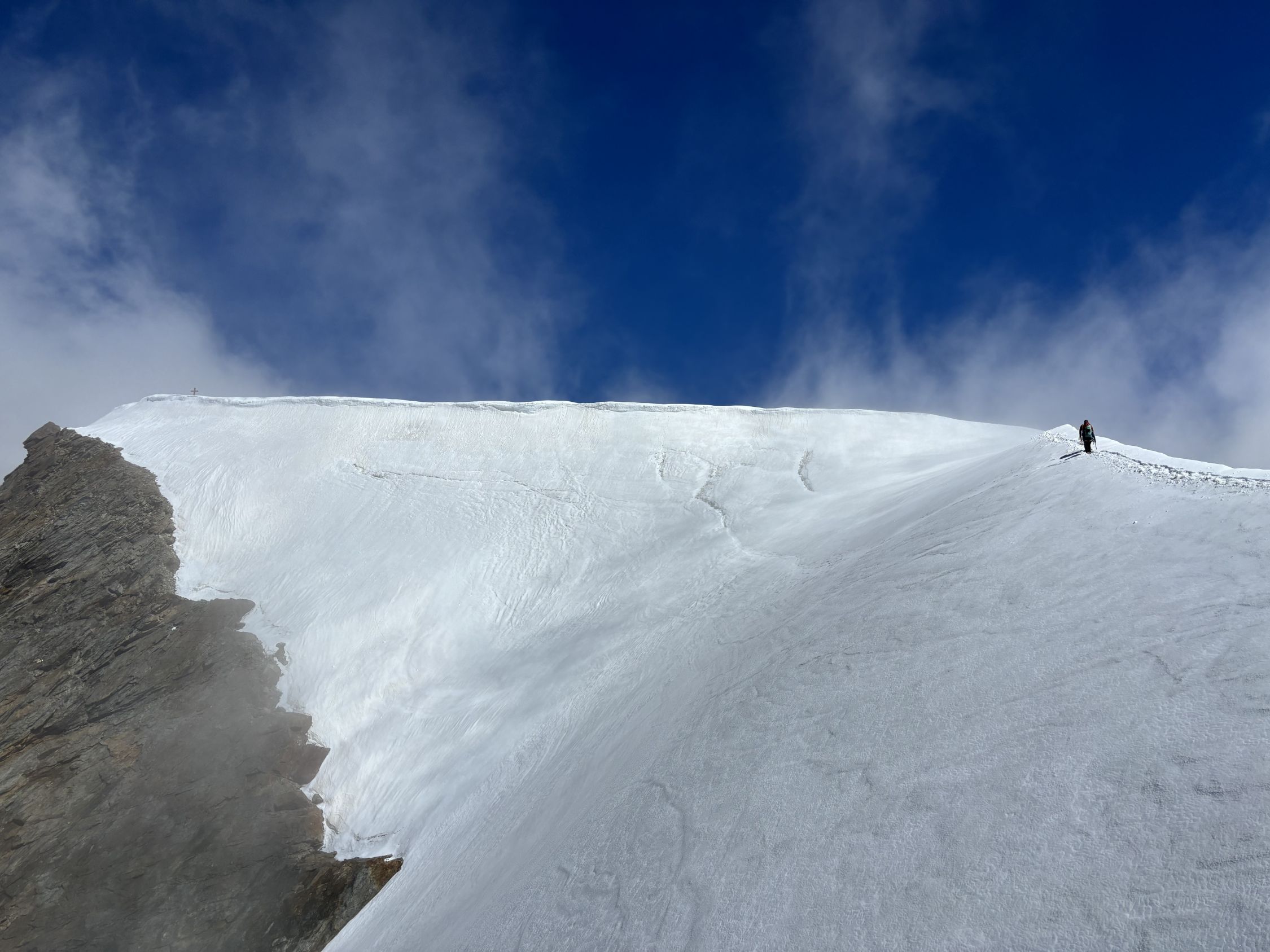 Trotz vorhergesagten starken Schneefällen und trotz der Westexposition ist der Grat grösstenteils trocken. Vor allem auf den flachen Teilstücken kann noch lange heimtückischer Raureif liegen bleiben, hier ist Vorsicht geboten. Bis zum letzten Firnfeld vor 3900m kommt man ohne Schneekontakt. Nässe und Wassereis machen die ersten 2 steilen SL am letzten Aufschwung sehr anspruchsvoll (plattig, schlechte Tritte). Das Gipfelplateau hat eine gute Spur. Die Eisnase ist gerade noch gut zu gehen, erste Stücke sind aber ausgeapert. Wenige Spalten sichtbar im Abstieg zum Alphubeljoch und auf dem Alphubelgletscher, Schneebrücken sonst gut tragend.