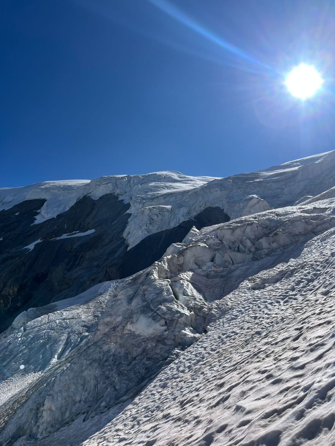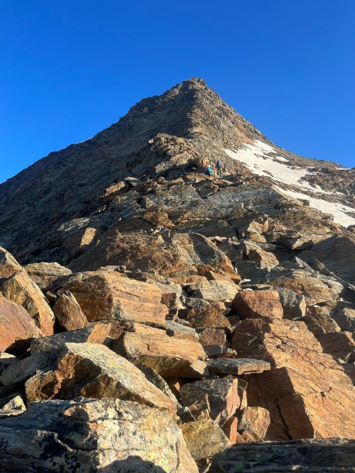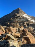 Schöne überschreitung. Ab Hütte um 05:30. SAC Führer Zeit gut möglich. Schnee am Grat und beim Abstieg heute um 11Uhr noch gut gefroren. Kurzes Felsteil vor dem Gipfel-Grat zwingend am Grat begehen; Achtung losses Gestein und exponiertes Gelände kurz unterhalb Grat. Spur am Triftgletscher wegen Gletscher Rückgang mit steilen Spaltenüberquerungen aber gut angelegt. Zum Hohsaas Weg teils apere Gletscher ganz am N-rand begehen. Achtung Seracs oberhalb spur ~3300-3400müm.