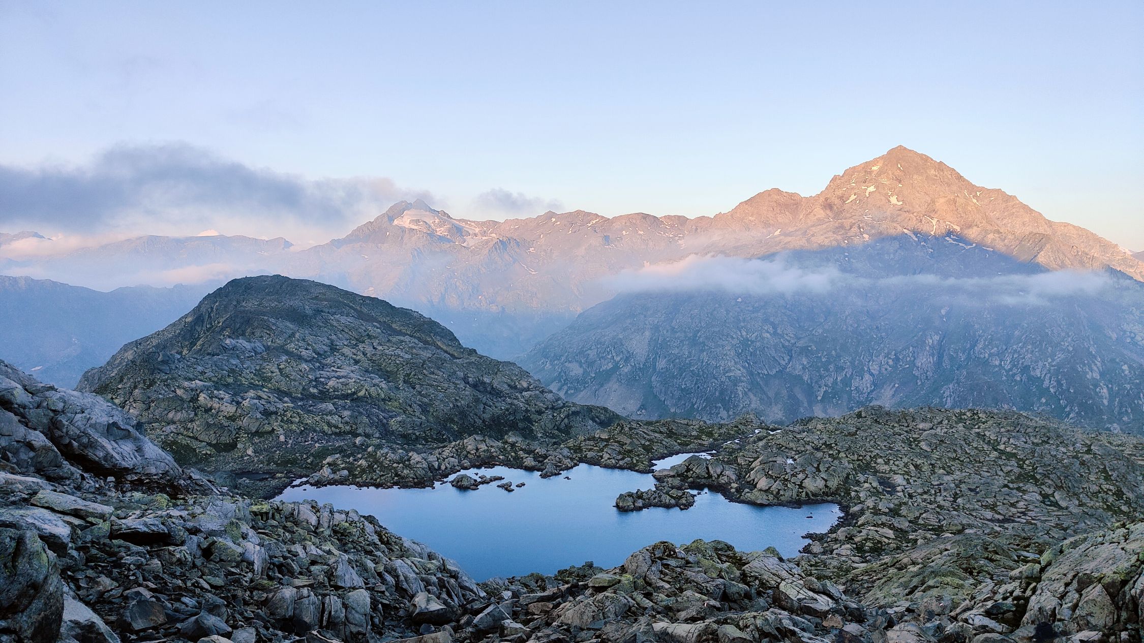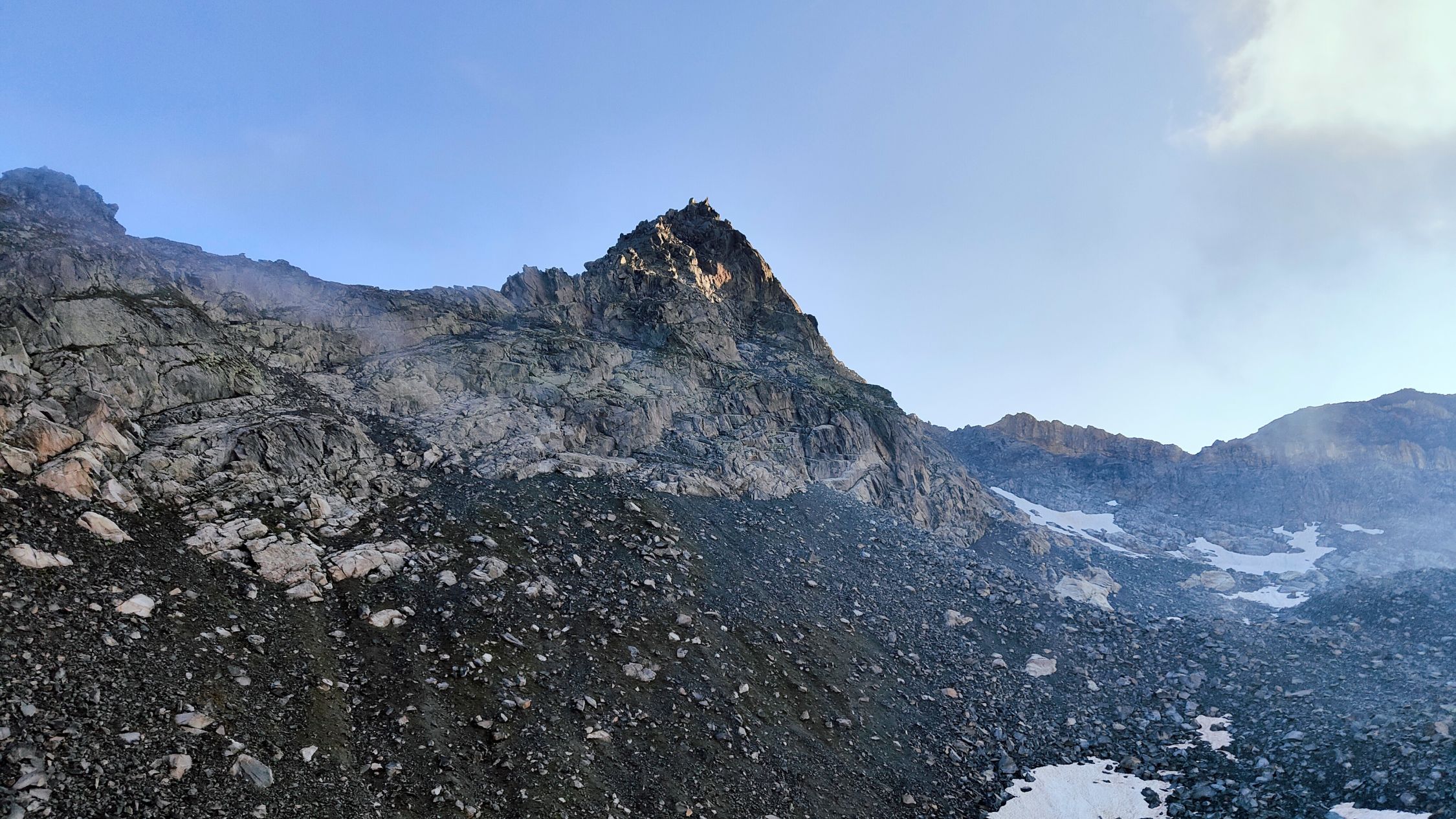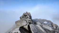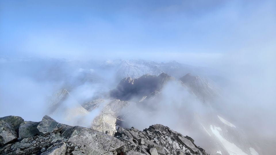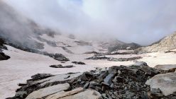 Die Schneefelder, im Bereich des Gletscherrestes, sind tipptopp zu begehen. Der Pickel war hilfreich aber Steigeisen brauchte es keine. Der Rest ist Blockgelände, welches etwas mehr Zeit in Anspruch nimmt. Leider zogen Wolken auf, kurz bevor ich den Gipfel erreichte.
