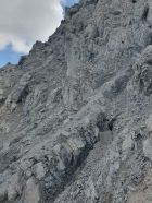 Auch muss feiner Schutt auf festen Platten im steilem Gelände, v.a. auf den Bänden, wegen Rutschgefahr kurz mit der Sohle frei gemacht werden.