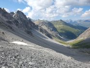Nach dem Piz Ivraina kam mir der Abstieg vom P2931 anspruchsvoller vor als damals. Bin ich ängstlicher geworden? Wie auch immer, ich habe diese Stelle von T5 auf T6 heraufgestuft, beides wie gehabt ein II-er. Die kurze Stelle ist mit dem Geröll stark ausgesetzt und verlangt Aufmerksamkeit.