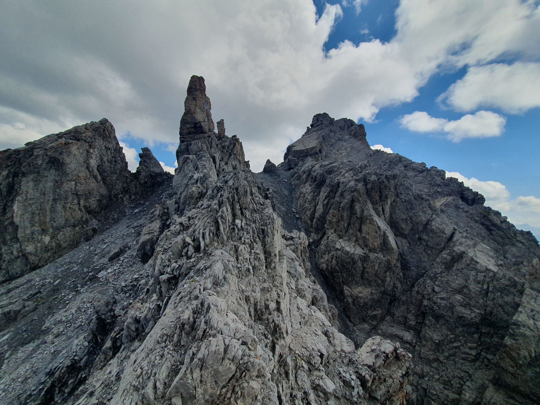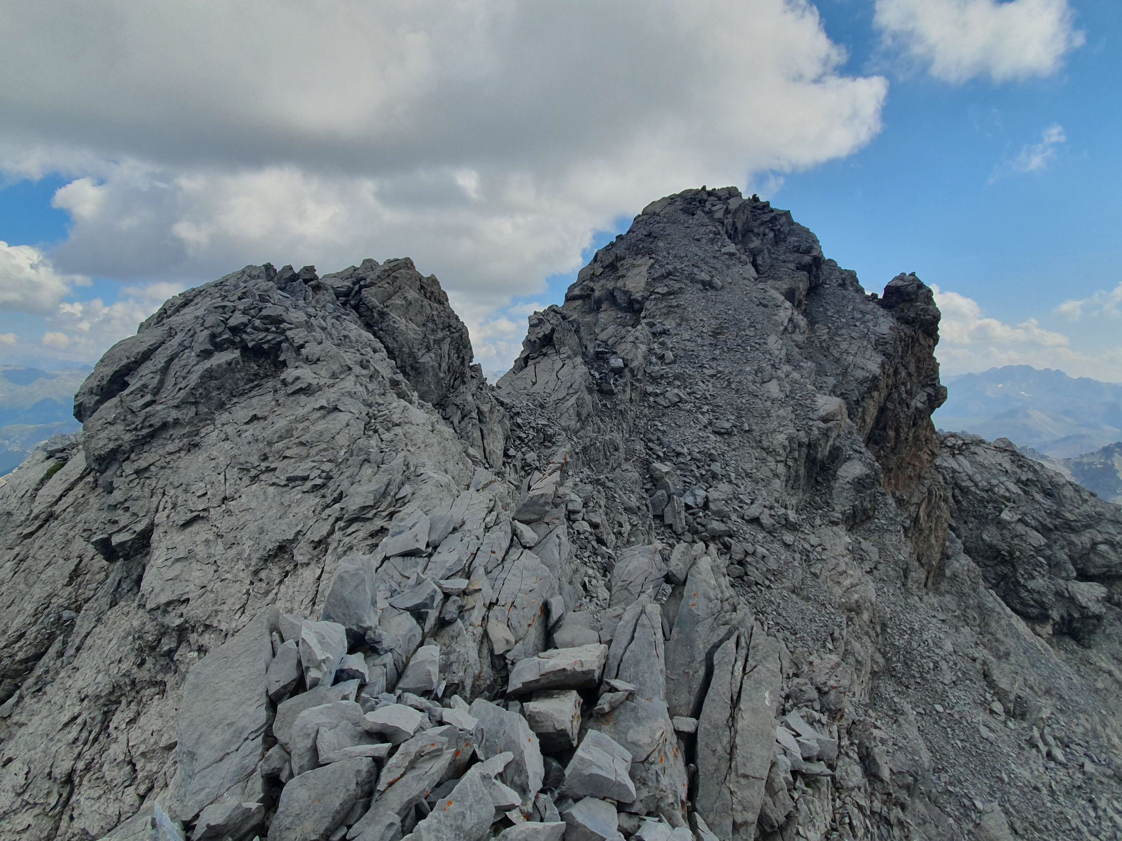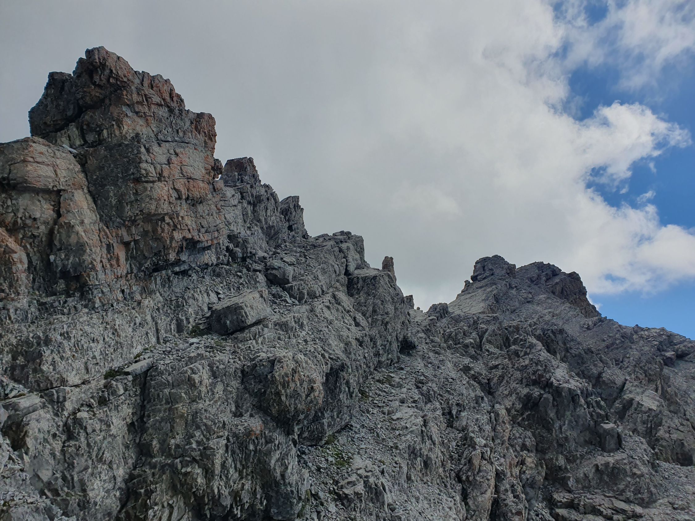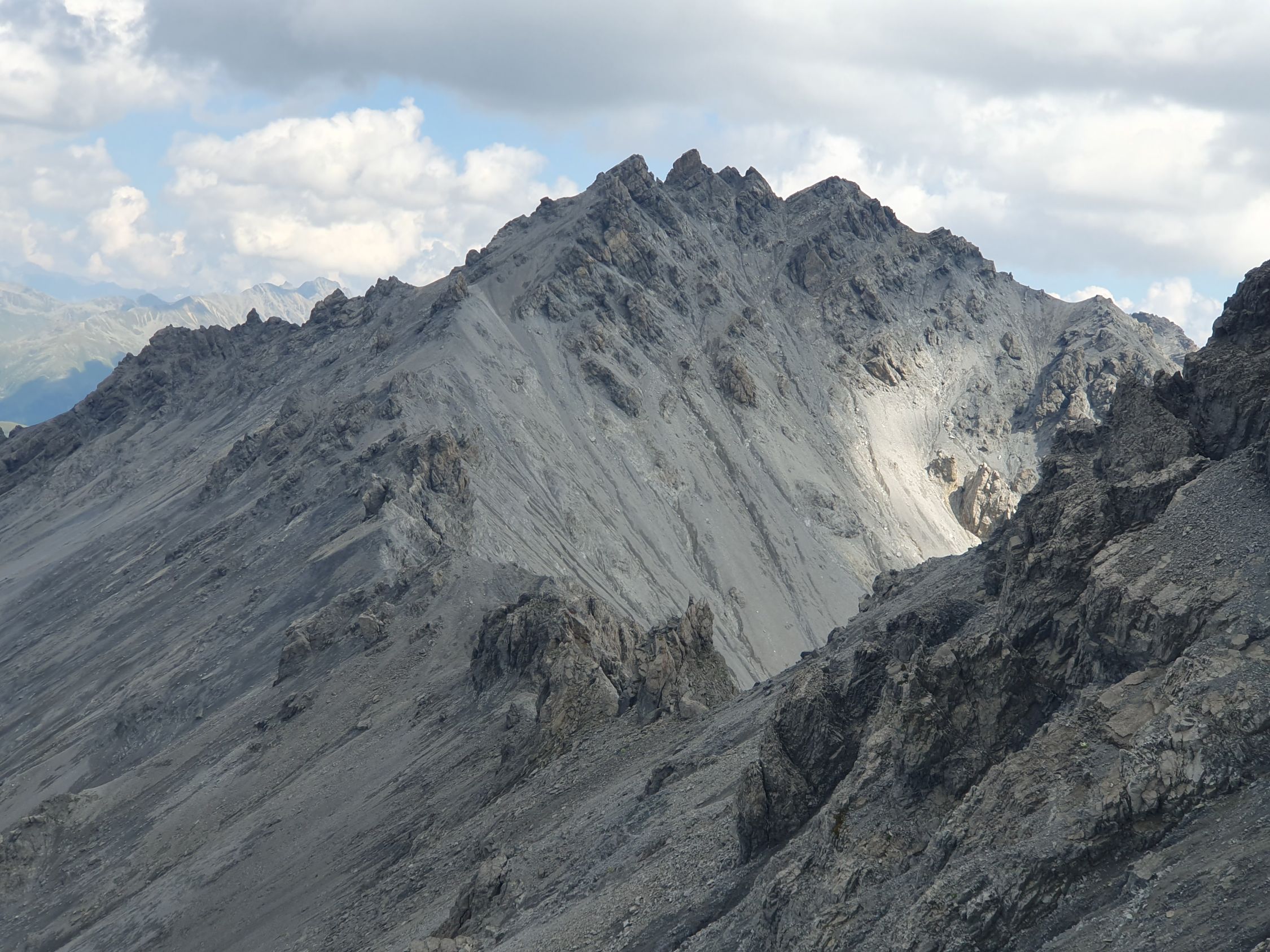 Also wer sich das alles nicht antun möchte ist wohl besser bedient aus dem Val Sampuoir bei Gravas von P2588 diesen P2875 über die Nordrinne direkt hochzusteigen. Ab P2875 war das Gelände interessant, denn zuerst ging es südlich vom Grat weiter über verschiedene Bänder hoch zu Felszacken und eine riesige schräge zersplittene Platte, die jedoch rechts umgangen werden konnte.