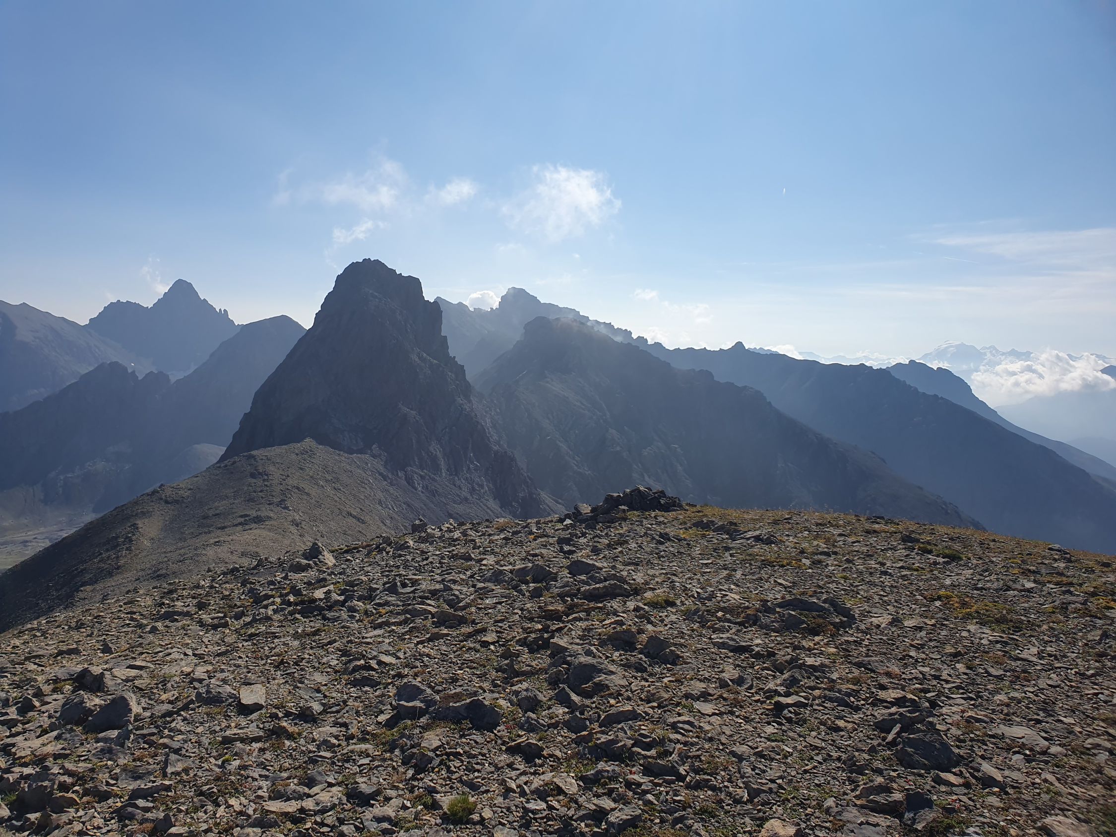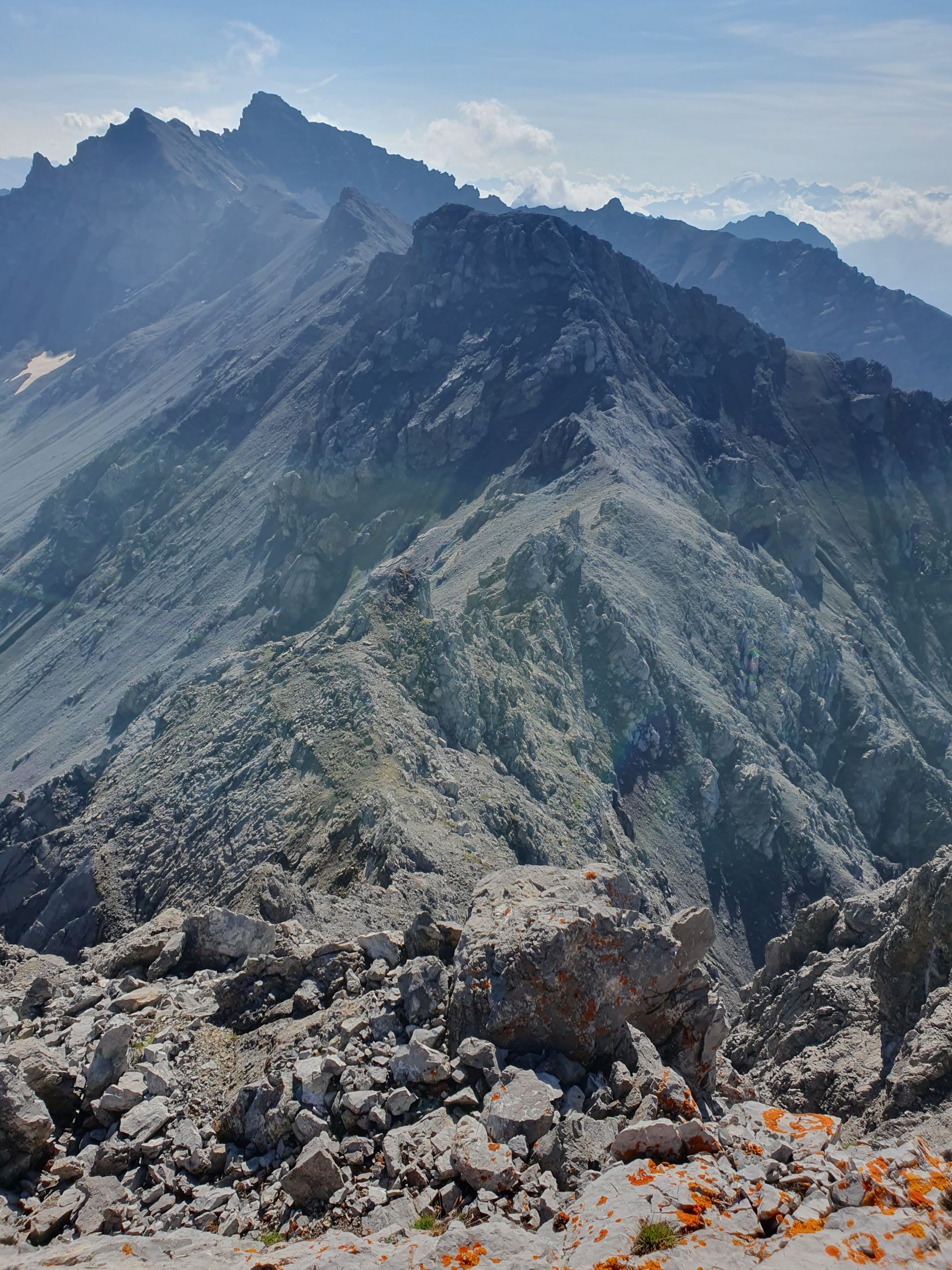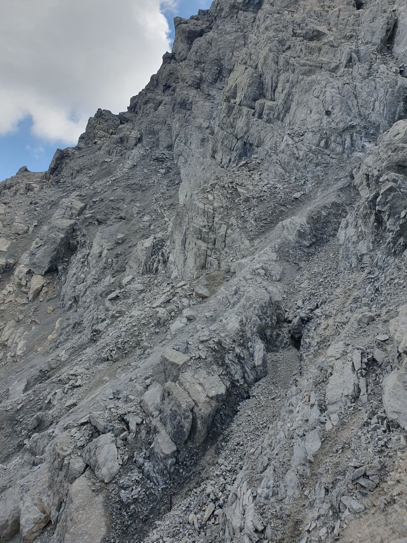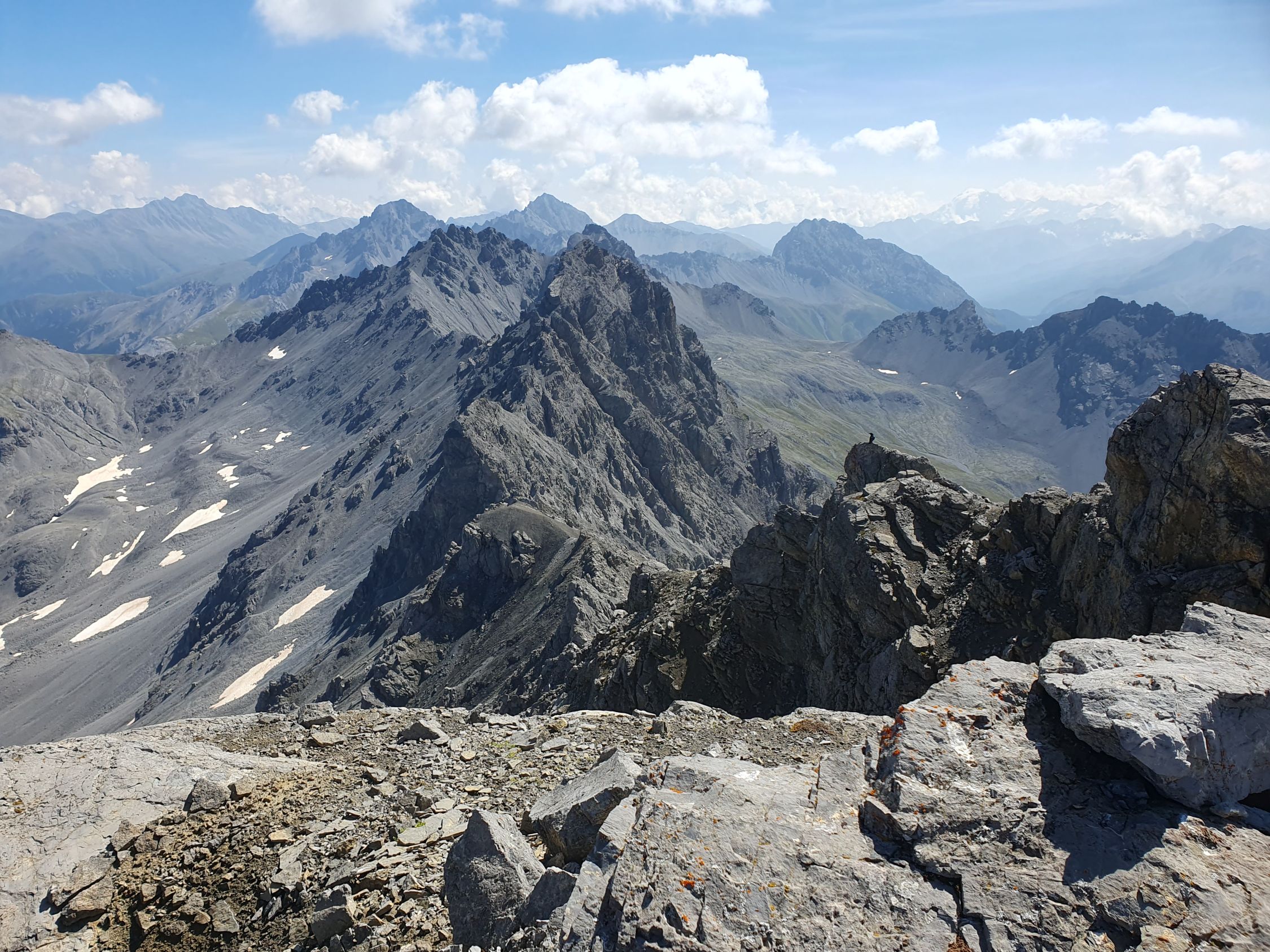 Also wer sich das alles nicht antun möchte ist wohl besser bedient aus dem Val Sampuoir bei Gravas von P2588 diesen P2875 über die Nordrinne direkt hochzusteigen. Ab P2875 war das Gelände interessant, denn zuerst ging es südlich vom Grat weiter über verschiedene Bänder hoch zu Felszacken und eine riesige schräge zersplittene Platte, die jedoch rechts umgangen werden konnte.