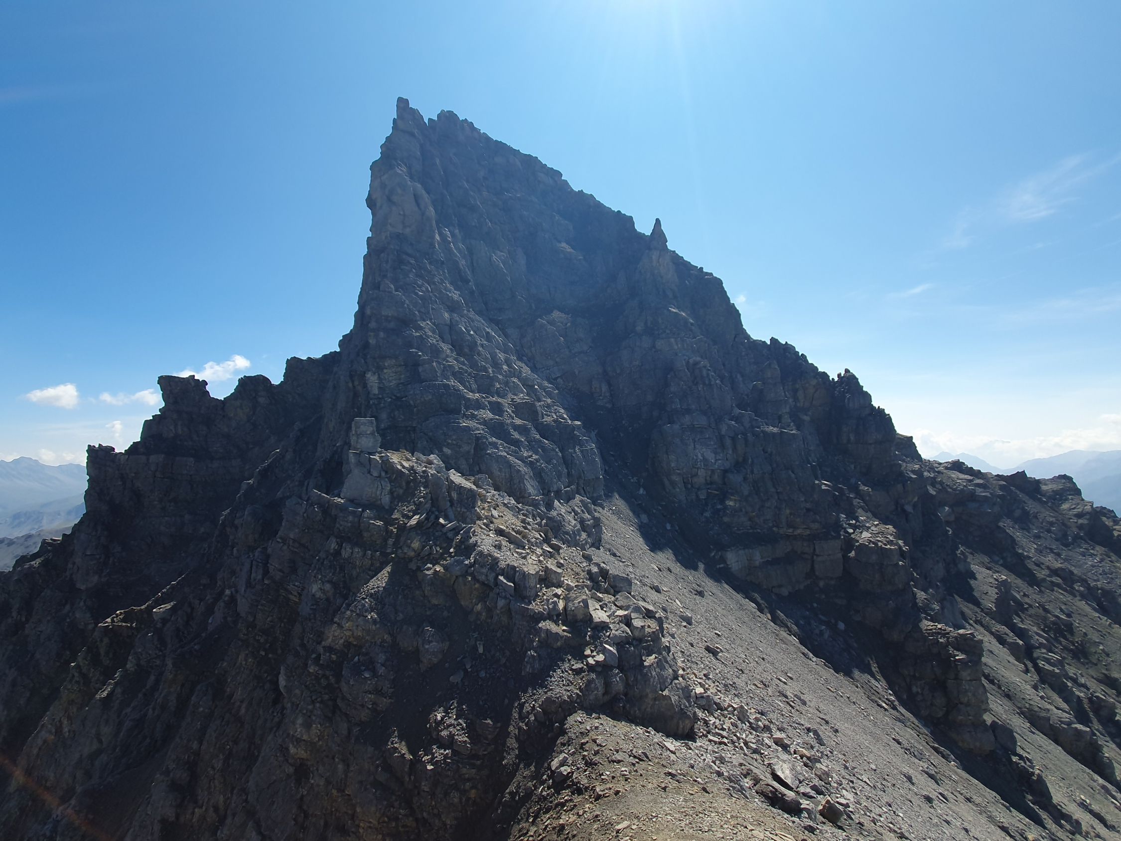 Als Abstieg empfehle ich den Westgrat hinab bis P2875 und dann durch die Nordrinne hinab nach Gravas in das Val Sampuoir.