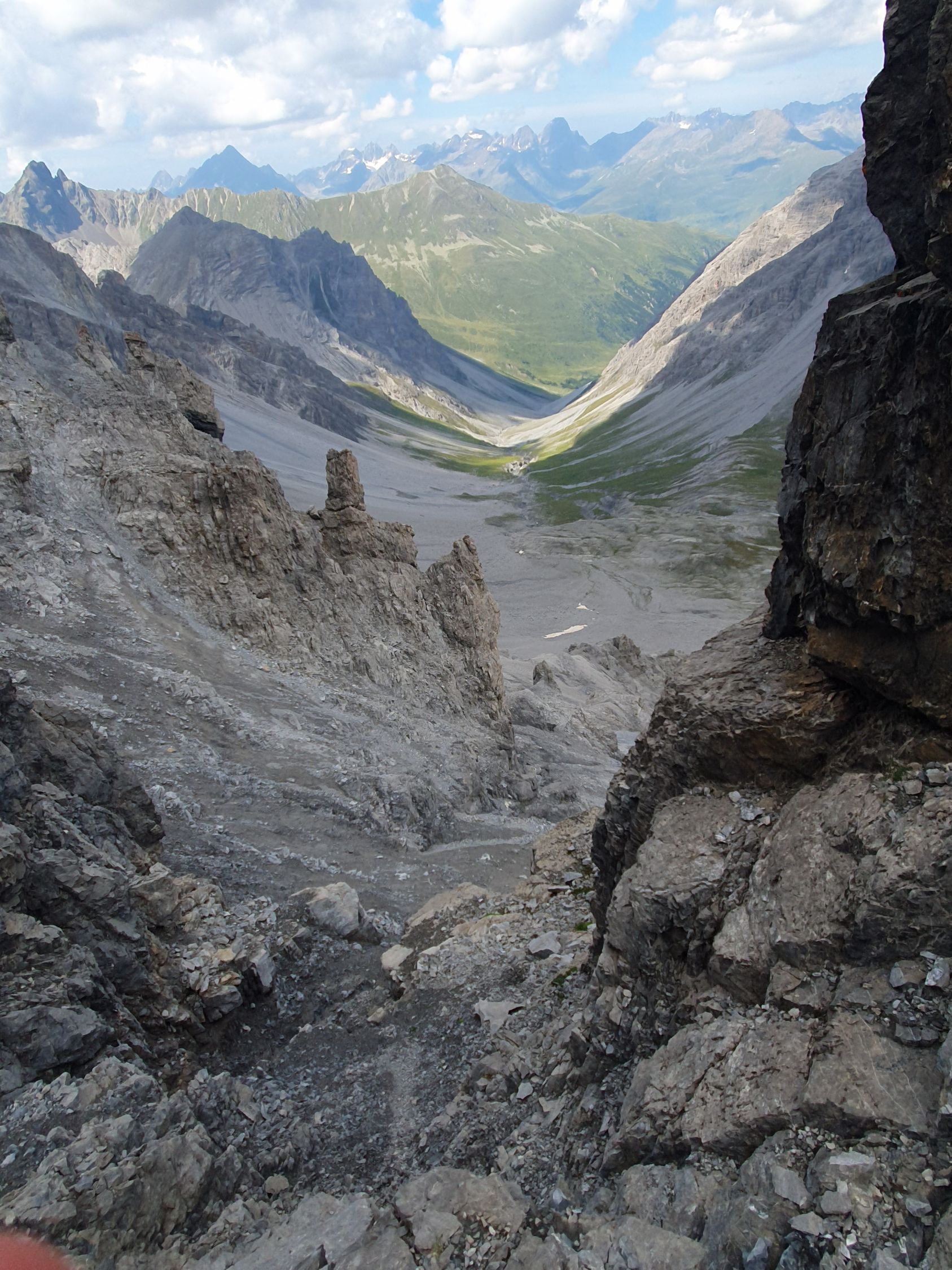 Ich wusste, dass die Zeit und meine Energie langsam zu neige ging. Somit doch noch kurz dem Ostgrat vom Piz Ftur hinab bis nichts mehr ging. Nach Osten ging eine lange senkrechte Wand hinab, südlich kein Durchkommen, nördlich sah ich nur eine 5 Meter Rinne, die danach abschüssig wurde. Aus einem alten Führer war hier jedoch die Rede: Entweder direkt auf dem Ostgrat hinabklettern (unmöglich) oder nördlich umgehen. Deswegen bin ich diese 5 Meter Rinne trotzdem mal abgestiegen und habe da tatsächlich ein Weiterkommen gefunden. Aber es handelt sich da um extrem abschüssiges Gelände und ich empfehle es niemanden da hinab zu steigen!