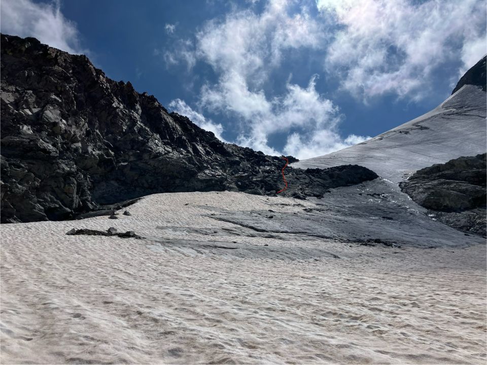 Der Zustieg in die Ostflanke ist nur noch über den Grat oder den neuen Steig in den Randfelsen des Grates möglich- darunter aber zunehmend dünne Eisreste durch Ausaperung (siehe Foto)