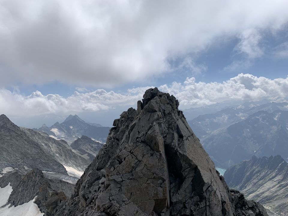 Beim Überklettern der Graterhebungen verloren wir weitere Zeit. Diese bestehen fast ausschliesslich aus Blockgelände, wobei aber nicht alles fest ist und wir daher sehr vorsichtig gingen. Erst kurz vor dem Vorgipfel kommen ein paar wirkliche Kletterzüge. Hier sicherten wir auch zum ersten Mal mit dem Seil.