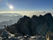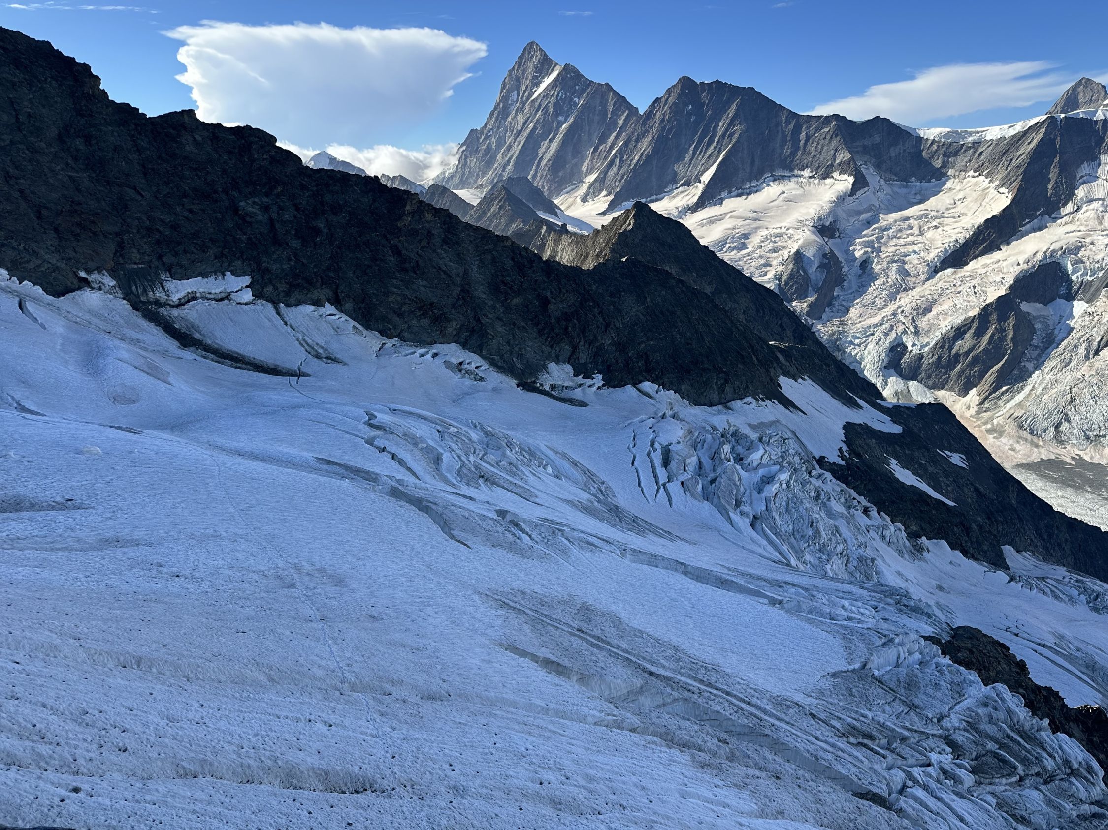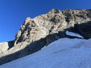 Schreckfirn hat noch genügend Schnee, nur an vereinzelten Stellen zeigt sich das Blankeis, auf der Spur aber problemlos. Unterwegs hat es eine grosse Querspalte, die man aber mit einem beherzten Schritt übergehen kann. Einstieg aktuell noch unproblematisch machbar. Am Fels dann wunderbare Kletterei bei recht warmem Wetter mit leichtem Wind.