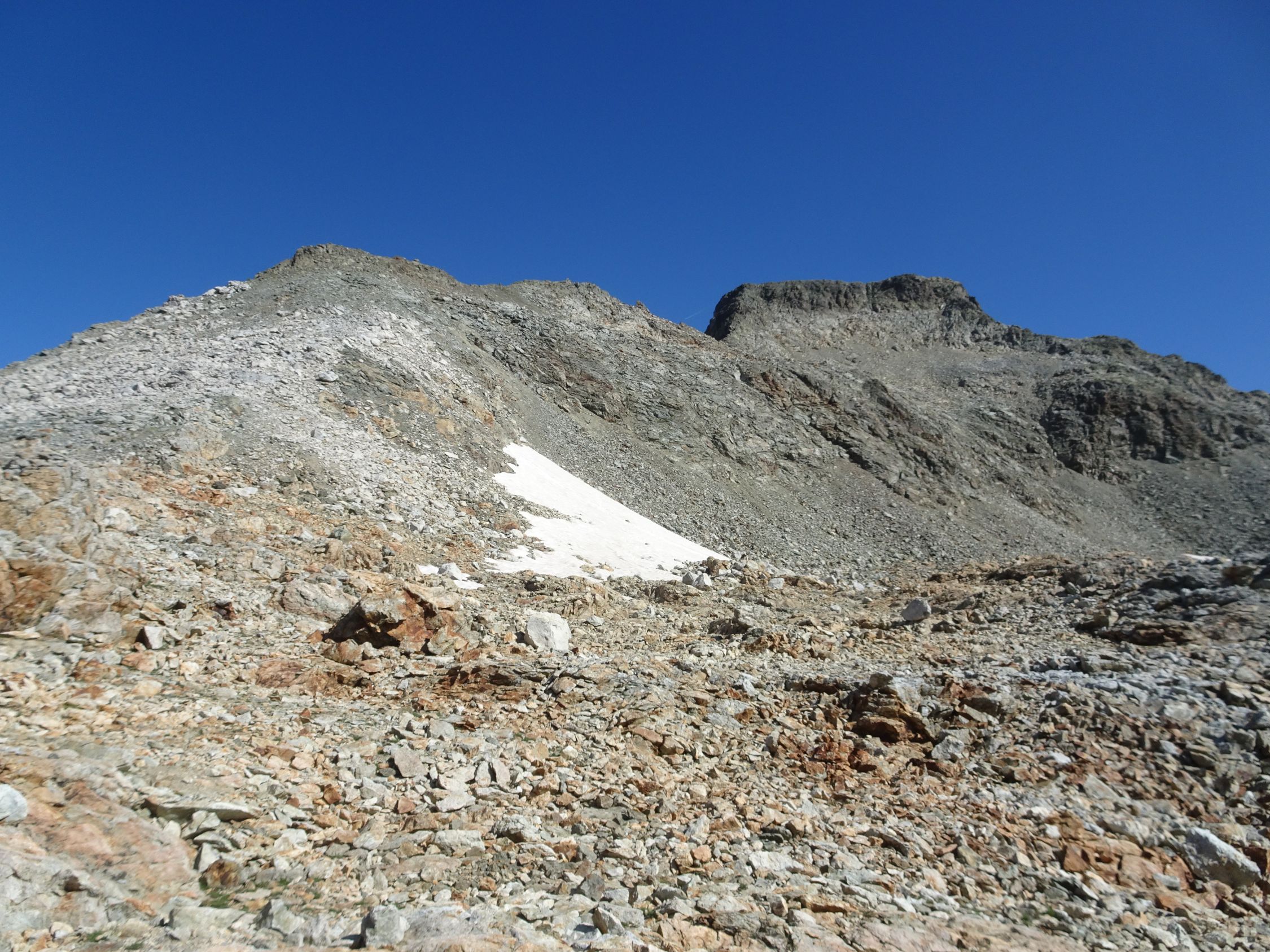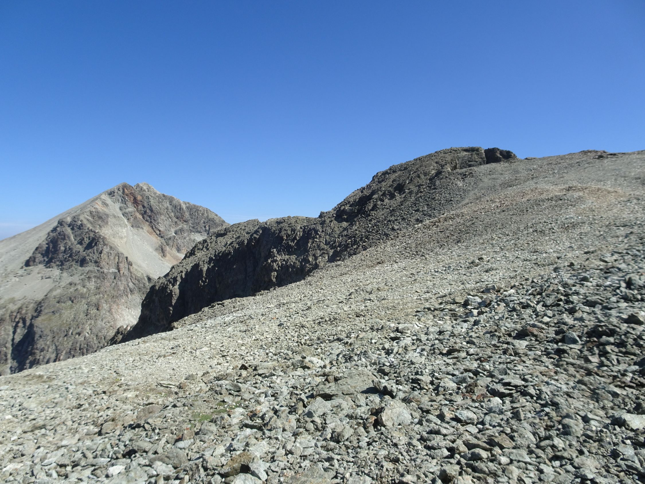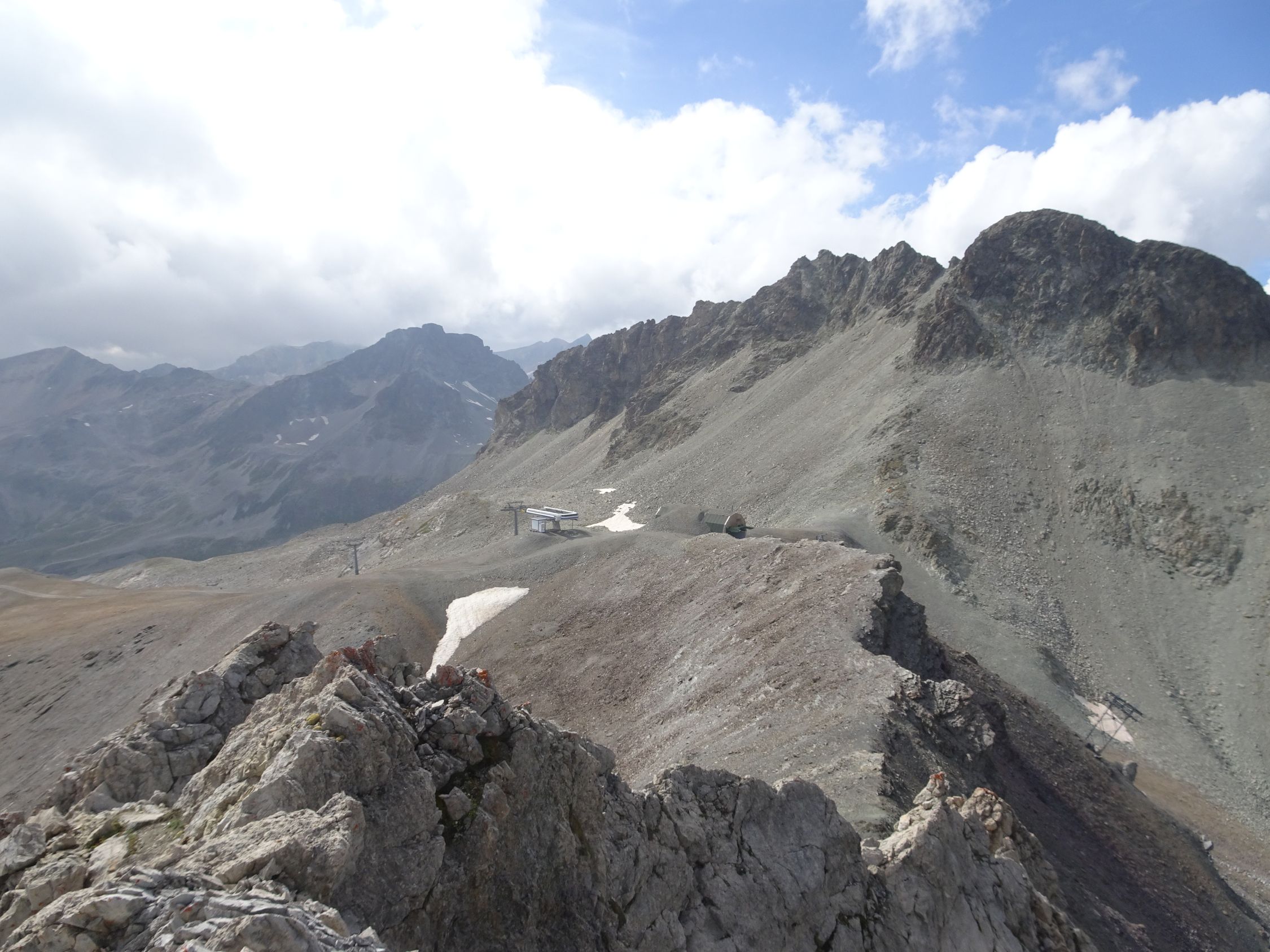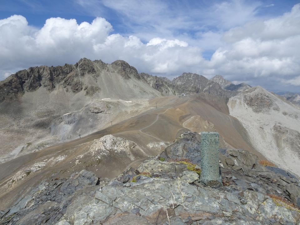Corn Margun: Über eine markante Schuttrinne direkt hoch und dann östlich um eine Felsstufe herum und auf einem leichten Weg hoch. Abstieg via Crap Alv, Muot Cotschen runter nach La Veduta.