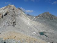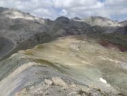 Fuorcla Margun: Erst rechts (nördlich), dann links (östlich) und wieder rechts (westlich) vom Bach aufgestiegen. Etwas östlich vom schönen Seelein gegen den markanten Felsturm mit dem Auge (Felsloch - sieht aus wie das Auge des Adlers) hoch. Die Fuorcla Margun kann am tiefsten Punkt wegen steiler Felsen (Gletscher- / Firnrückgang) von Norden nicht erreicht werden.
