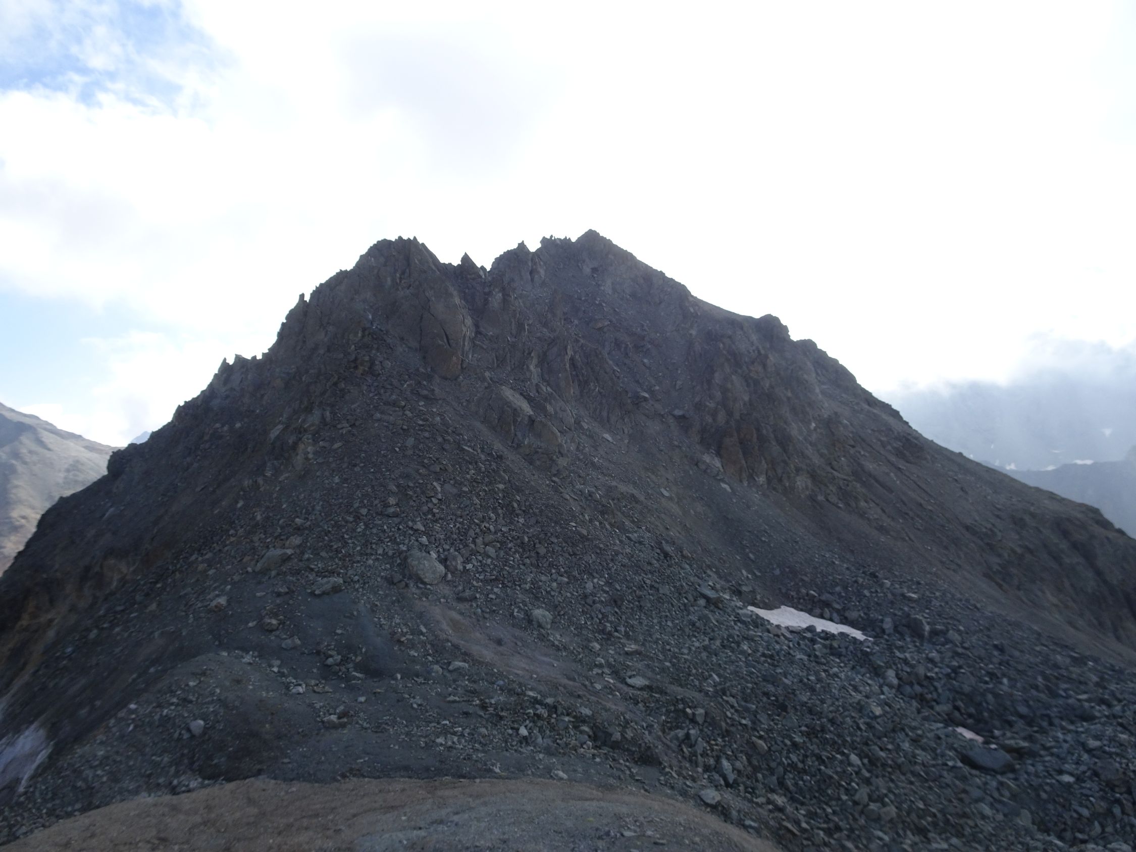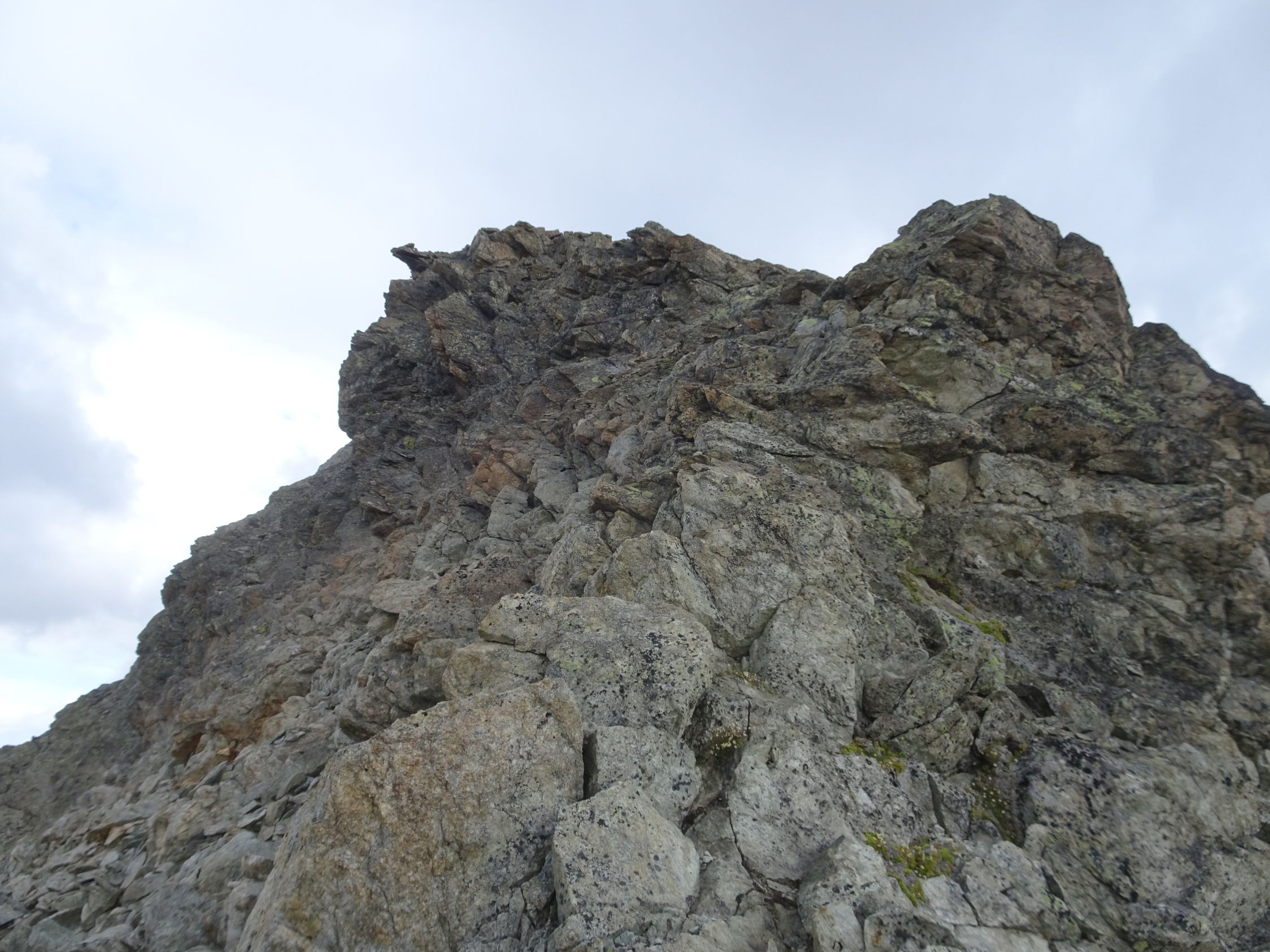 Piz Grisch: Wegspuren bis zum Sattel hoch. Dann in kristallinem ebenso griffigem Gestein hoch. Nach dem Sattel zu Beginn etwas exponiert.