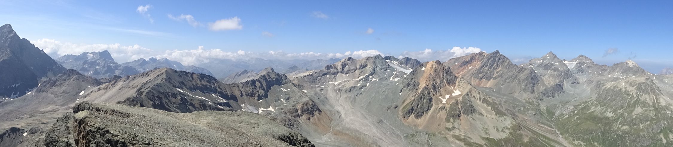 Piz Schlattain: Wunderbare Farben im ganzen Julier-Ot-Bergmassiv. Richtung Fuorcla Grisch quert man gefühlt ganze Erdgeschichten. Leichter Pfad zum Gipfel, griffiger scharfer Kalkstein.