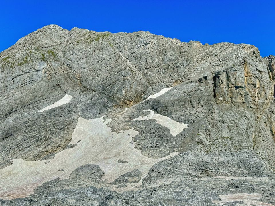 Schnee ist soweit zurück, dass man ohne Steigeisen durch kommt. 3er Gruppe im unteren Schneefeld und 2 (im Bild erkennt man nur 1) etwas rechts beim Einstieg zum Kamin.