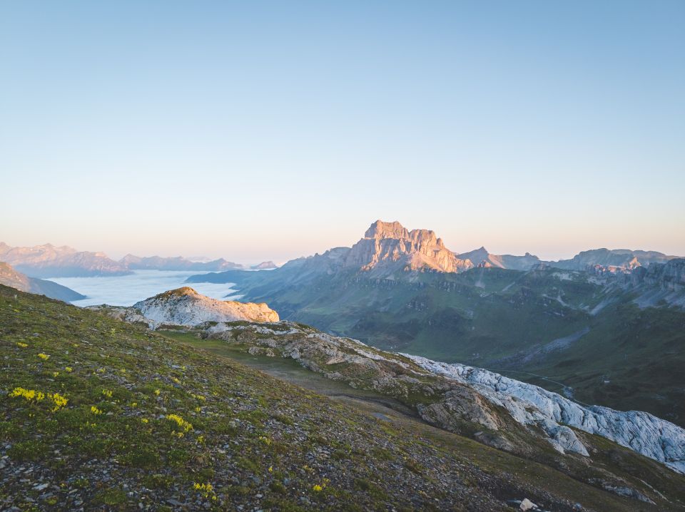 Fels trocken, trotz Nebel am Vortag auf dem Pass, fast blauer Himmel, aperer Gletscher