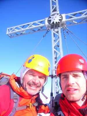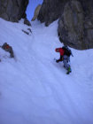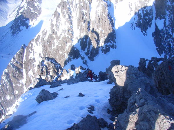 Aufstieg mit Steigeisen/Pickel:Gipfelanstieg bei dem kleinen Schärtchen vor der luftgen Querung in die SW-Seite zum Grat ab da ungefähr dem Sommerfeg folgend zum Gipfel.