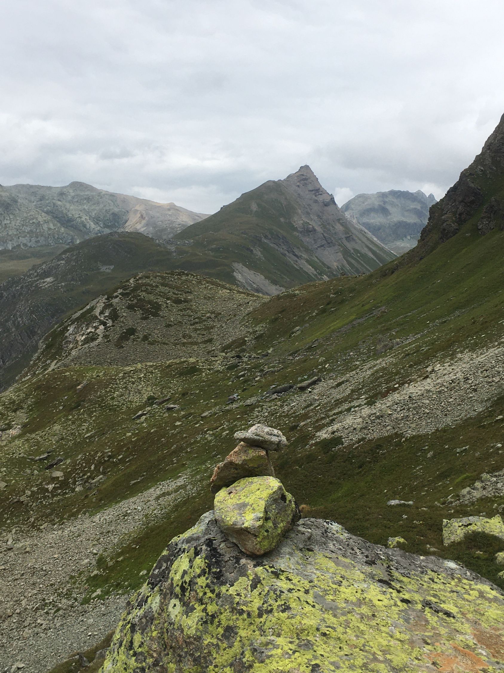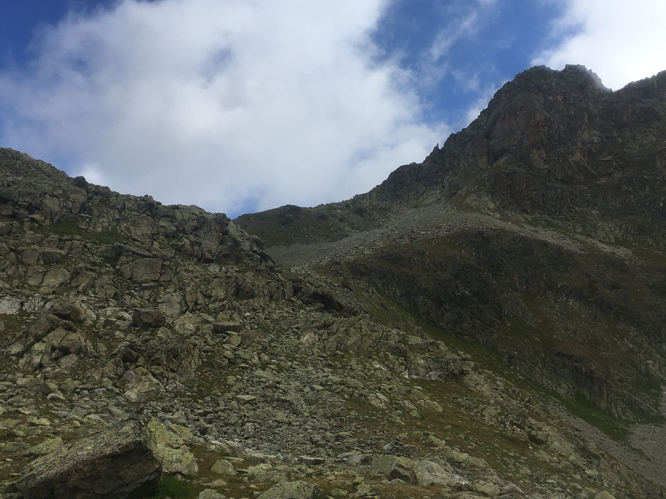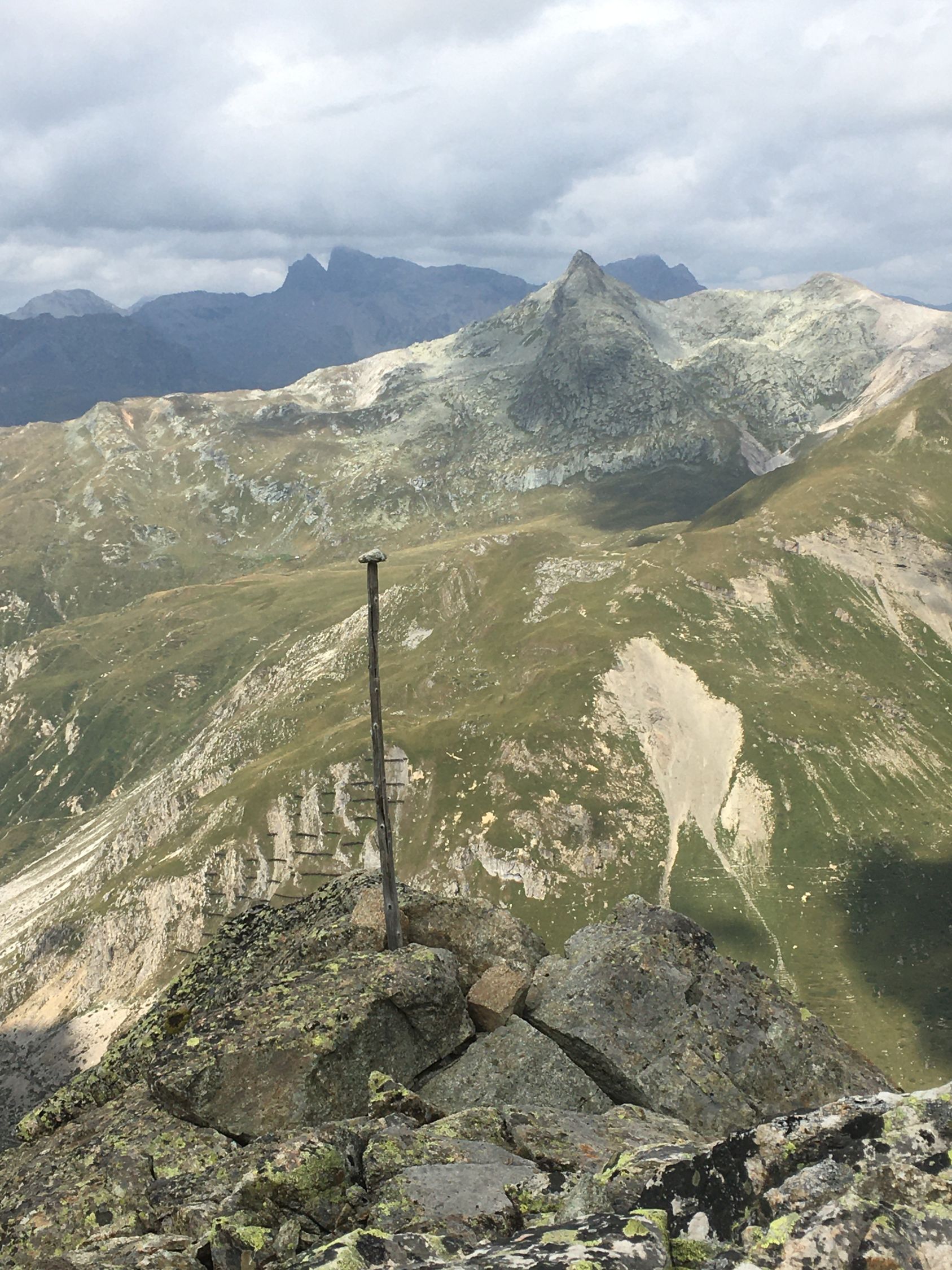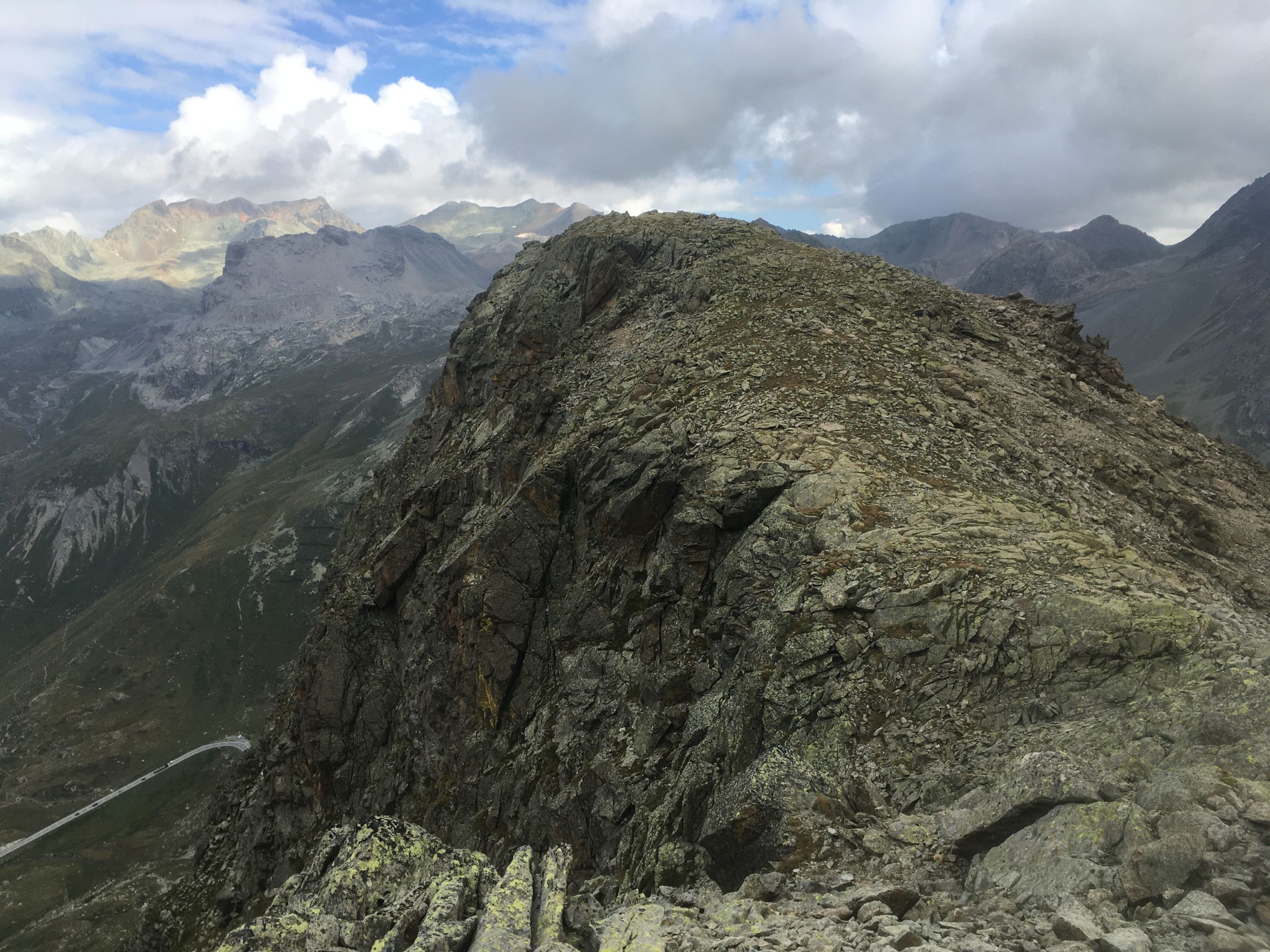 Alpine Wanderung auf den markanten, spitzigen Pfeiler oberhalb Julier Passhöhe, T4,II. Start Veduta 8.30 Uhr, 11 Grad, windstill. leicht bewölkt. Zuerst den rotweiss markierten Wanderweg hoch bis zu Punkt 2449 oberhalb Leg Grevasalvas. Nun beim markanten Felsblock ein Weglein und später weglos die Westflanke hoch und in einem Bogen Richtung Norden, eine Kletterstelle im II. Grad und hoch, teilweise Steinmännchen, bis auf das Plateau. Nun ohne Schwierigkeiten etwas runter und auf dem zuerst breiten Pfeiler, im Gipfelbereich ausgesetzt zum Punkt 2785. Abstieg wie Aufstieg.