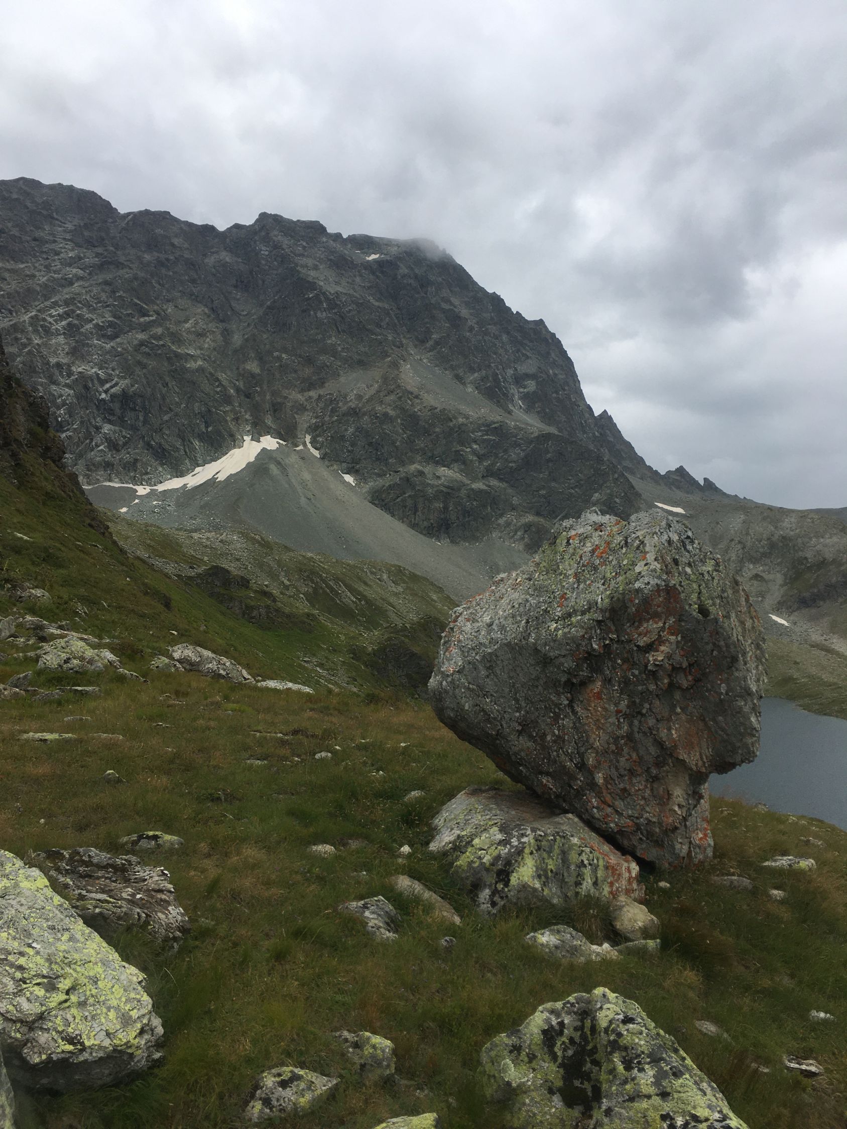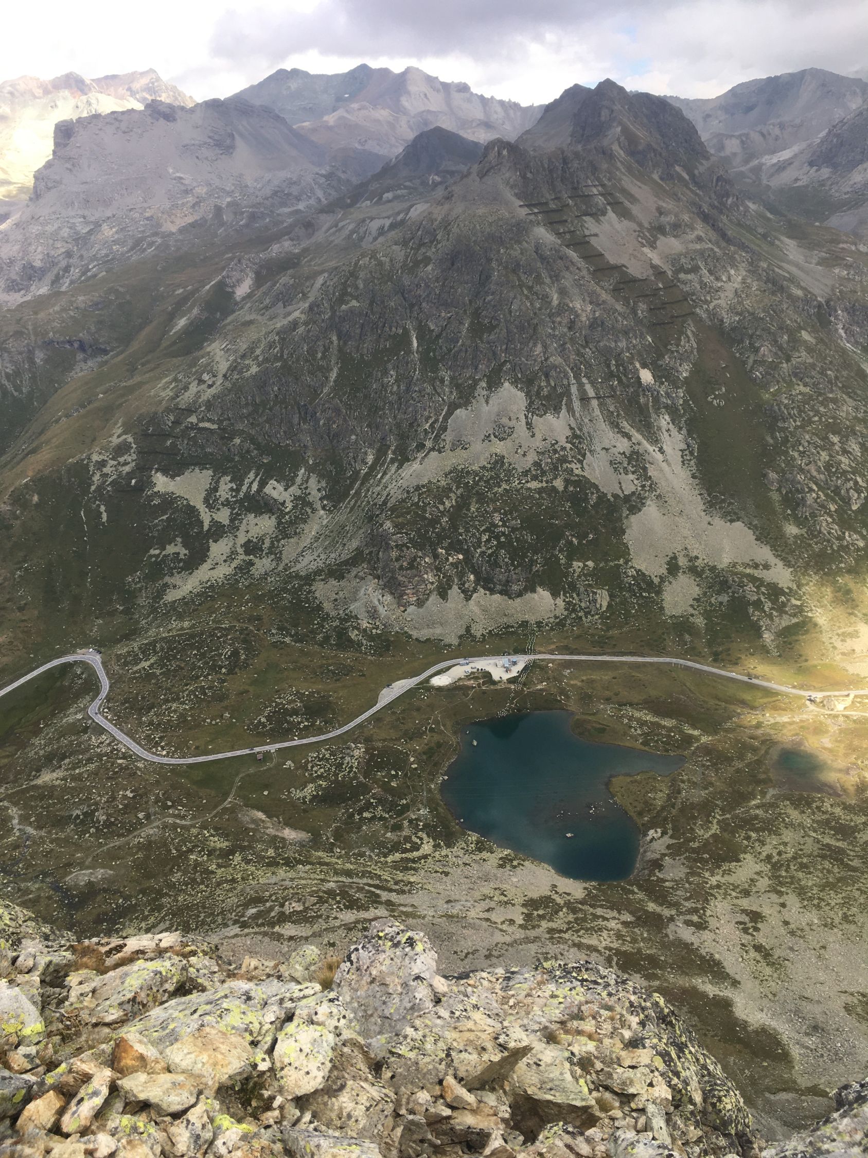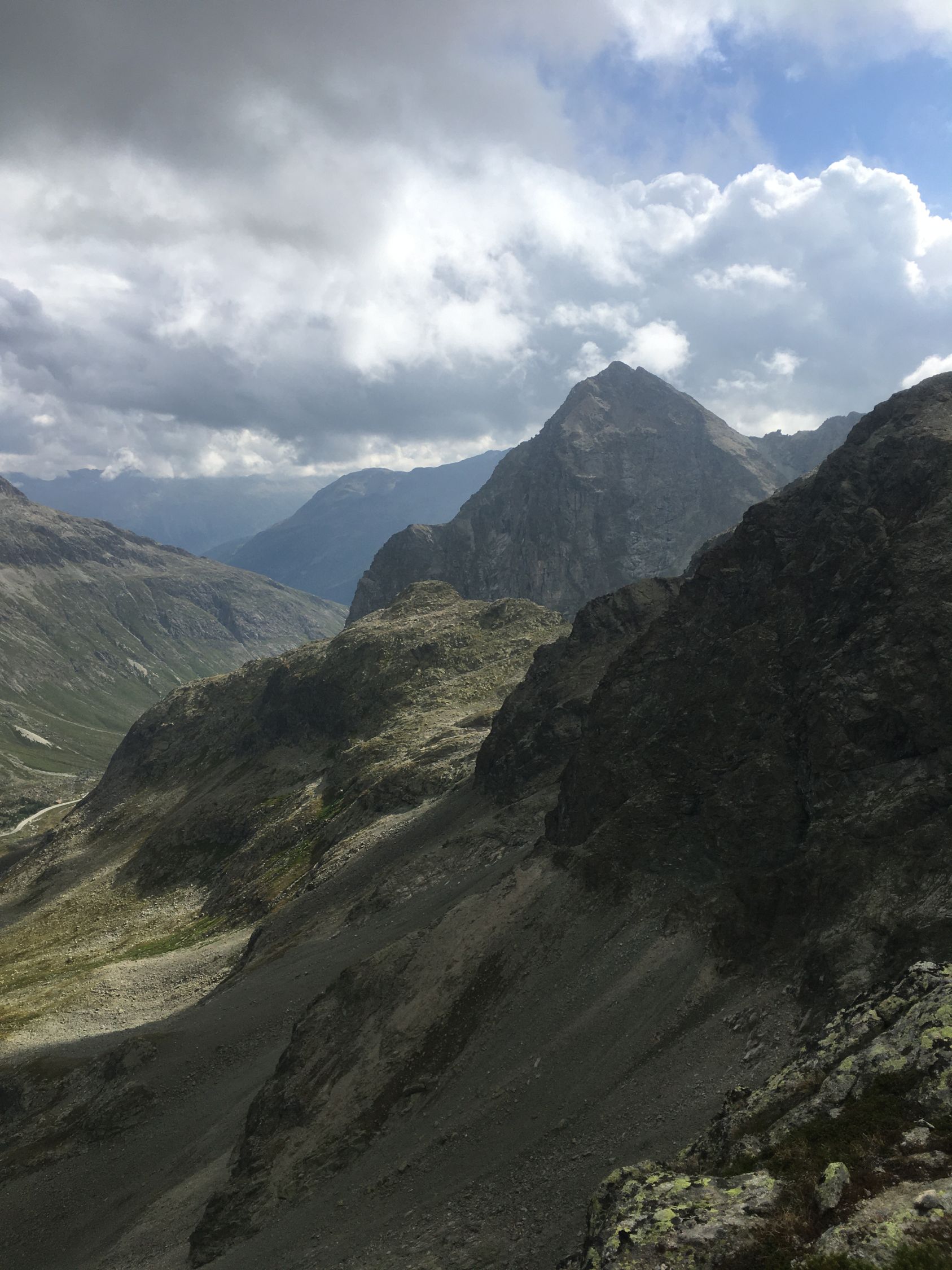 Alpine Wanderung auf den markanten, spitzigen Pfeiler oberhalb Julier Passhöhe, T4,II. Start Veduta 8.30 Uhr, 11 Grad, windstill. leicht bewölkt. Zuerst den rotweiss markierten Wanderweg hoch bis zu Punkt 2449 oberhalb Leg Grevasalvas. Nun beim markanten Felsblock ein Weglein und später weglos die Westflanke hoch und in einem Bogen Richtung Norden, eine Kletterstelle im II. Grad und hoch, teilweise Steinmännchen, bis auf das Plateau. Nun ohne Schwierigkeiten etwas runter und auf dem zuerst breiten Pfeiler, im Gipfelbereich ausgesetzt zum Punkt 2785. Abstieg wie Aufstieg.