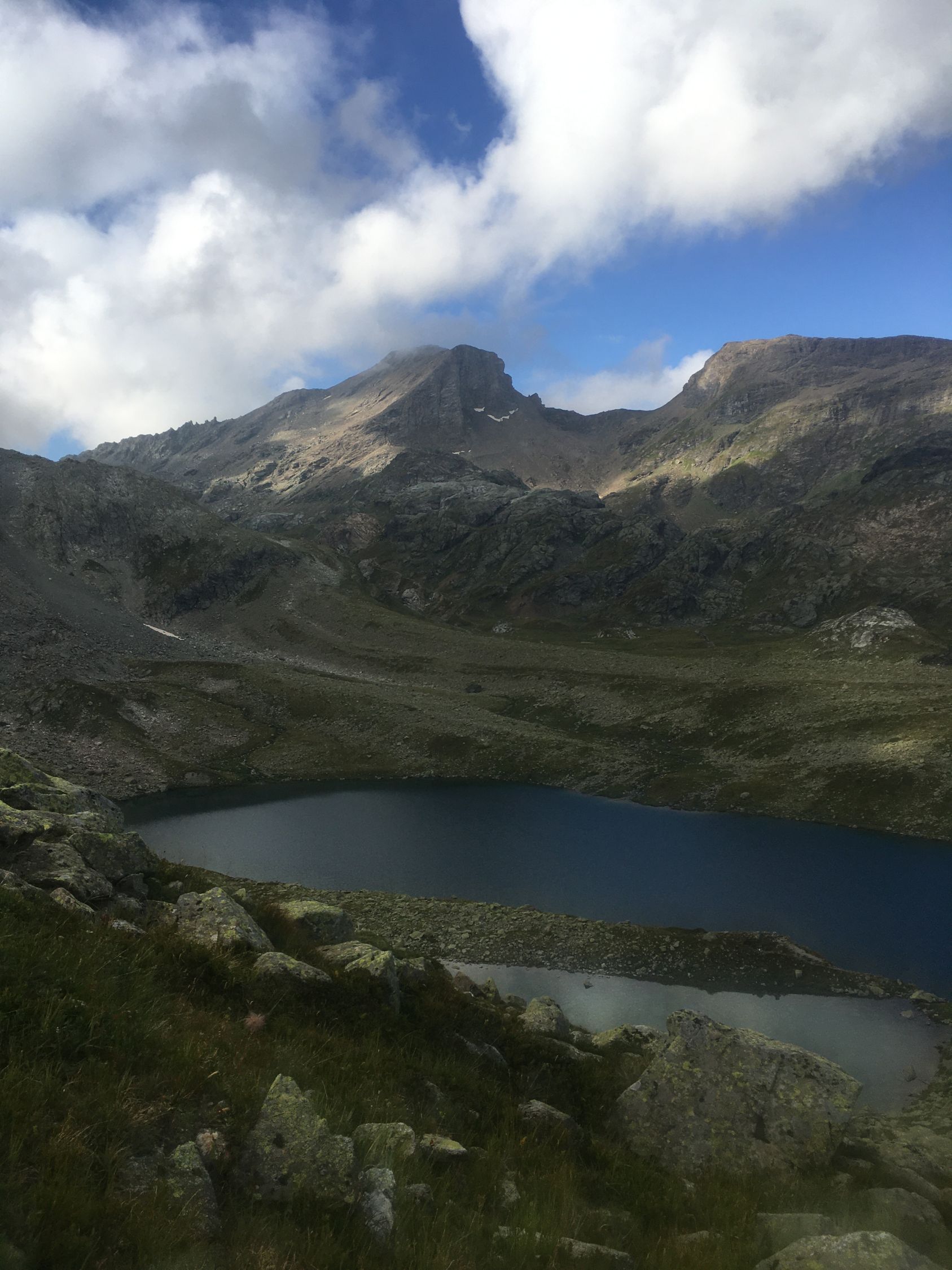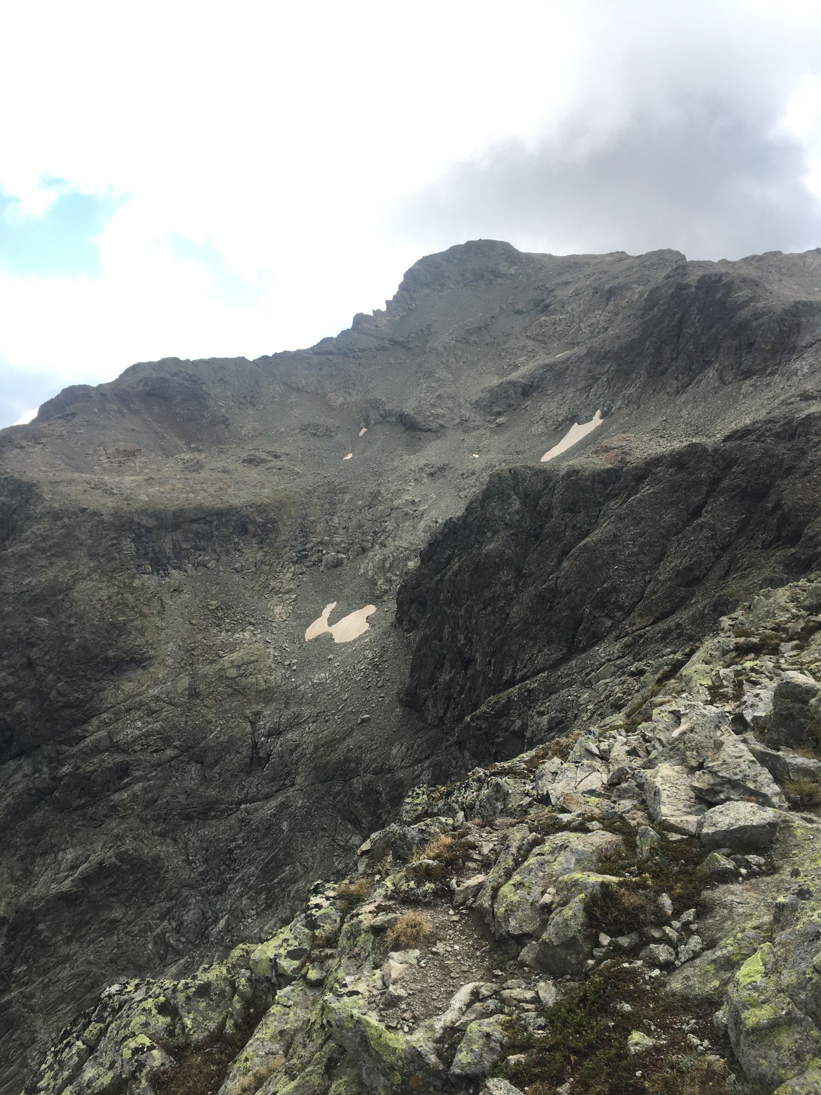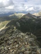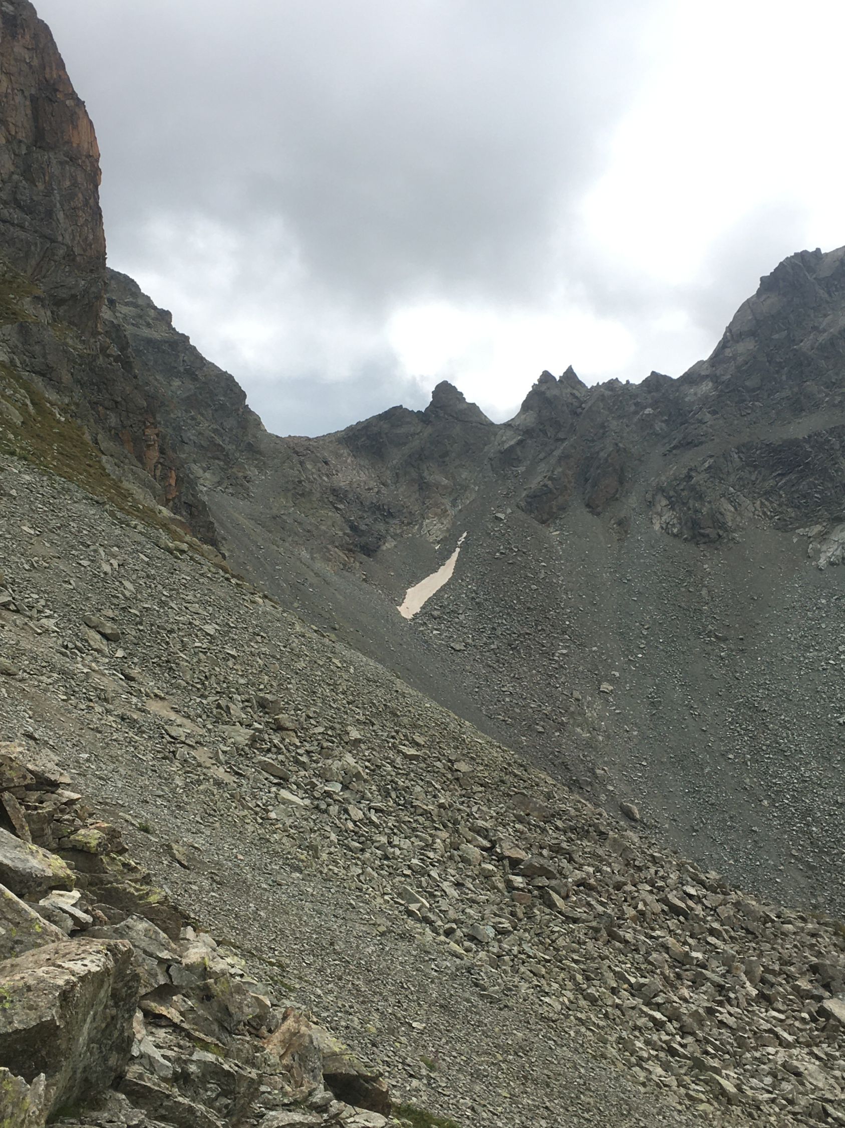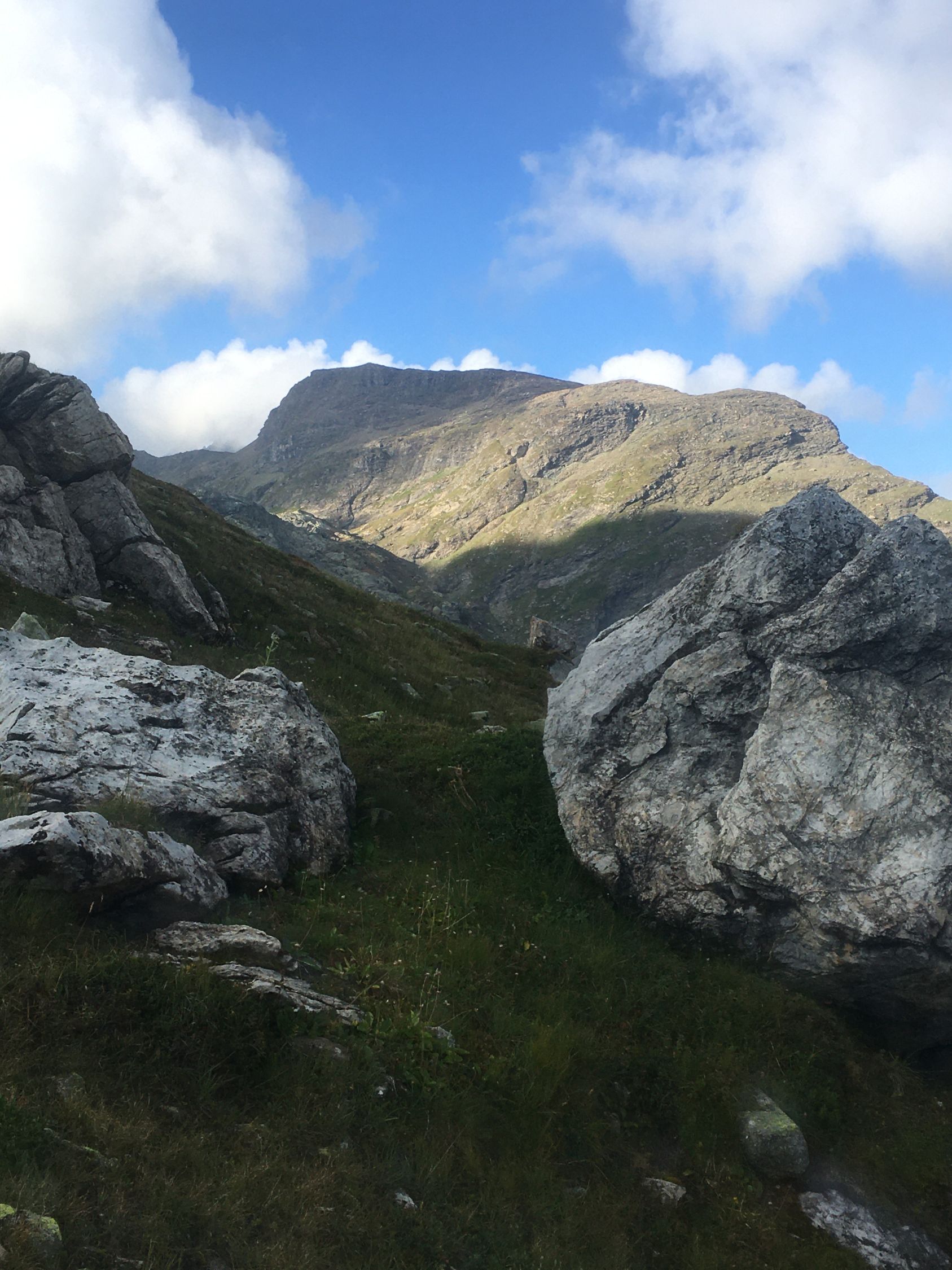 Alpine Wanderung auf den markanten, spitzigen Pfeiler oberhalb Julier Passhöhe, T4,II. Start Veduta 8.30 Uhr, 11 Grad, windstill. leicht bewölkt. Zuerst den rotweiss markierten Wanderweg hoch bis zu Punkt 2449 oberhalb Leg Grevasalvas. Nun beim markanten Felsblock ein Weglein und später weglos die Westflanke hoch und in einem Bogen Richtung Norden, eine Kletterstelle im II. Grad und hoch, teilweise Steinmännchen, bis auf das Plateau. Nun ohne Schwierigkeiten etwas runter und auf dem zuerst breiten Pfeiler, im Gipfelbereich ausgesetzt zum Punkt 2785. Abstieg wie Aufstieg.