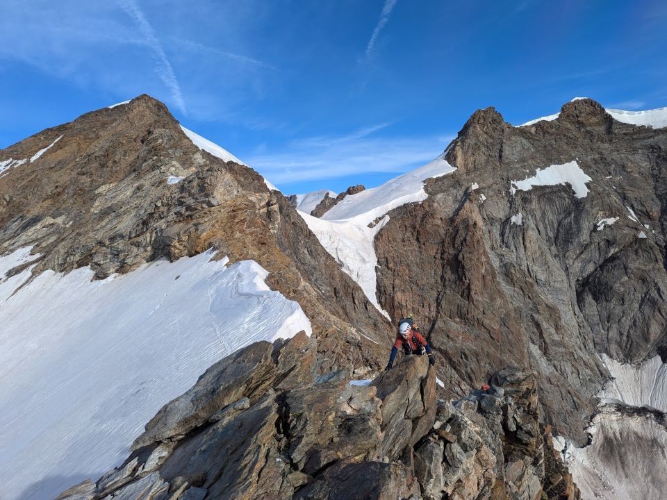 Schöne Kletterstellen bis 3. Grad, z.T. aber auch etwas Steinschlag gefährdet, v.a. im unteren Bereich am Start rechts des Grats. Grat aktuell komplett schneefrei. 3 Friends 0,5-2 und mehrere Bandschlingen zum Sichern sinnvoll. Bohrhaken gibt es nicht, lediglich Normalhaken an 2 Standplätzen. Die anderen Standplätze muss man selbst mit Bandschlingen anlegen.