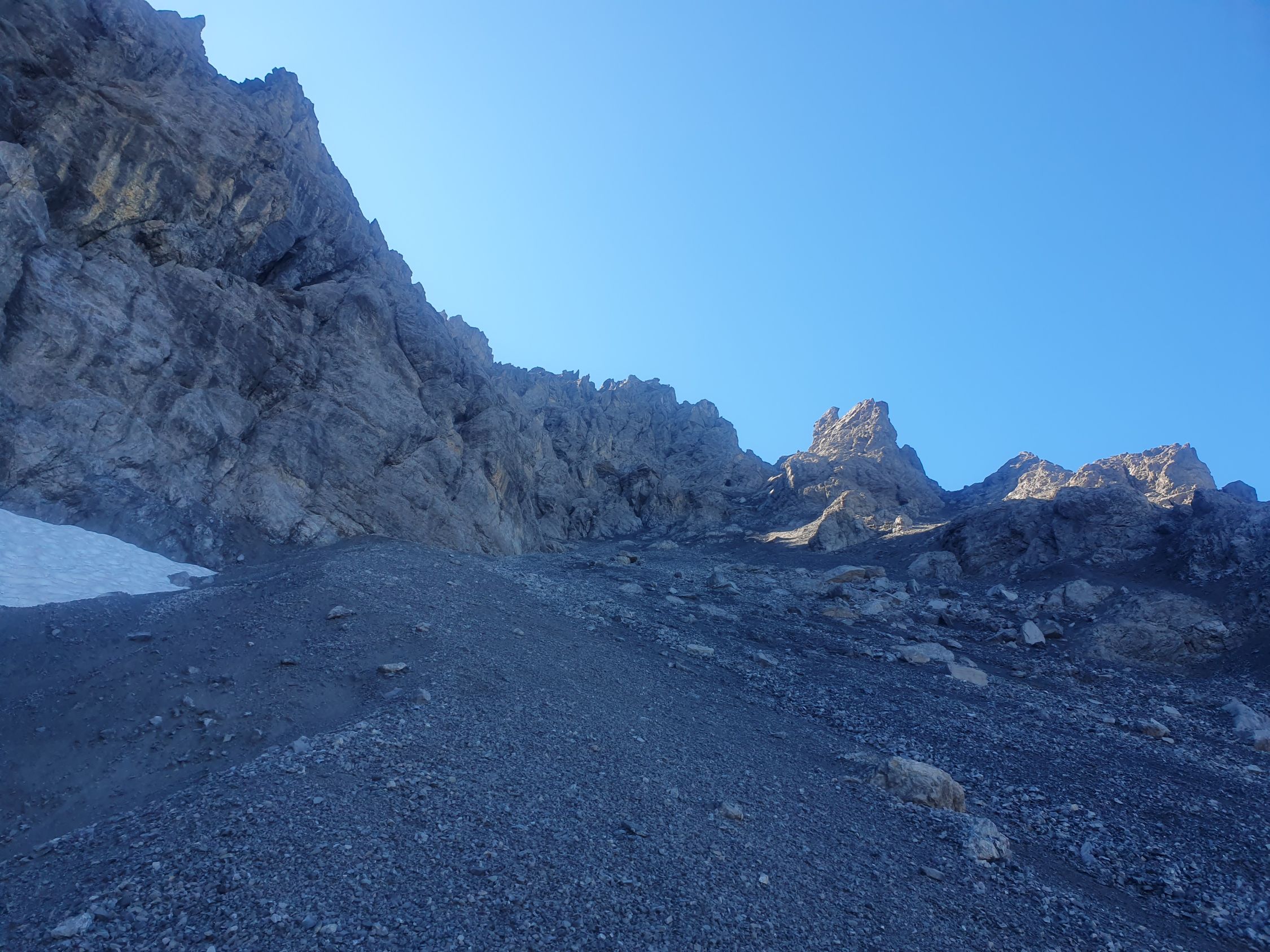 In der Schuttrinne von Norden zum Piz Nair hat es kein Schnee mehr vorhanden, ob das gut oder schlecht ist, ist geschmackssache.