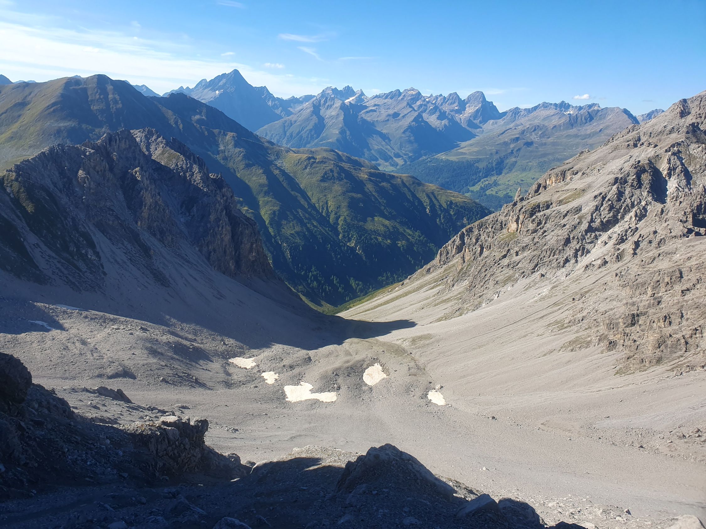 Beim Abstieg vom Satten in das Val dal Botsch zuoberst steil und unangenehm (sandig mit festen Steinen), mittig super (gutes Geröll zum rutschen) und unten mühsam (fest rollende Steine).