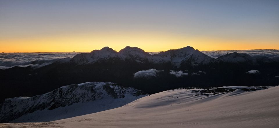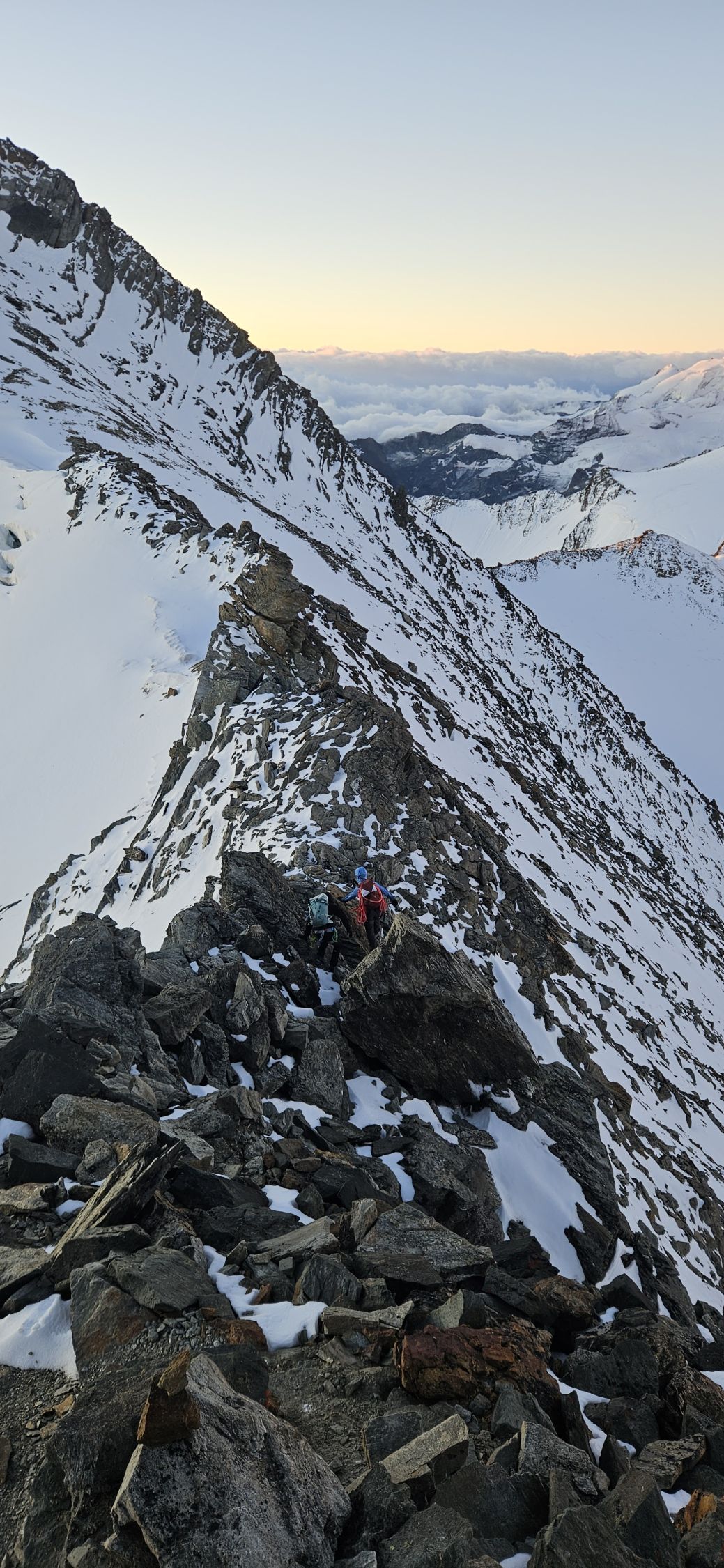 Vorwärtskommen auf dem Grat bis zum Gletscher etwas langsamer wegen des Schnees aber die Felsen selbst grossteils trocken.