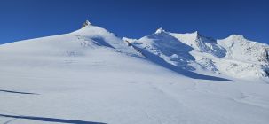 Felsen zum Gross Bigerhorn etwas eingeschneit aber gut ohne Steigeisen machbar. Firnflanke zum Balfrin NW-Gipfel in gutem Trittschnee.