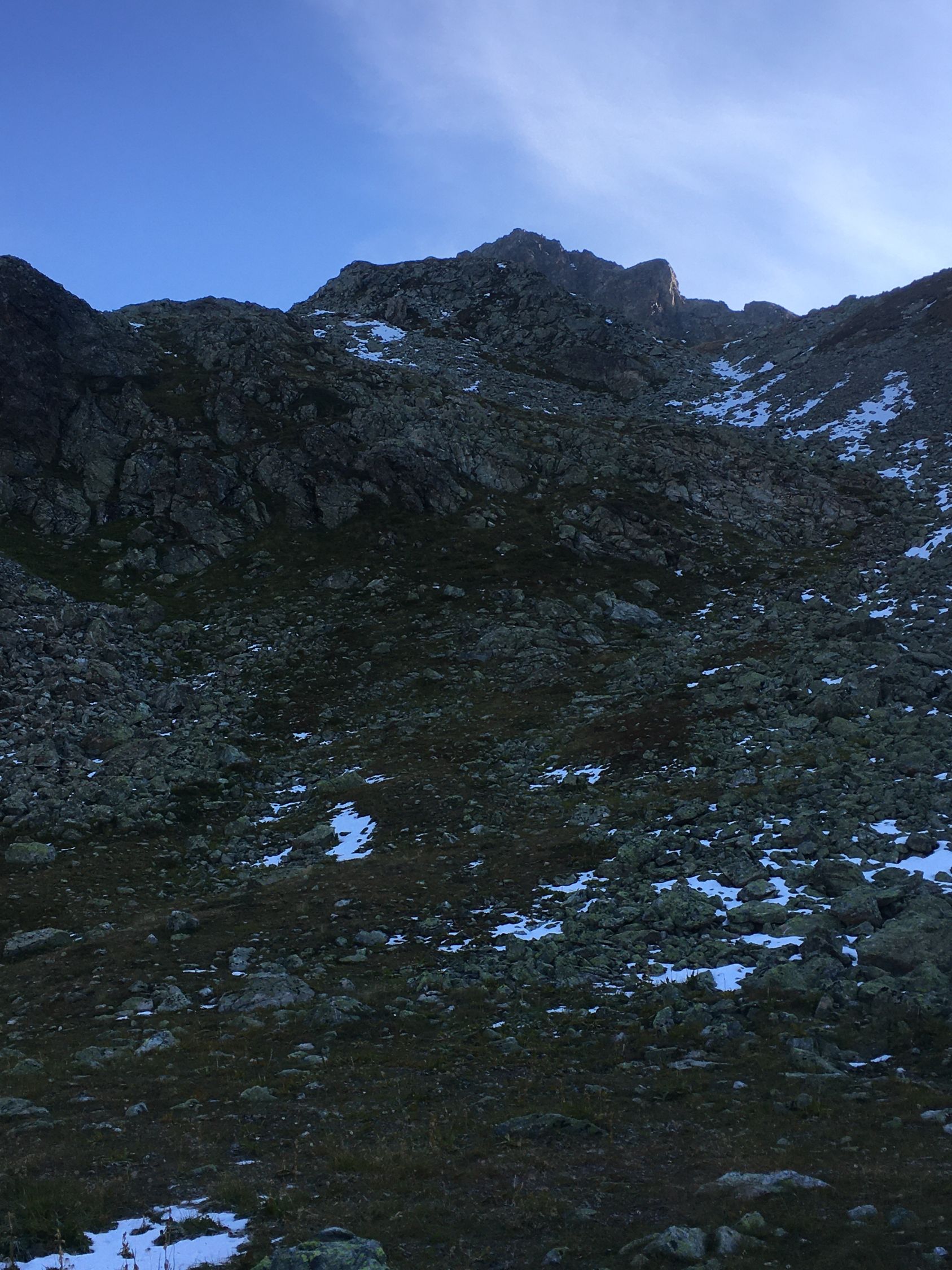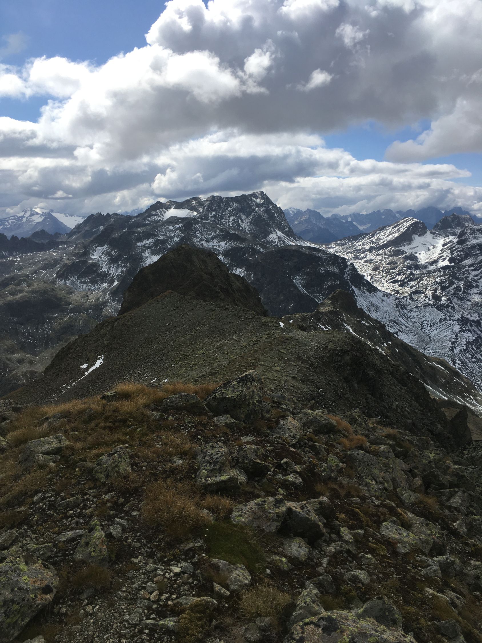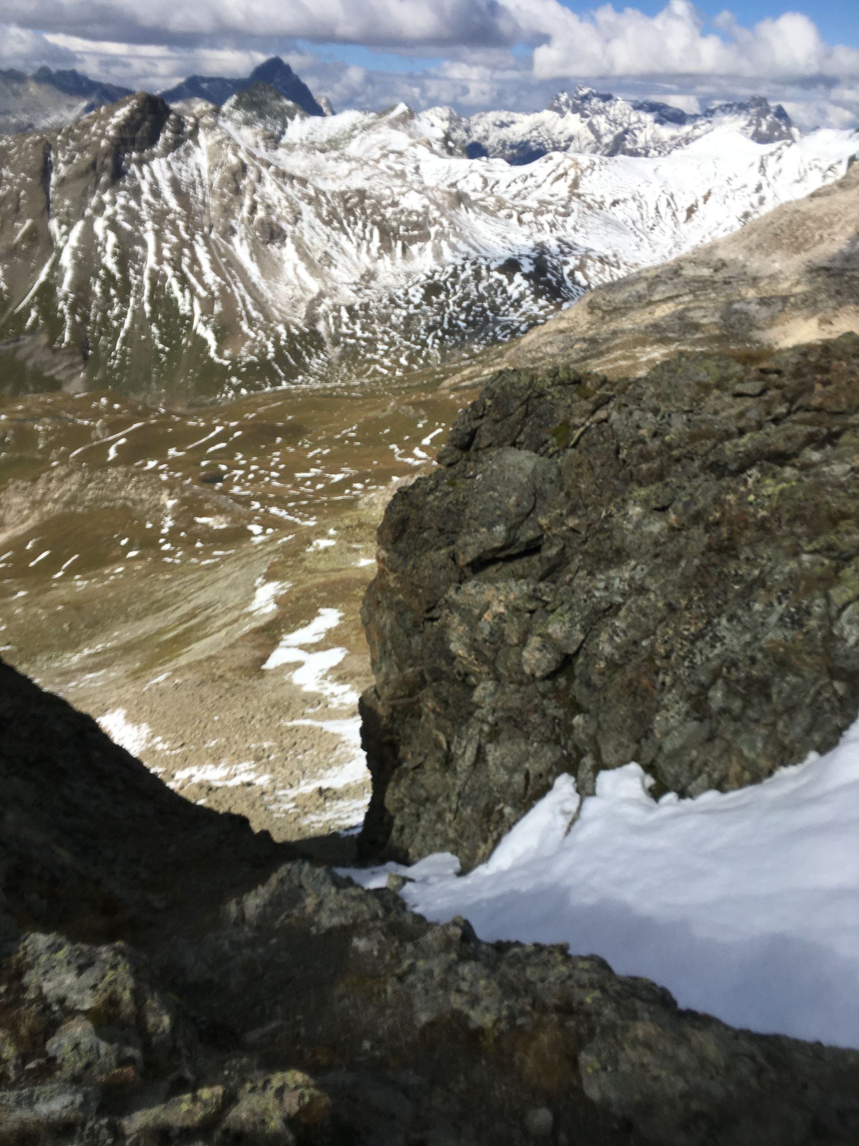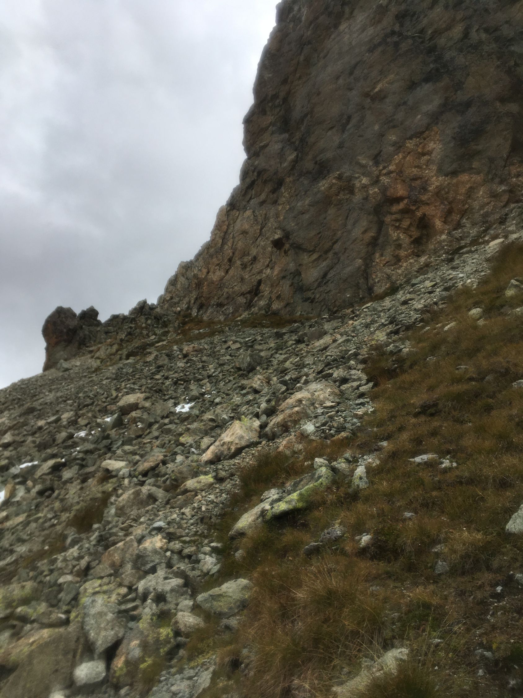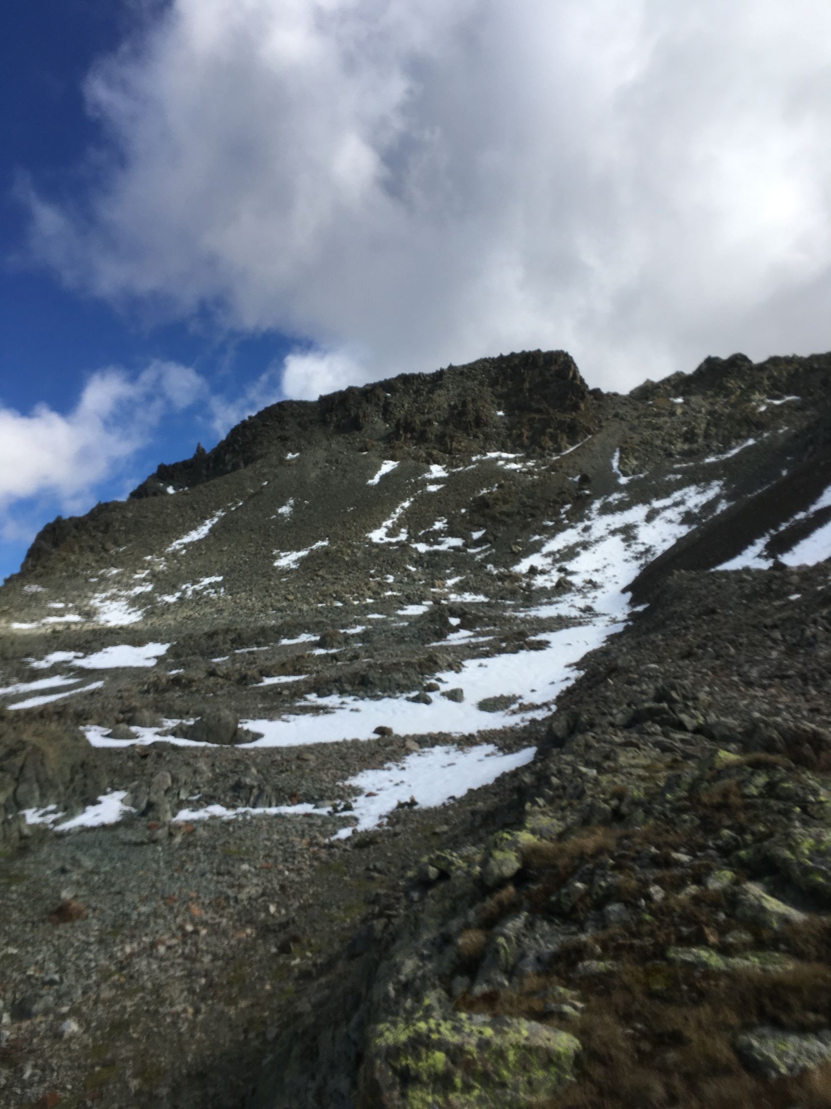 Alpine Tour auf den wenig besuchten Aussichtsgipfel gegenüber Piz Julier, T5-II. Start oberhalb La Veduta 8.20 Uhr, 2 Grad, windstill, blauer Himmel. Zuerst nicht markiertes Weglein bis Höhe 2400 m, dann weglos an Punkt 2602 vorbei und später steil zum Aufstiegscouloir Höhe 2730. Jetzt steil hoch, teilweise Kletterstellen 2. Grad und etwas Schnee bis Plateau Höhe 2800 m. Nun Richtung Nordgrat 2900 m, Traverse und über Geröll auf den Gipfel. Abstieg via erstes gerölliges Couloir, und dann Abstieg wie Aufstieg.