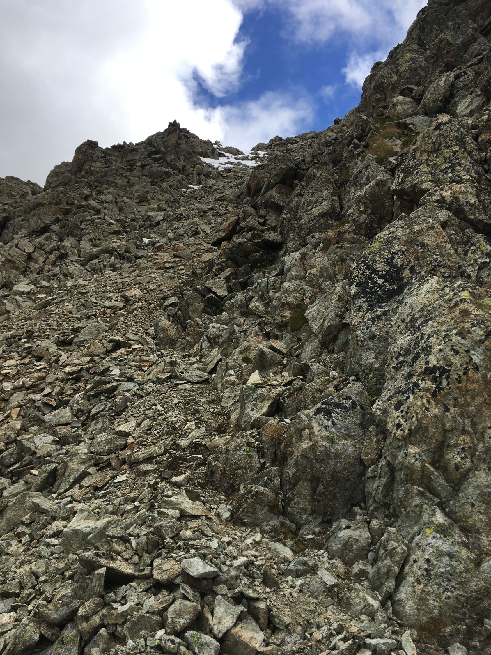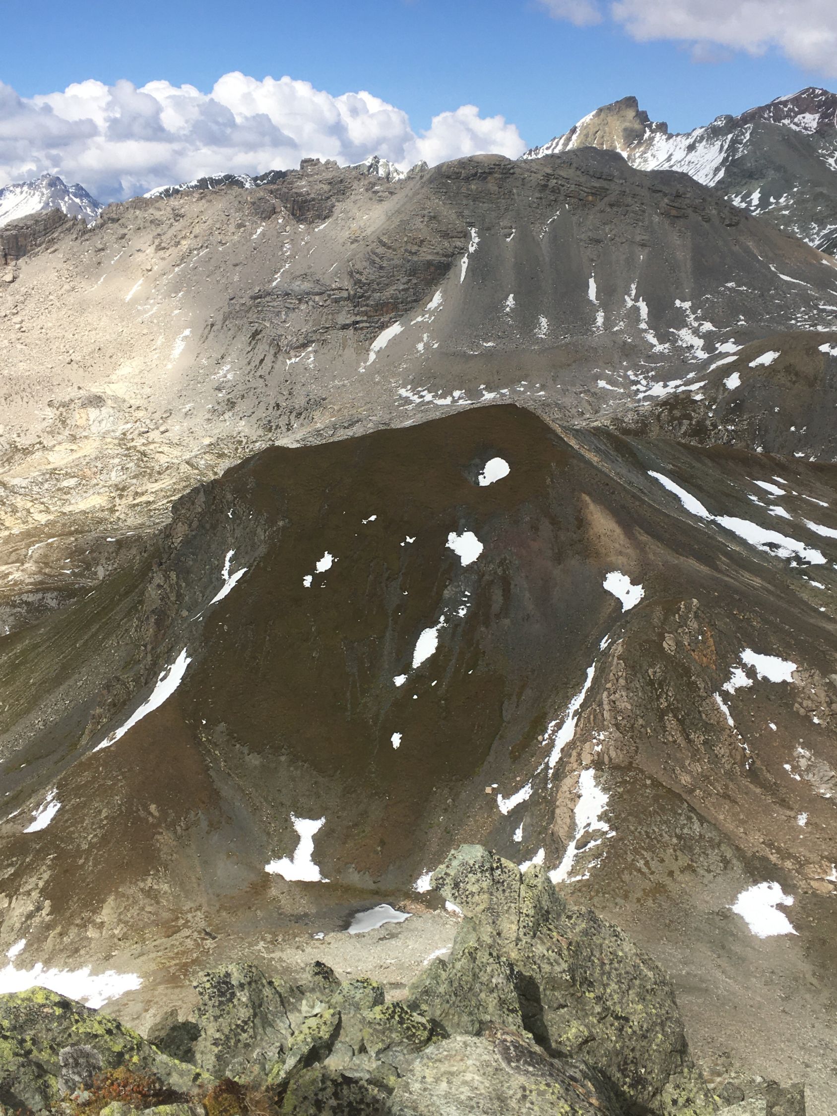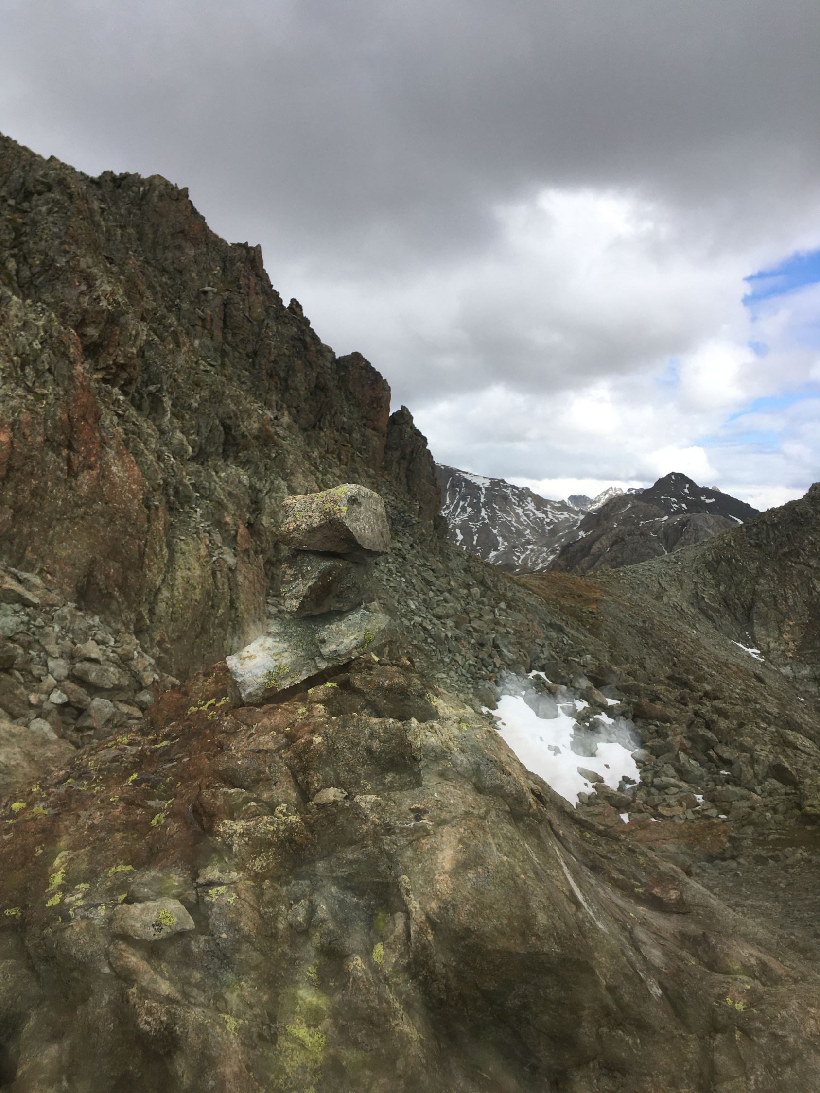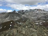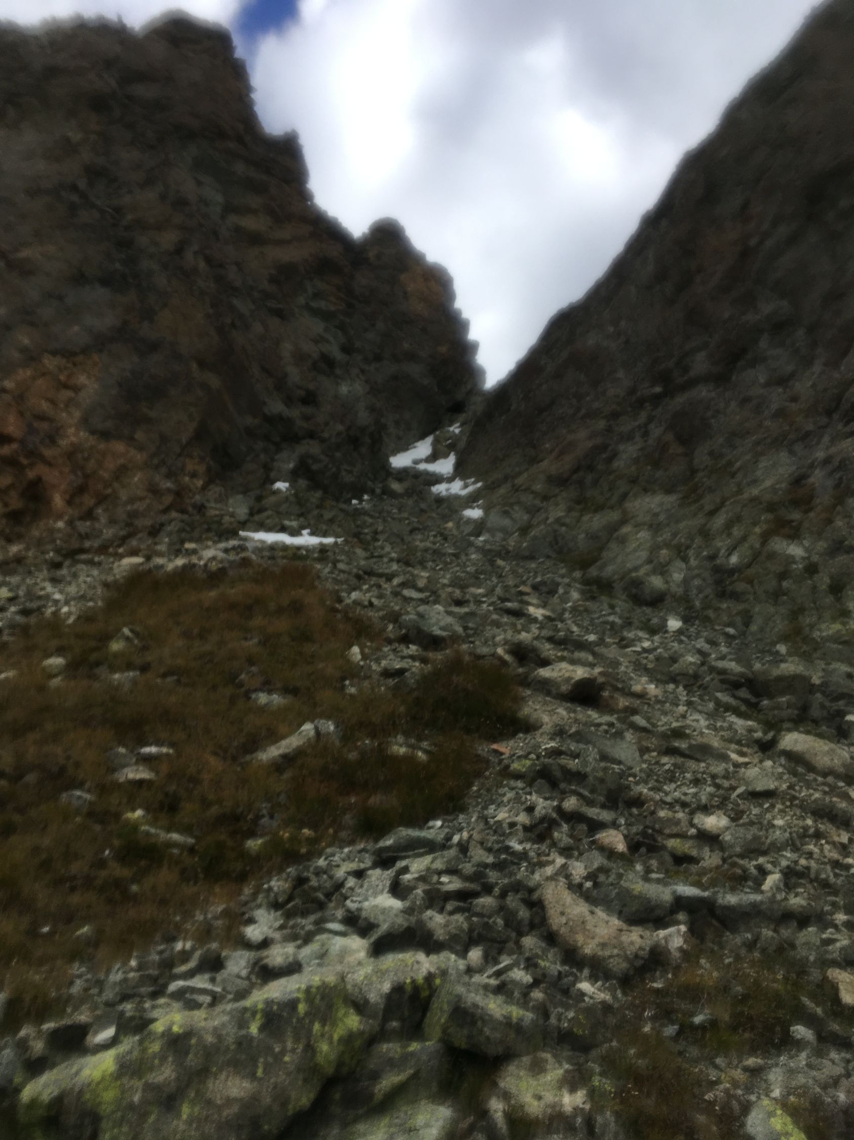 Alpine Tour auf den wenig besuchten Aussichtsgipfel gegenüber Piz Julier, T5-II. Start oberhalb La Veduta 8.20 Uhr, 2 Grad, windstill, blauer Himmel. Zuerst nicht markiertes Weglein bis Höhe 2400 m, dann weglos an Punkt 2602 vorbei und später steil zum Aufstiegscouloir Höhe 2730. Jetzt steil hoch, teilweise Kletterstellen 2. Grad und etwas Schnee bis Plateau Höhe 2800 m. Nun Richtung Nordgrat 2900 m, Traverse und über Geröll auf den Gipfel. Abstieg via erstes gerölliges Couloir, und dann Abstieg wie Aufstieg.