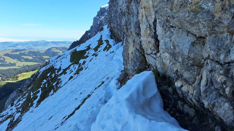 Einstieg schneefrei, ab ca. 1700m für 2/3 der Tour zuerst vereinzelt, dann grossflächige Schneefelder, z.T. bis zum 1m tiefe Schneelöcher, ab Berggasthaus Tierwis zuerst bessere Wege, dann durch Schneefelder und Schneelöcher Wege nur anhand der Spur erkennbar. Der Spur folgend Kletterabschnitte mit Benutzung beider Hände erforderlich, Himmelsleiter z.T. verschneit.