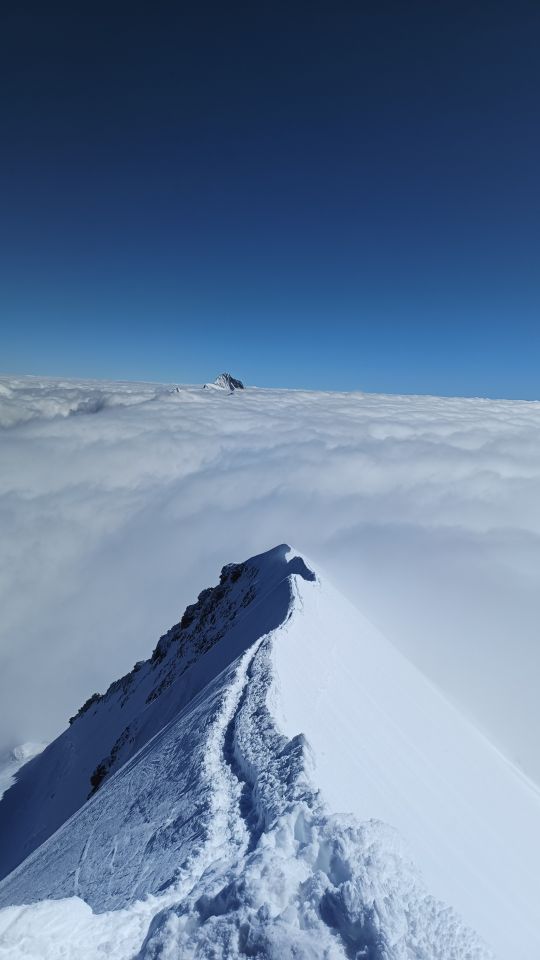 Kletterstellen sind schneefrei, die Grate mit gut gesetztem Schnee bedeckt. Meist guter Trittschnee, in der oberen Hälfte verharschend (Steigeisen nötig).
