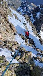 Descente enneigée et escarpée. Difficile de trouvé le chemin et les relais. On a jugé le chemin dans la neige trop dangereux. On a join notre corde avec un autre groupe pour faire 4 rappels de 50m (relais 1 et 3 sur le topo + 2 relais improvisés).