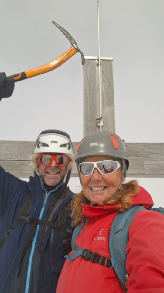 Sehr gute Verhältnisse am Piz Buin. Am Gletscher liegt Schnee und es gibt auch offene Spalten bzw. Löcher die man aktuell aber gut sieht/erkennt. Steigeisen ab Schnee/Gletscher Beginn bis zum Gipfel dran gelassen. Auch in den kurzen leichten Kletterpassagen liegt Schnee (hart)