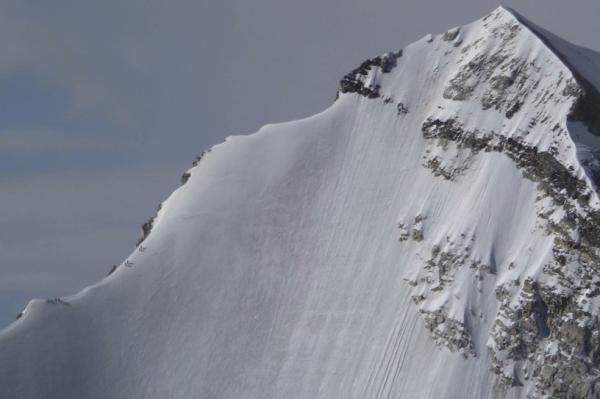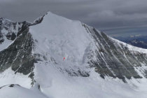 So weit wir beurteilen konnten, scheint es in der Bishorn-Nordwand noch etwas weniger Eis zu haben; dort scheint der Durchschlupf durch die Seracs heuer sehr günstig (Pfeil auf Bild 3;noch liesse sich sogar die linke Variante klettern).