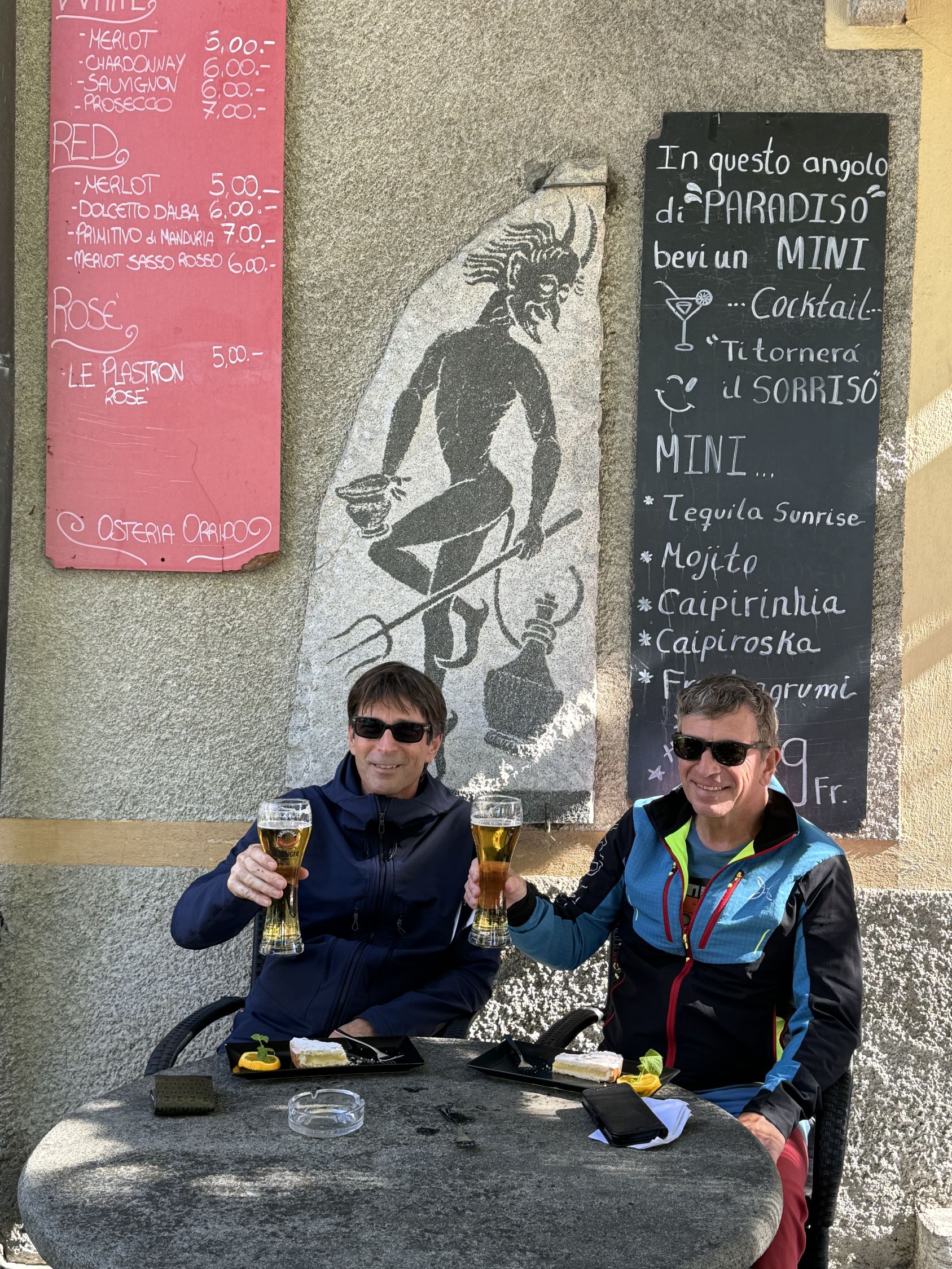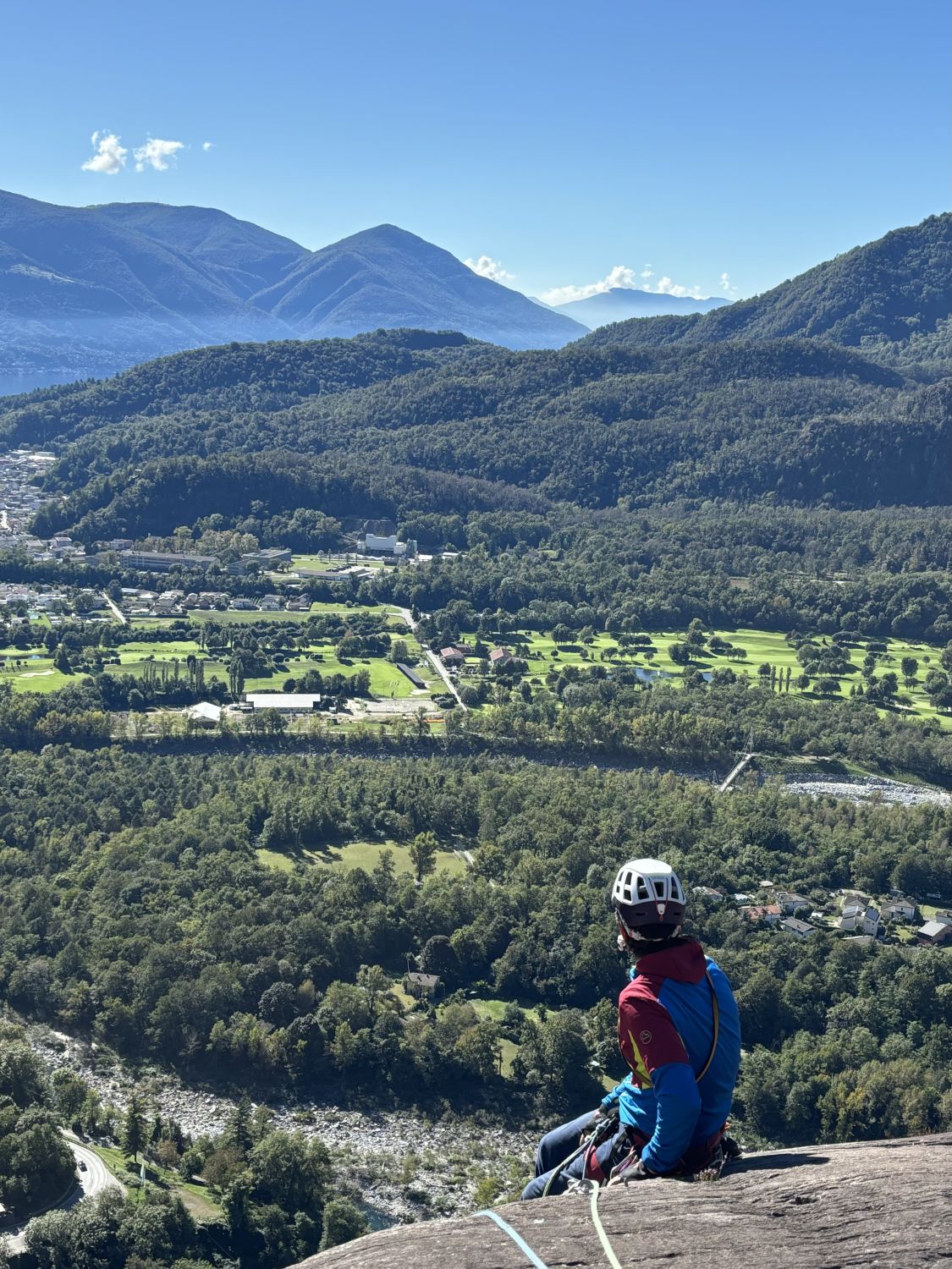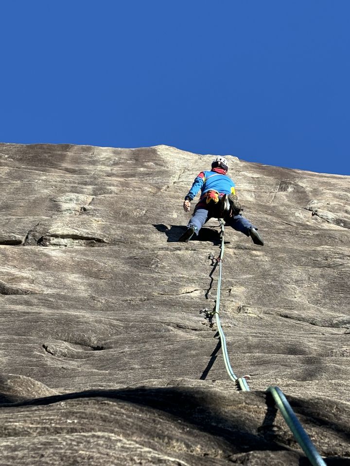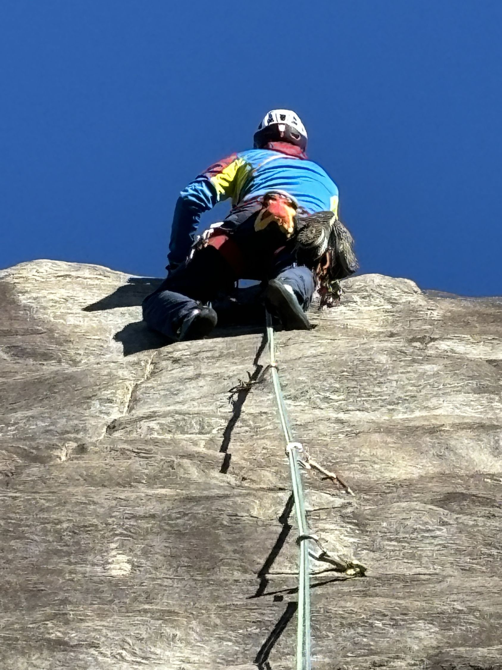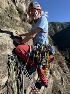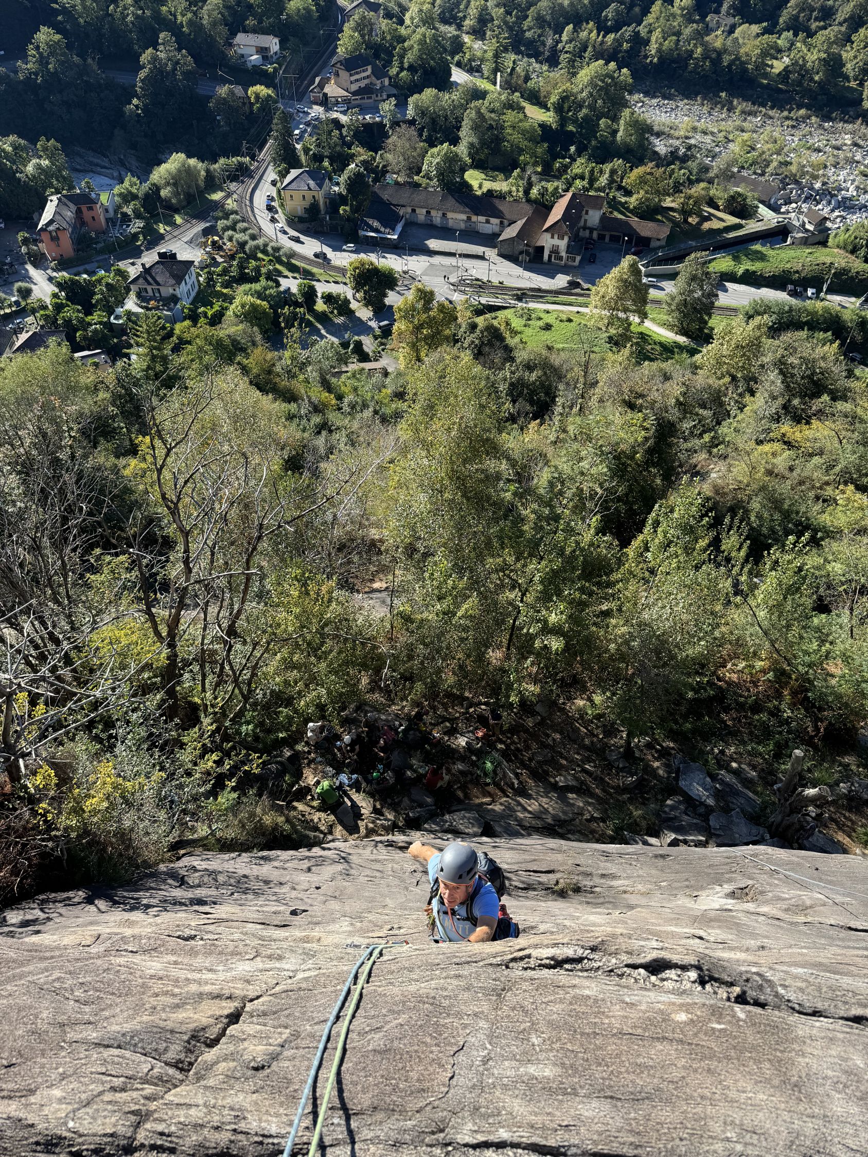 Die Route ist wirklich toll und legt nach dem 2. Jardin nochmals deutlich zu - bis 5c Tessiner Bewertung. Luftig aber herrliche Kletterei. Nach dem Ende der Route kann man 40 m gerade hoch 3 Bohrhaken zu Stand. 15 m horizontal nach rechts und dann der Ausstiegsseillänge von Wim folgend bis zum höchsten Punkt des Rovine.