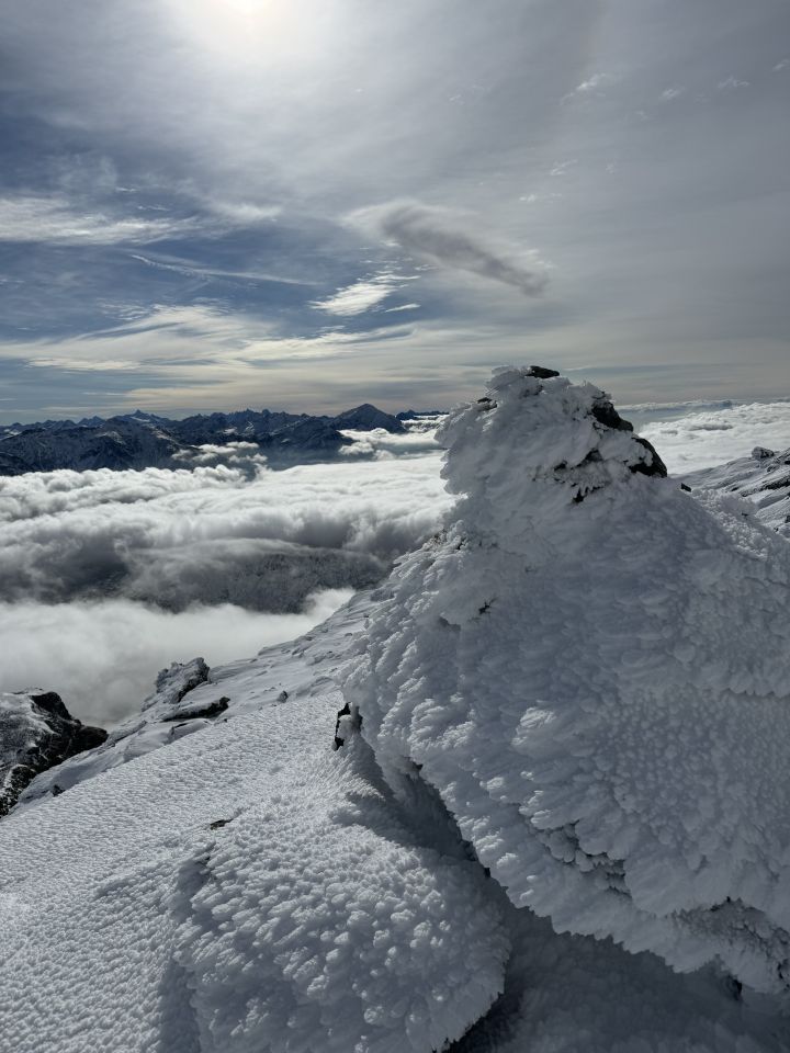 Ab circa 2000 fangt der schnee an. Steinmannen sind ziemlich gut sichtbar. Ab 3000 tiefe schnee. Umgekehrt wegen der bewölkung. Gipfelgrat hatte weniger schnee und seh gut machbar aus
