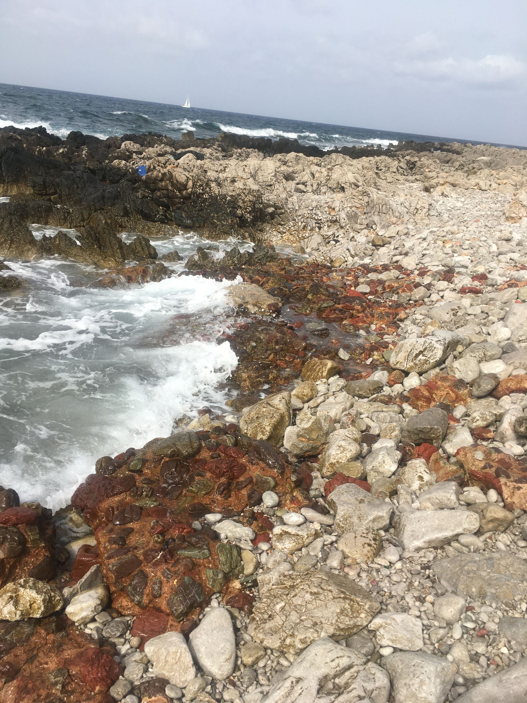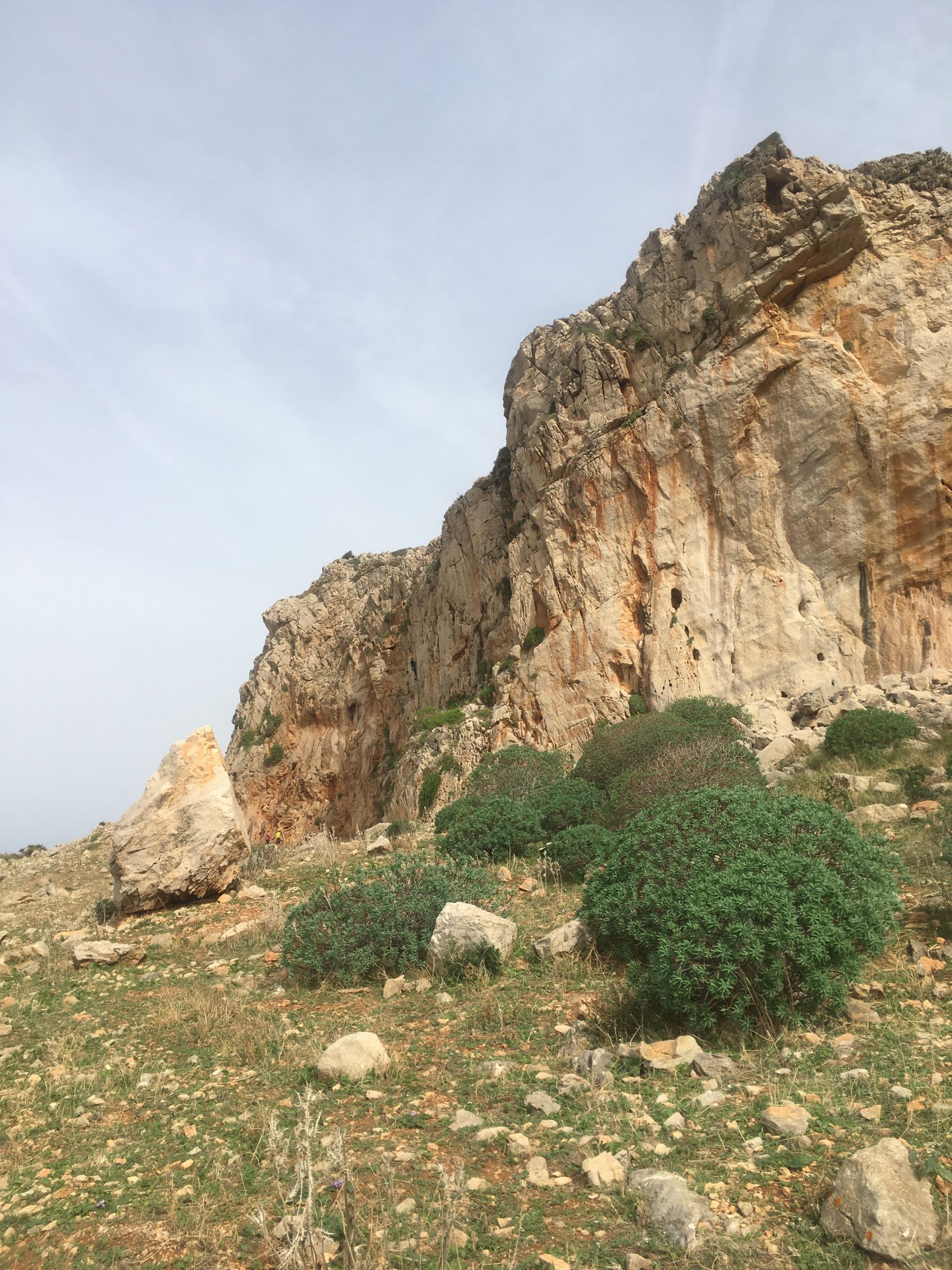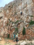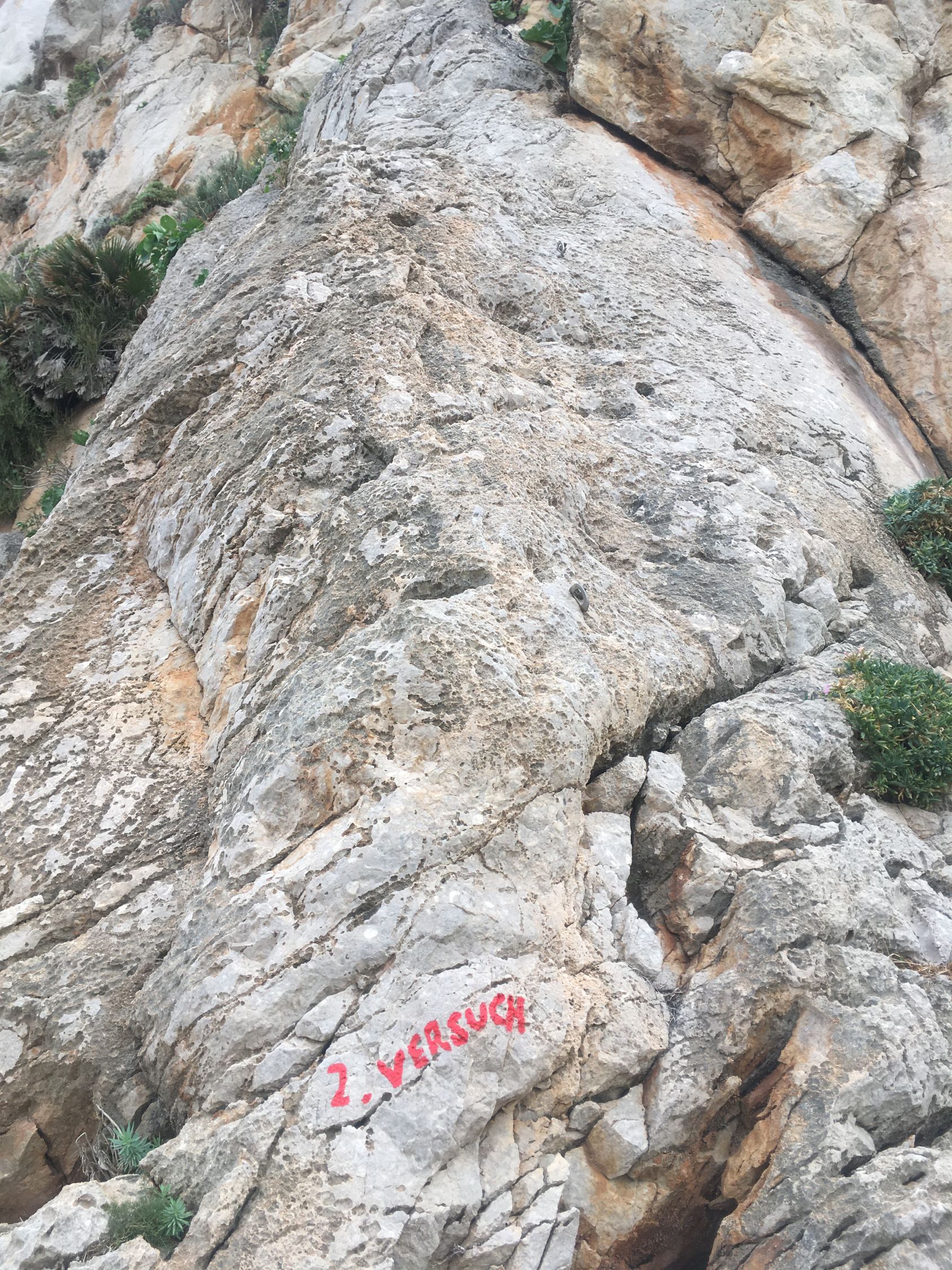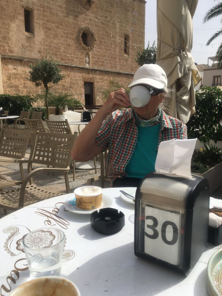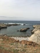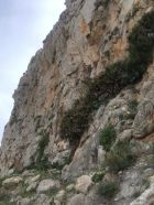 Gemütliche Wanderung an der Küste zur Badebucht und zu den Kletterfelsen, T2. Start 10.15 San Vito lo Capo Piazza Via Savoia, 28 Grad, Cirrus-Wolken. Via Hafen und nahe Friedhof zur Nordwestküste und auf Piste zur schönen Küste bis Bucht und noch etwas weiter. Blick zum Monte Cofano, zahlreiche Kletterrouten von 5 bis 7 Schwierigkeitsgrad, einige Kletterer an den Felsen, am Vormittag teilweise im Schatten. Einige Camper an der Küste.