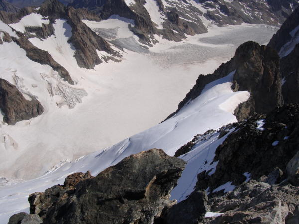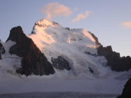 Von Ecrin-Hütte (3125m) die "kleine Überschreitung" via Ostgrat und dann Normalabstieg (Westgrat). Schlüsselstelle an Ostgrat ist ca. 20m hoher Kamin (III+) der leicht vereist ist. Insgesamt drei Haken und dann Schlingen am Ausstieg zur Sicherung (einfach mit etwas Mut "rein und durch").