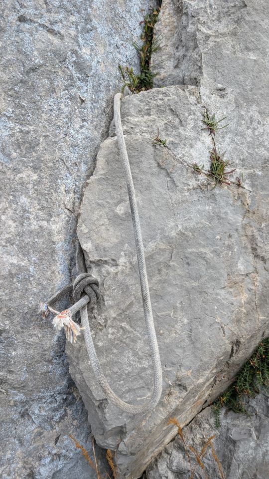 Klettertour selbst eher alpin als Plaisir, aber an den wichtigen Stellen immer gut abgesichert. Die Route würde es vertragen, von oben nach unten geputzt zu werden und braucht neue Schlingen an den Ständen. Wir haben allerdings aufgrund von Kletternden unter uns darauf verzichtet, loses Gestein auszuräumen.