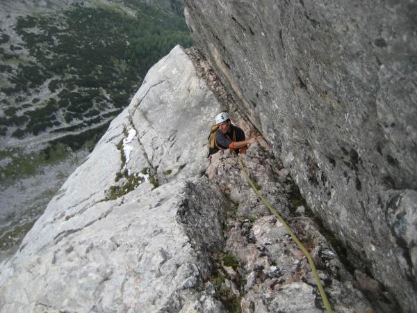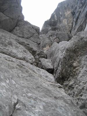Enge Risse und Verschneidungen die abdrängen machen das klettern mit Rucksack nicht immer zum Vergnügen. Event. pro Seilschaft nur einen Rucksack mitnehmen. So ist es für den Vorsteiger ein bissl leichter...