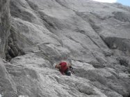 Alpine Route. Stände gebohrt und nur wenige gebohrte Zwischenhaken. Einige NH stecken in historischer Qualität in der Route! Klemmkeile, Cams und Schlingen mitnehmen. 50 m Seil reicht.