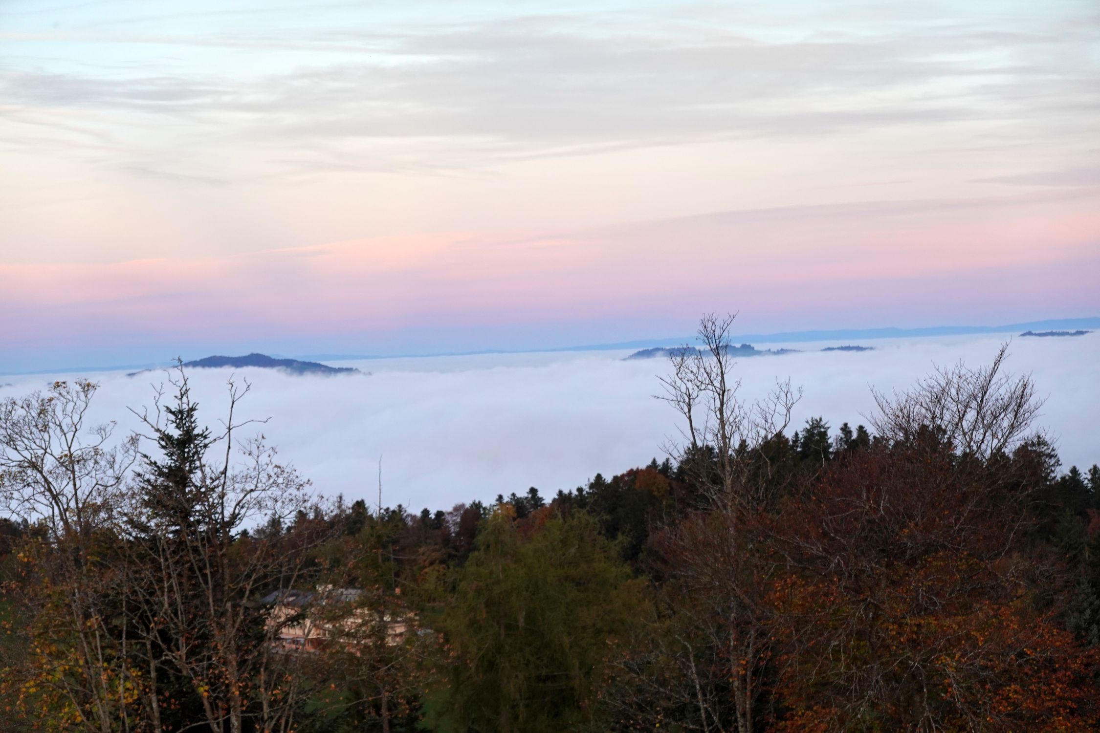 Ein Gedanke: Seit Jahren kann ich beobachten, wie die Bäume um den Aussichtsturm schön wachsen und das Panorama kleiner wird.. Weil Bäume genau das tun was Bäume machen, also sie wachsen unverdrossen und das Panorama ist immer dasselbe, so muss man ringsum Panorama - Scheiben aussuchen und fotografieren. Es hat genügend davon.
