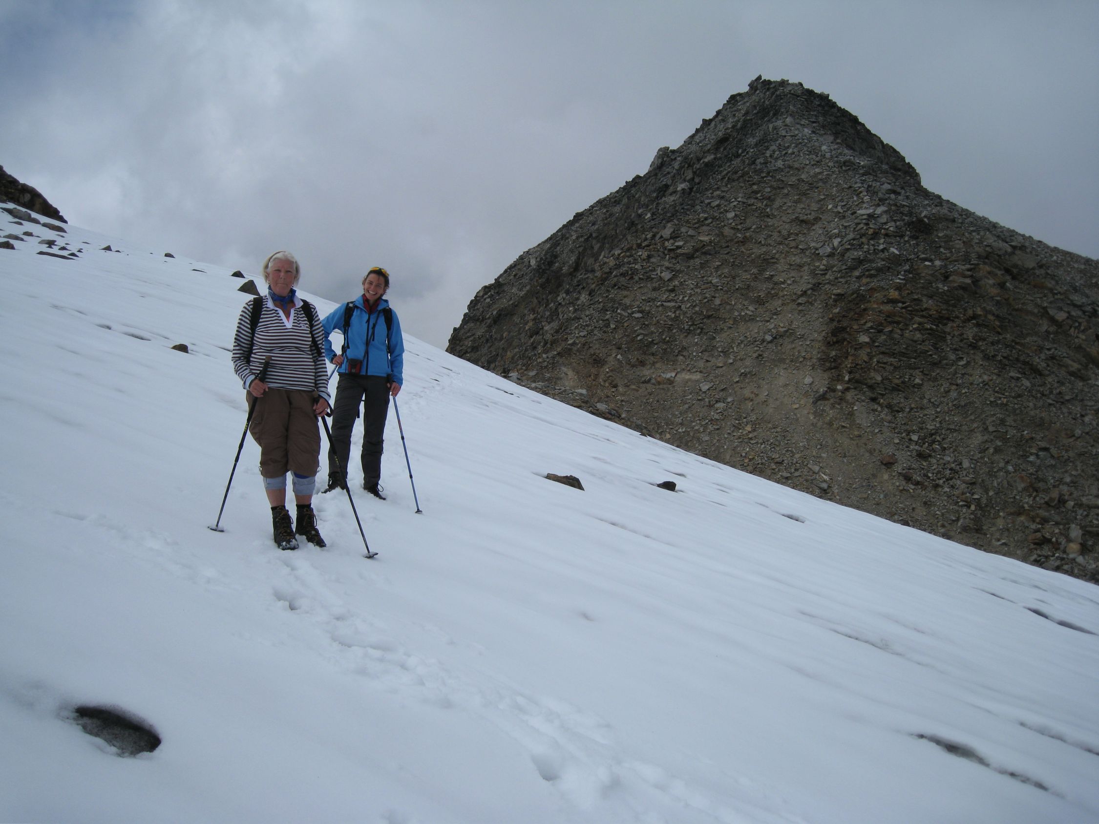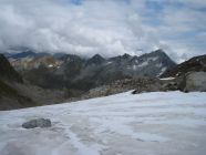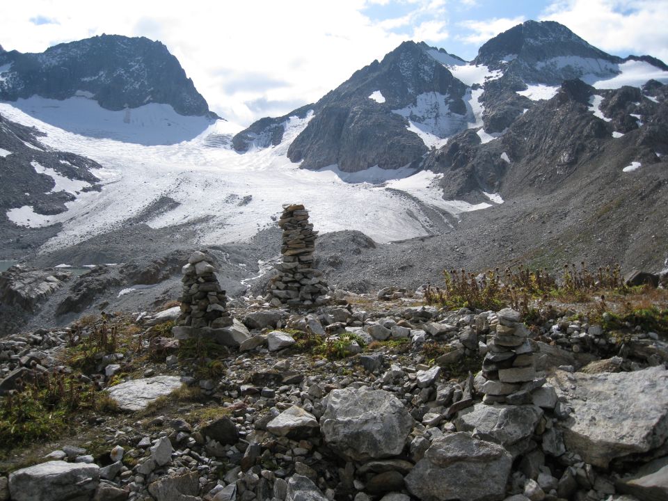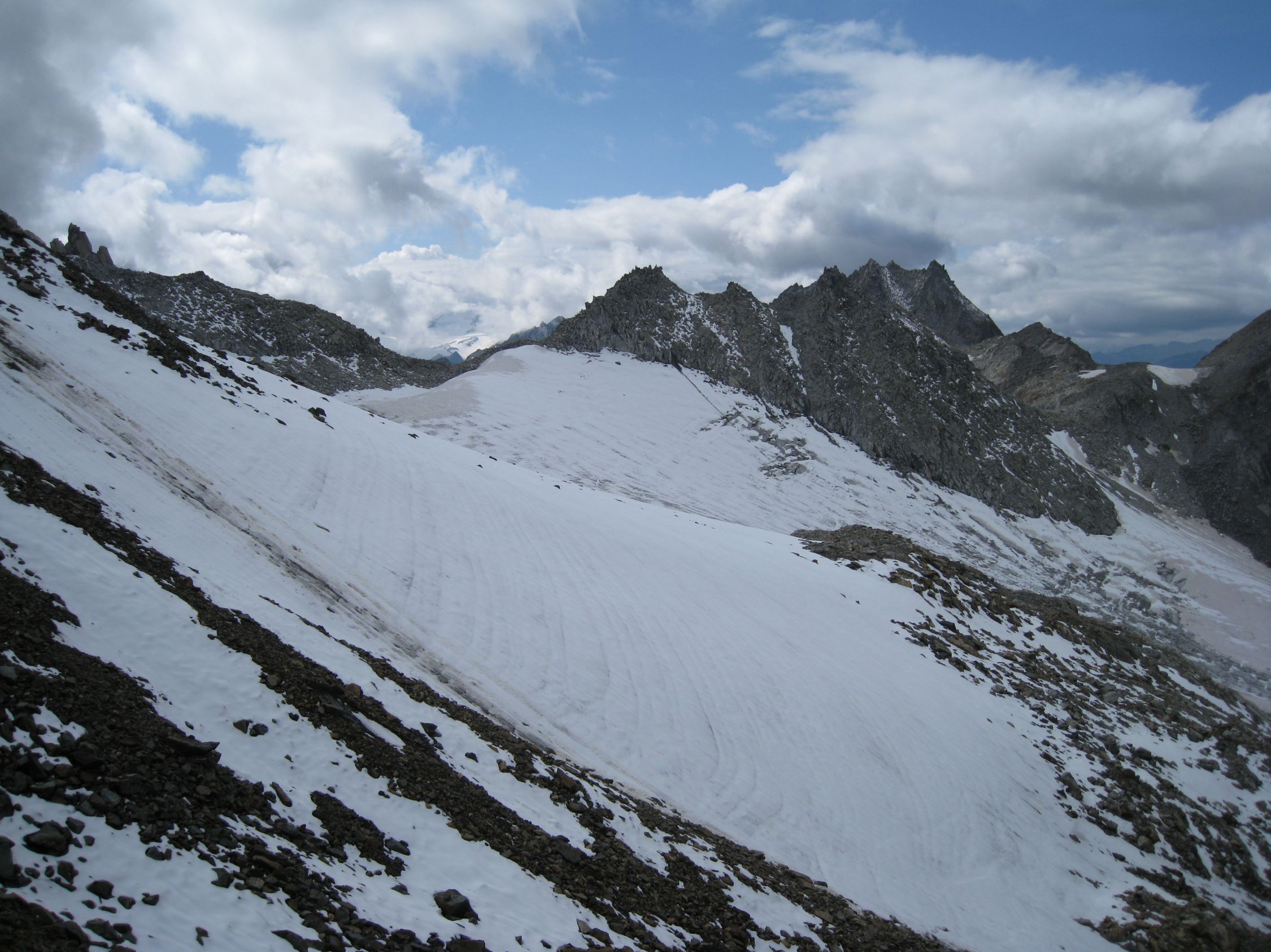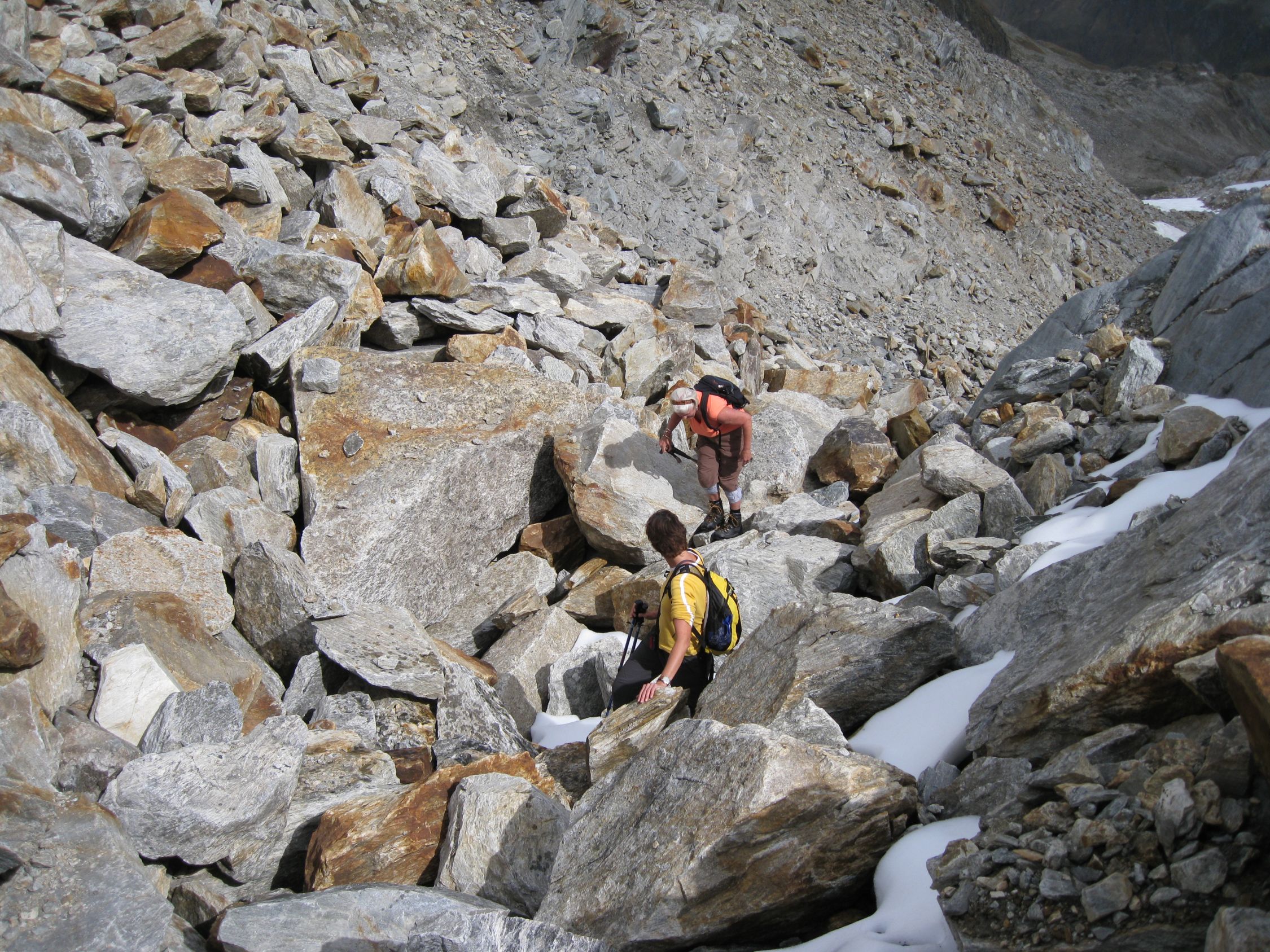 Nachmittag-Wanderung im Rotondogebiet. Vom Oberstafel an der Rotondohütte vorbei Richtung Gross Leckihorn. Auf den Firnfeldern unter dem Rottällihorn durch in das enge Felsbrocken übersäte Couloir das zum Leckipass führt. Kurzer Besuch in der Alaskabar. Im Abstieg auf den Wittenwasserenfirn angestiegen und über diesen zurück zur Ebene bei den ersten Firnfeldern. In der Rotondohütte bei Christoph und Evi eingekehrt und auf der neuen Panorama Terrasse Batterien aufgeladen. Auf dem Wanderweg am Gletschersee (Sumpf) vorbei zum Oberstafel zurück .