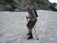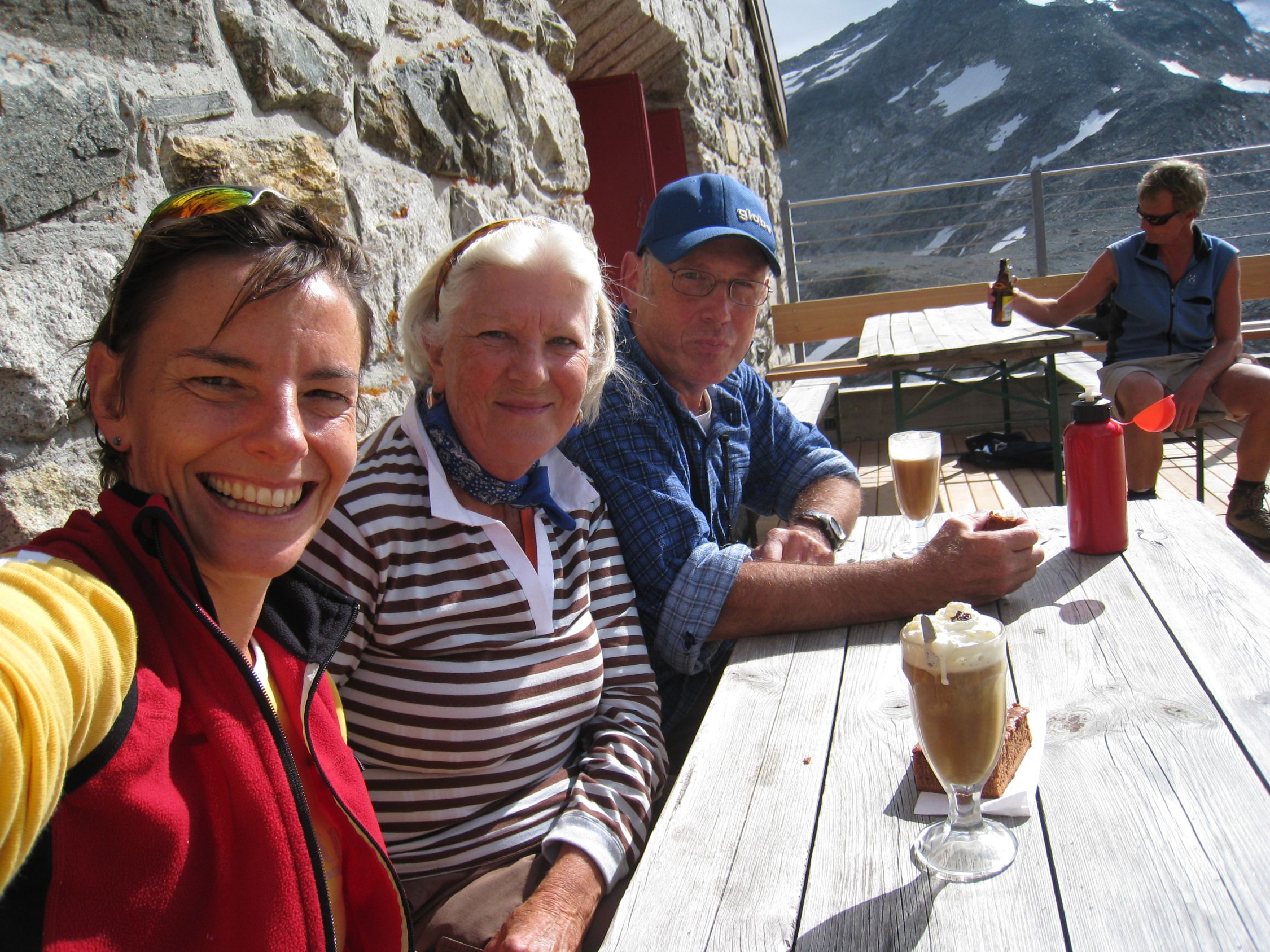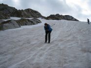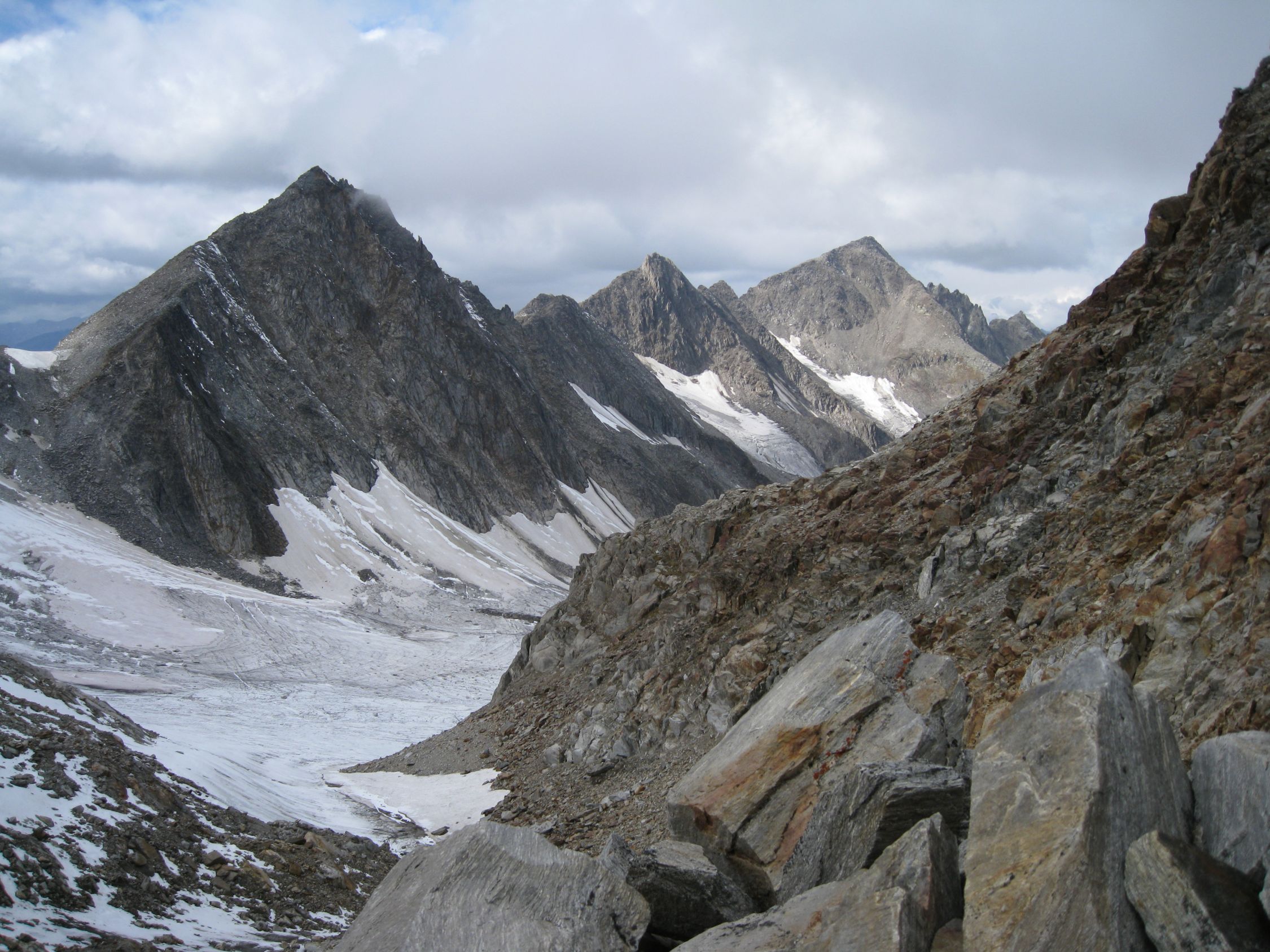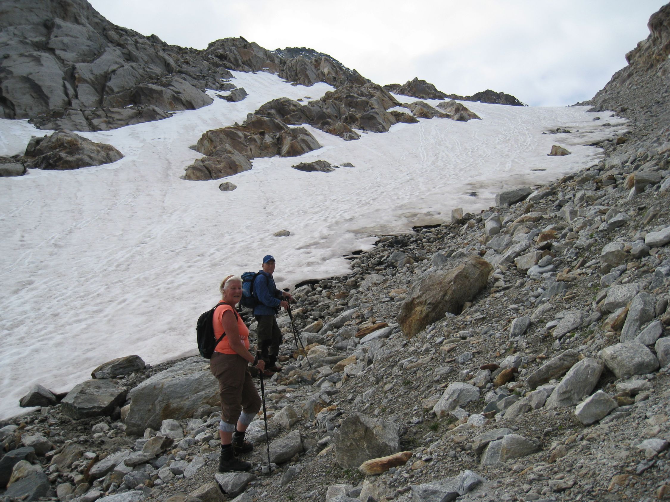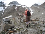 Nachmittag-Wanderung im Rotondogebiet. Vom Oberstafel an der Rotondohütte vorbei Richtung Gross Leckihorn. Auf den Firnfeldern unter dem Rottällihorn durch in das enge Felsbrocken übersäte Couloir das zum Leckipass führt. Kurzer Besuch in der Alaskabar. Im Abstieg auf den Wittenwasserenfirn angestiegen und über diesen zurück zur Ebene bei den ersten Firnfeldern. In der Rotondohütte bei Christoph und Evi eingekehrt und auf der neuen Panorama Terrasse Batterien aufgeladen. Auf dem Wanderweg am Gletschersee (Sumpf) vorbei zum Oberstafel zurück .